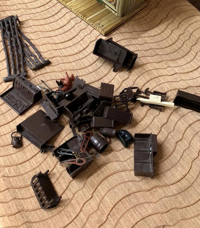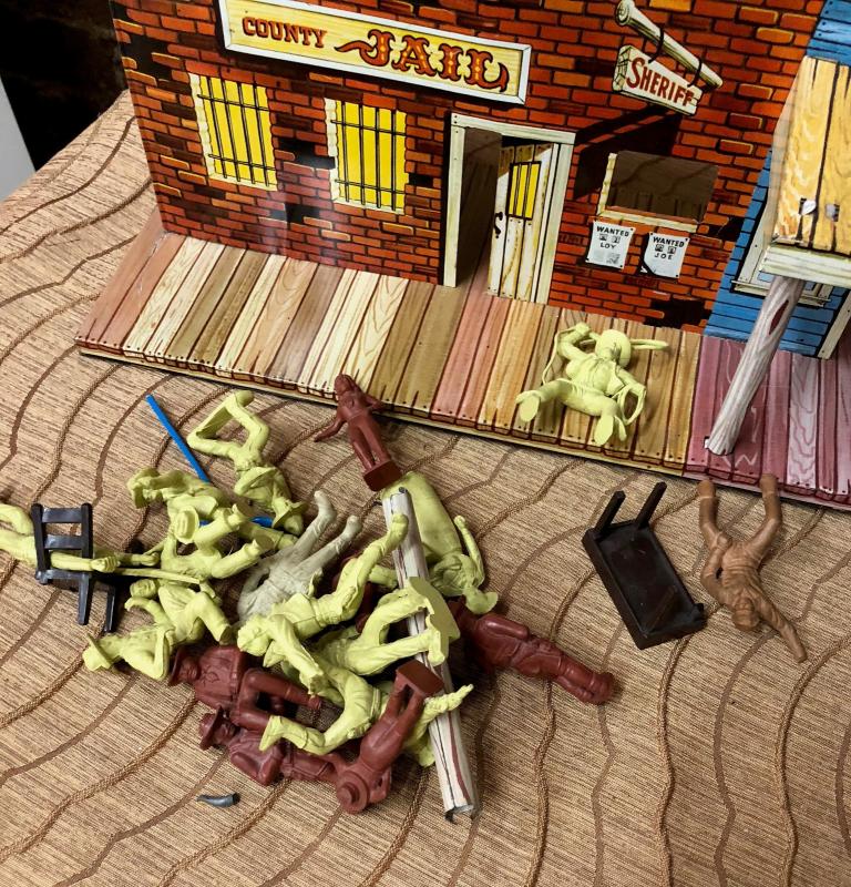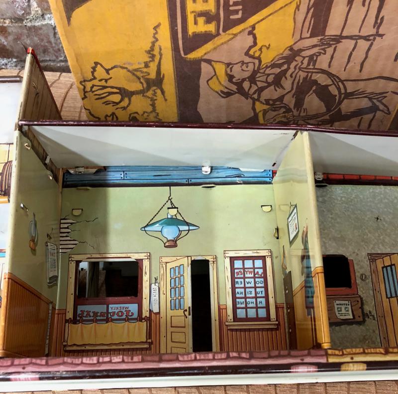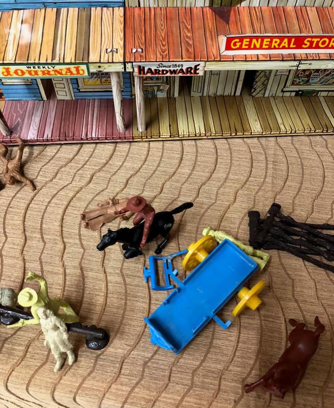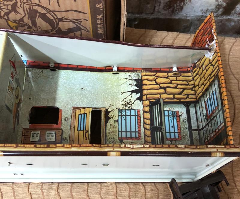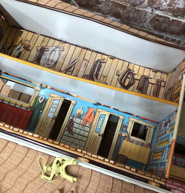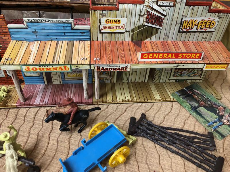 In the original box here is a vintage Western Town Playset from Marx Toys...Tin litho town front with all of the figures and accessories shown..Most of the original count..a few with damage..some slight deformation on roof of set...Circa 1950's on this classic toy...