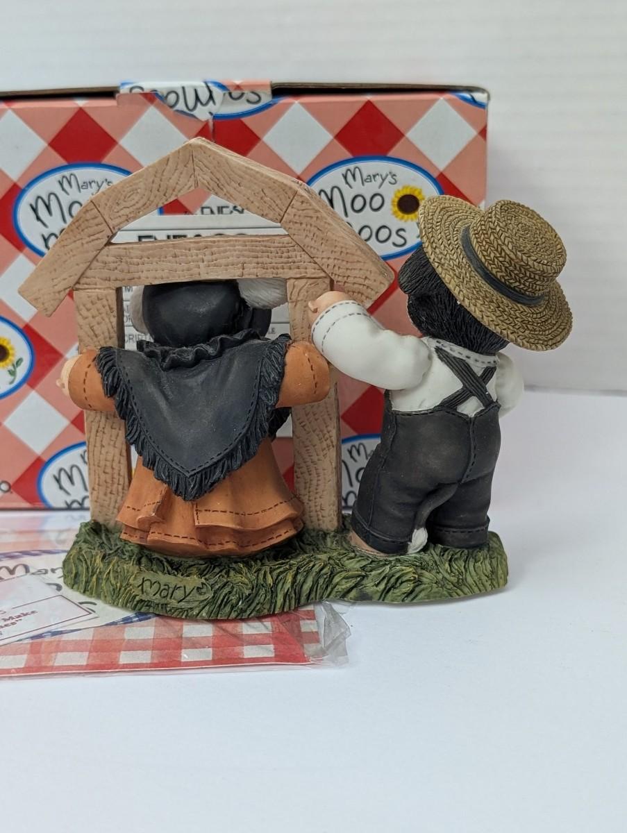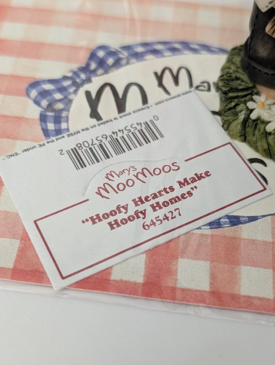 Build a beautiful collection with this sweet Mary's Moo Moos figurine, titled "Mooly Hearts Make Homes"! This charming piece features a loving cow couple working together. A male cow in a straw hat and overalls holds a hammer while his female companion peeks out from a wooden house frame. The detail is lovely, from the small flowers on the grassy base to the expressions on their faces. This figurine is in excellent condition and comes with its original box and paper tag, making it a perfect addition for any collector or a wonderful housewarming gift.