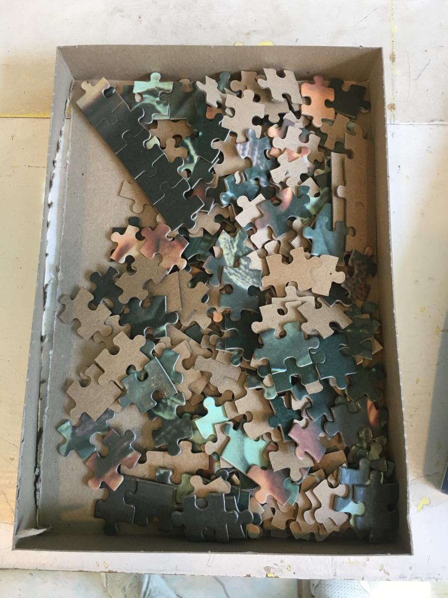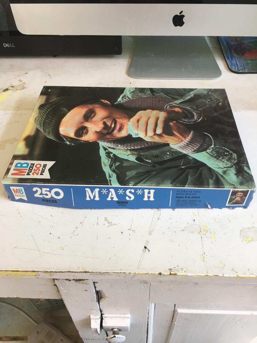 Vintage MASH complete jigsaw puzzle Hawkeye 250 piece series 4198-5 pre-owned. Box is tattered along edges and detached on one side as shown in photos. Perfect for any fan of the TV series Mash.