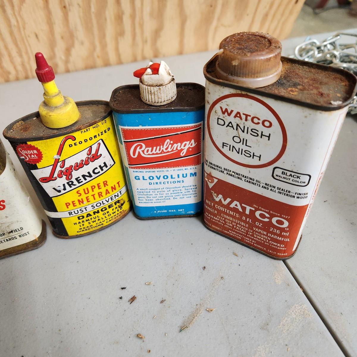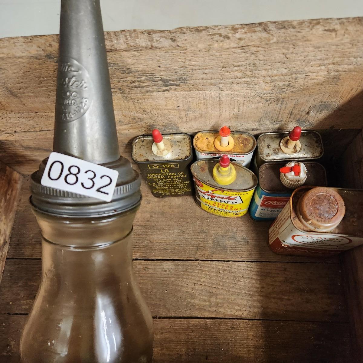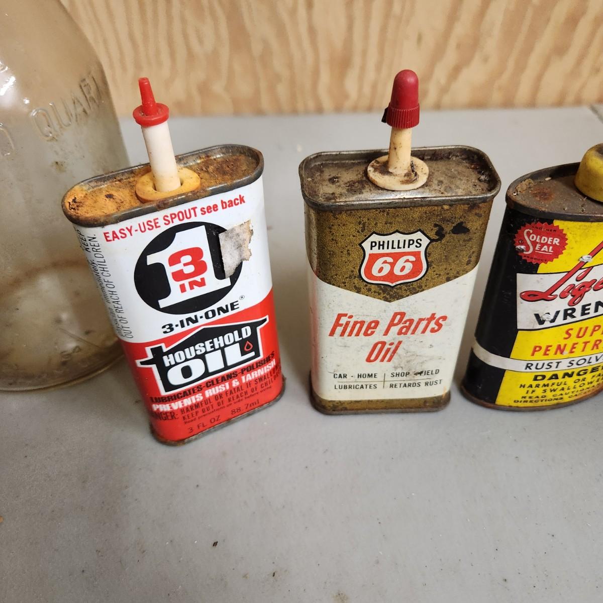 Vintage Master Glass Oil Bottle & Oil Cans 3 in 1, Philips 66, Rawlings Glove oil Watco Danish Oil