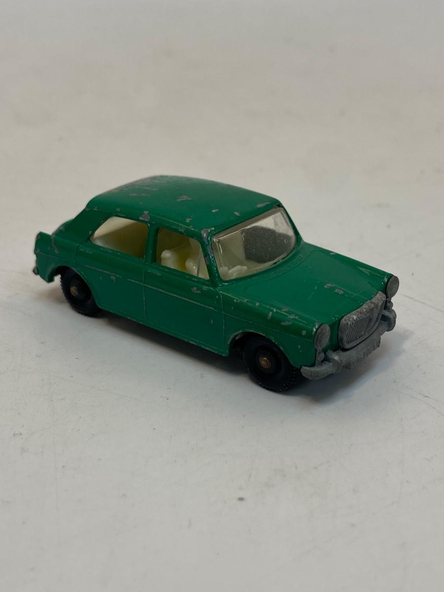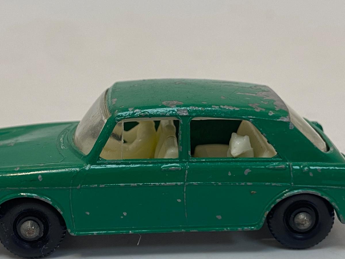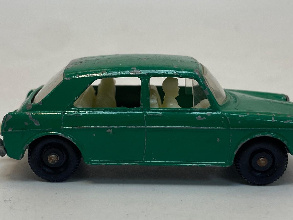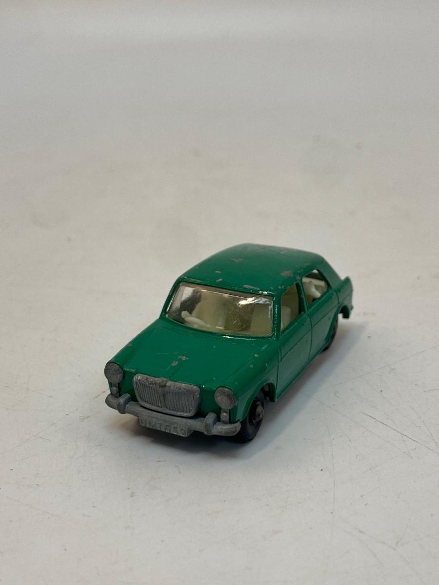 Vintage Matchbox Series Lesney Diecast Car #64 MG1100. White interior featuring driver with dog in back seat. In play worn condition.