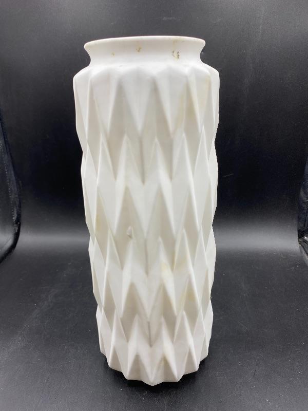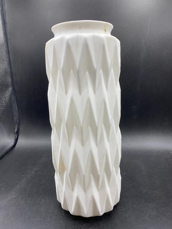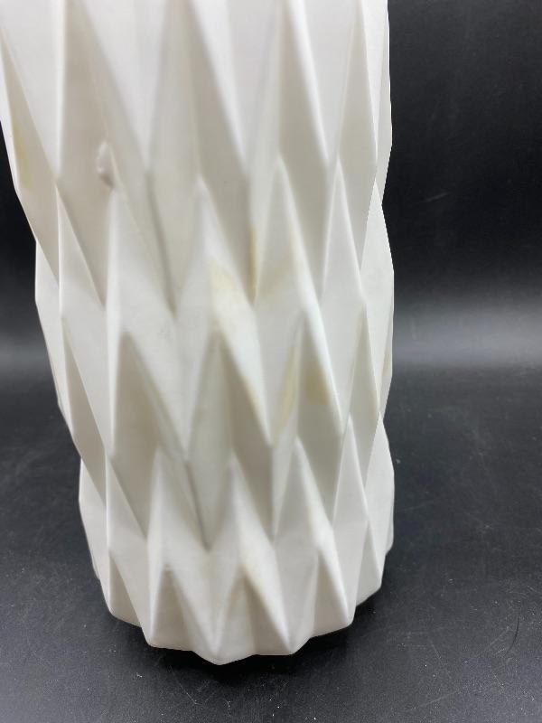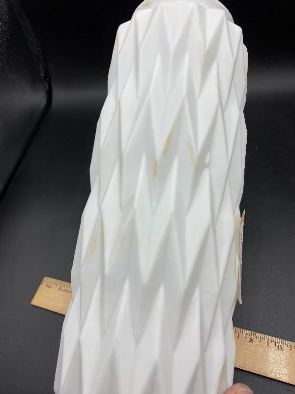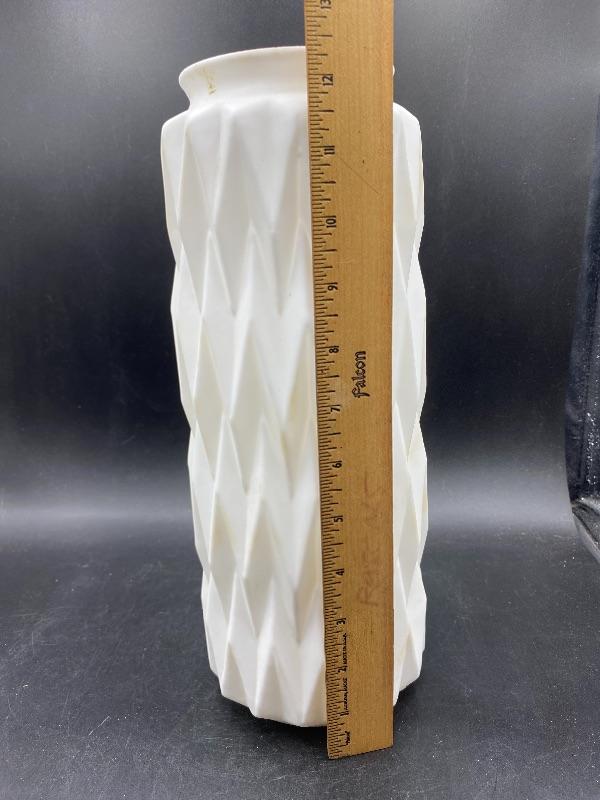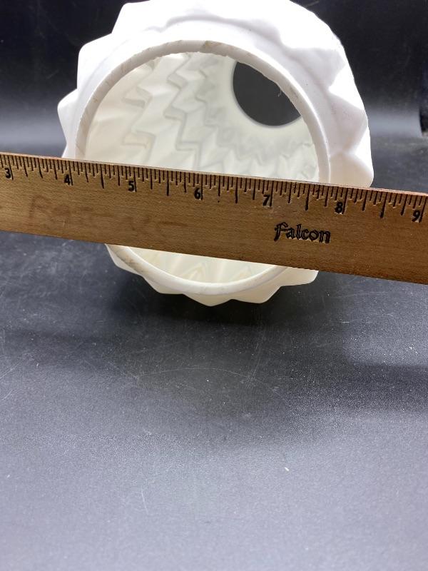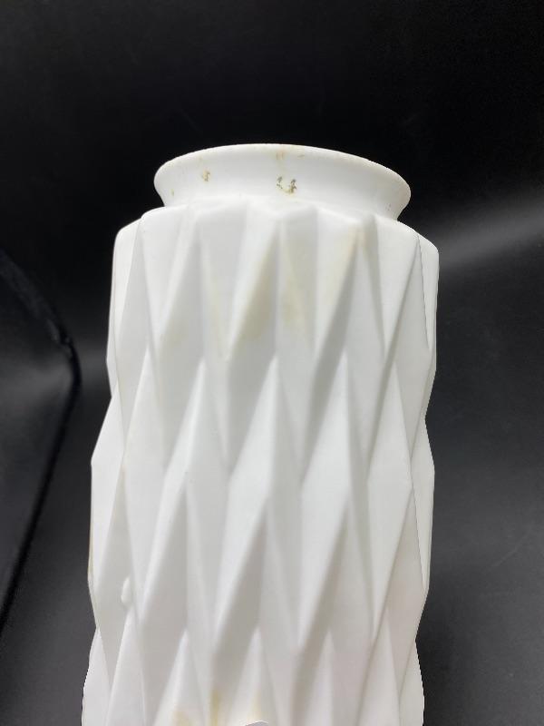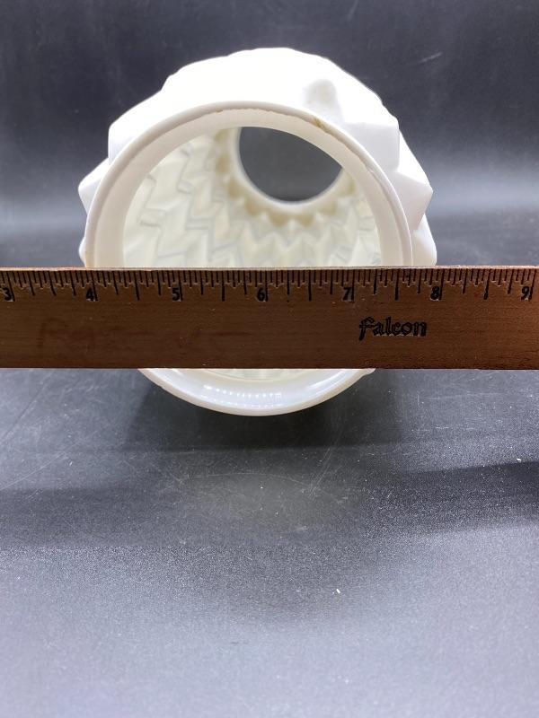 Vintage Mid Century swag lamp globe. Matte white outer finish has a chevron zig zag sort of pattern. Good vintage condition. Globe is about 13". There is some yellowing discoloration unsure from what, still looks good. Being a matte finish on glass it may be paintable.