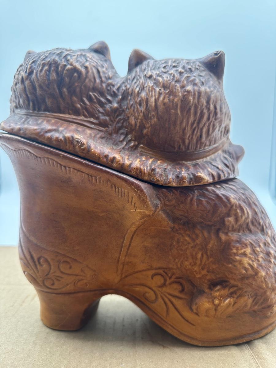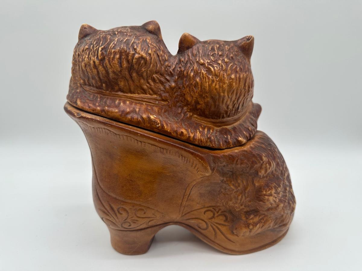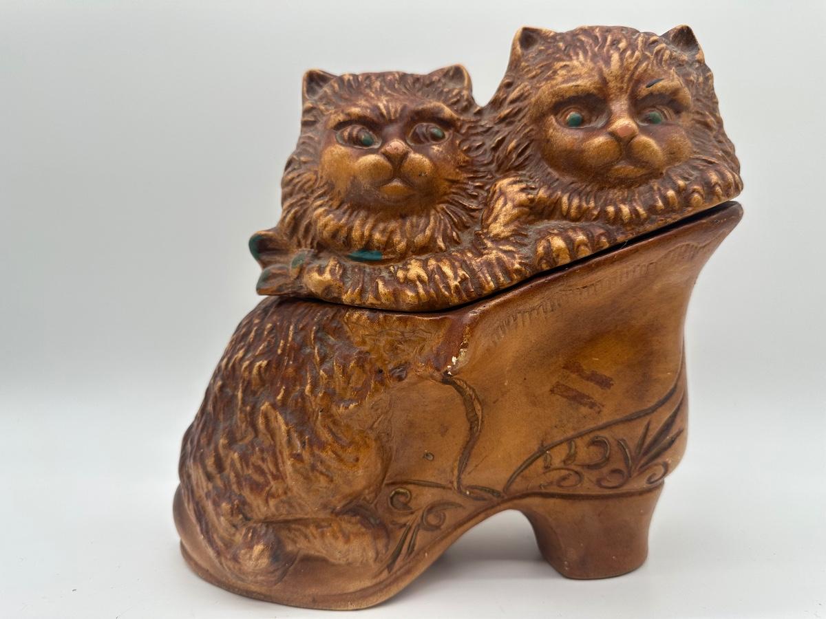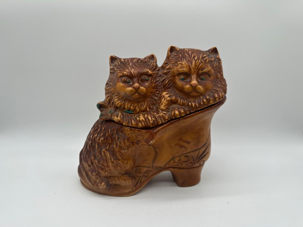 Ceramic boot-form covered jar with two cat figures on lid. Marked “Maurice of California” on base. Shows age-related wear. See photos.