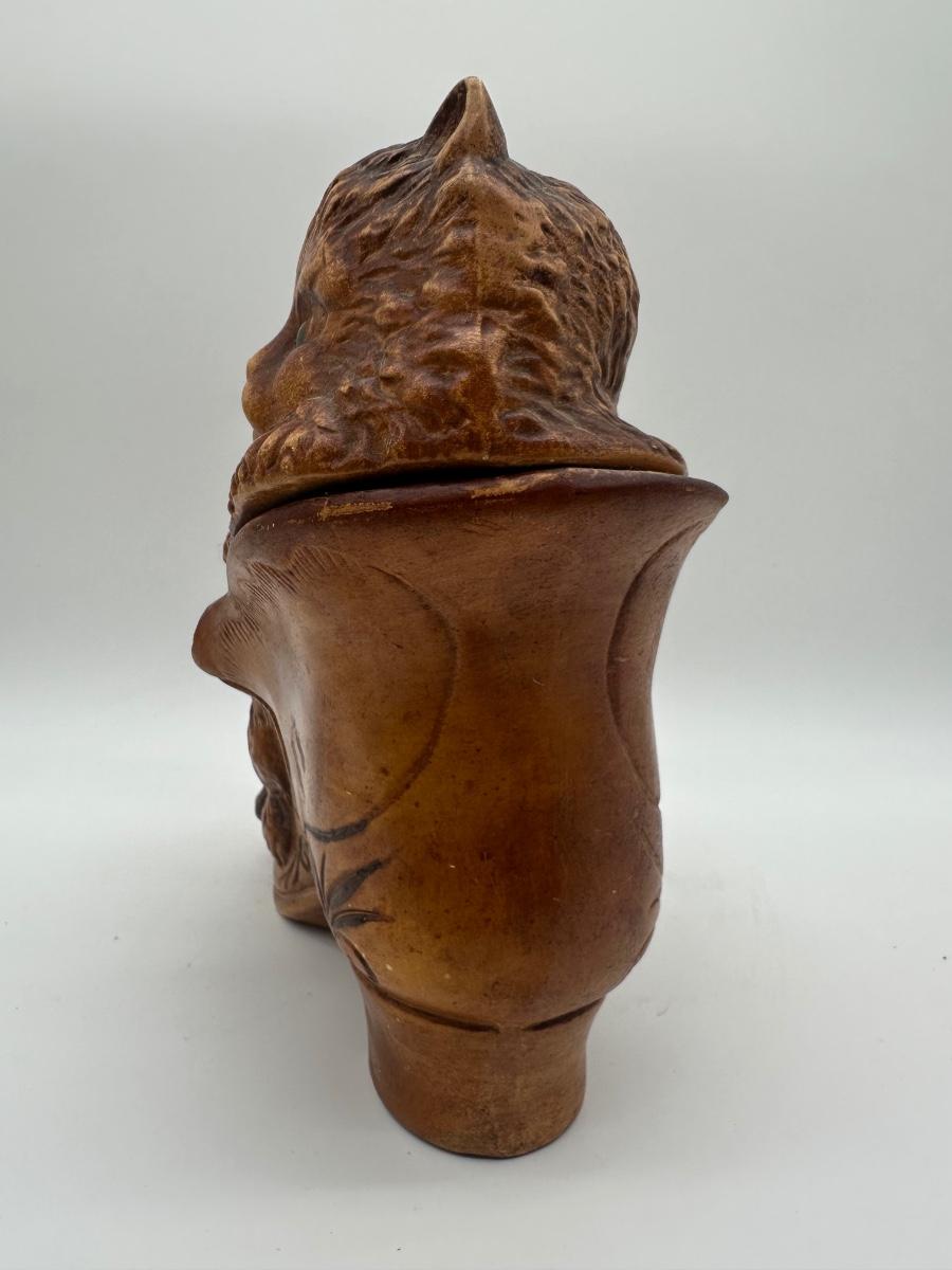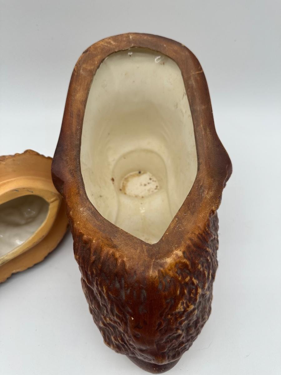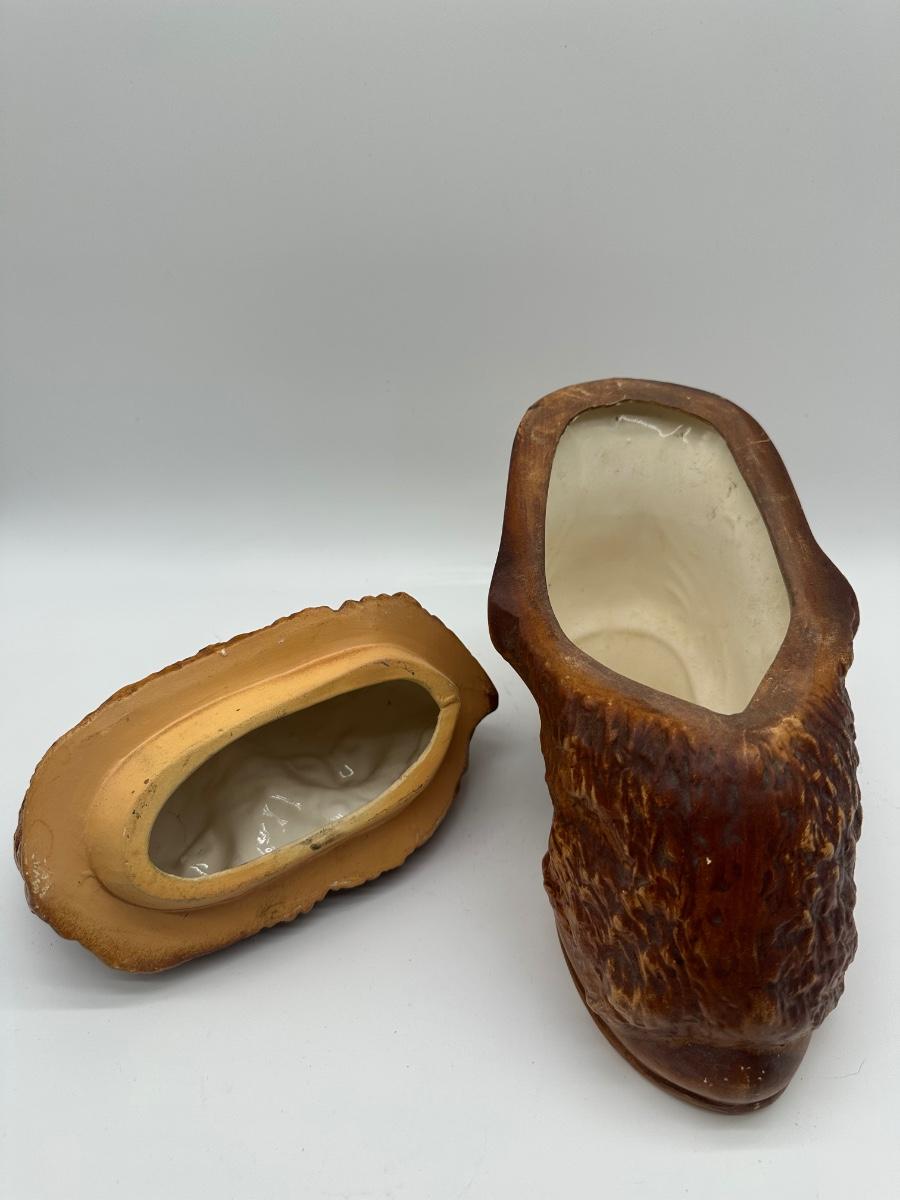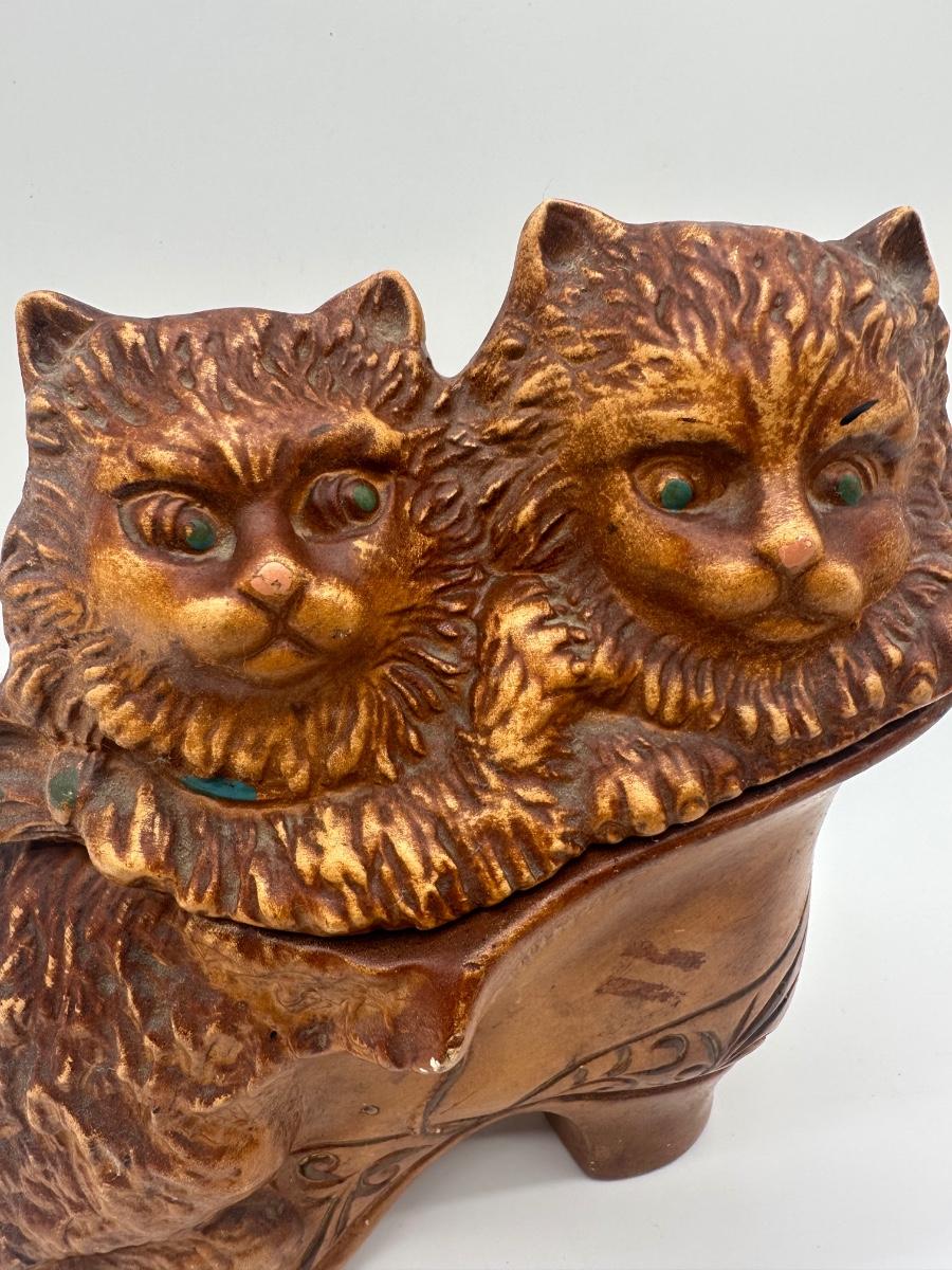 Ceramic boot-form covered jar with two cat figures on lid. Marked “Maurice of California” on base. Shows age-related wear. See photos.