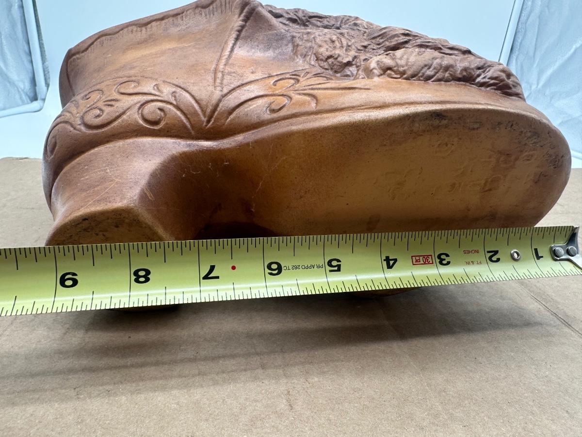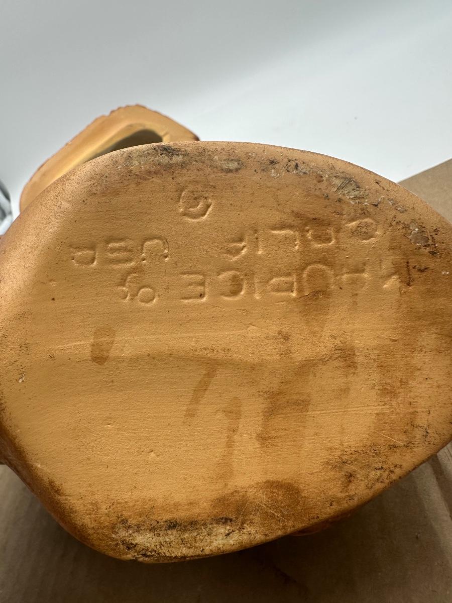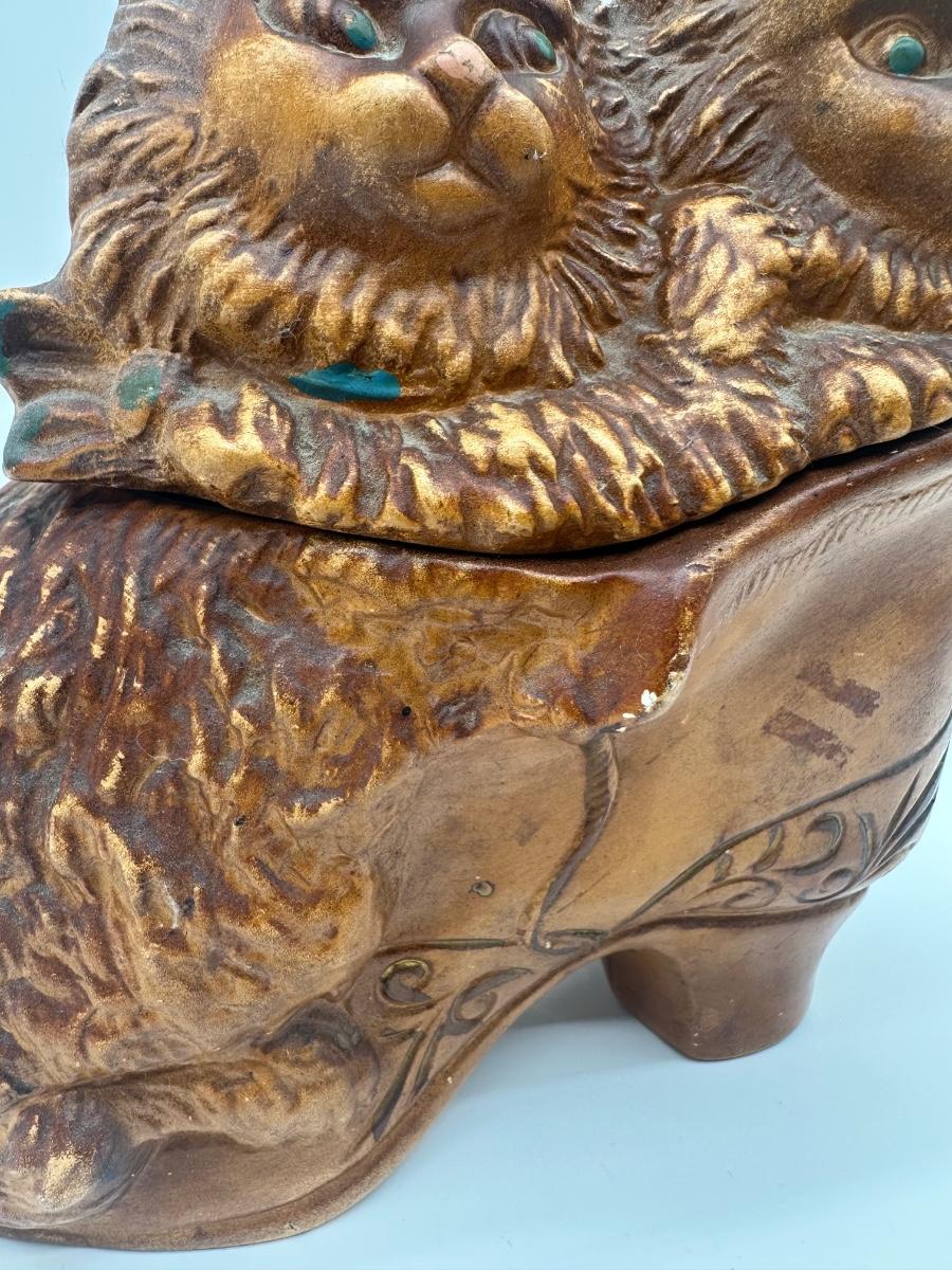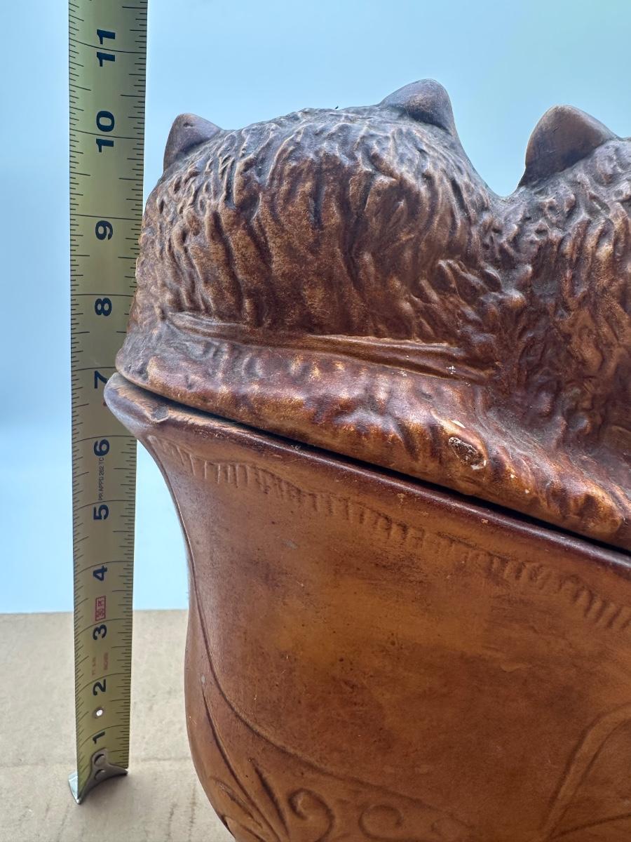 Ceramic boot-form covered jar with two cat figures on lid. Marked “Maurice of California” on base. Shows age-related wear. See photos.