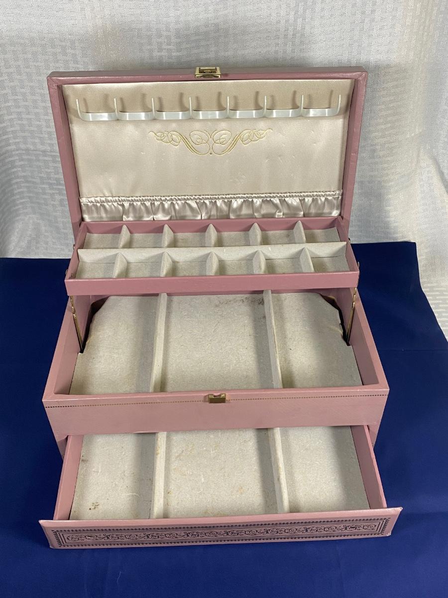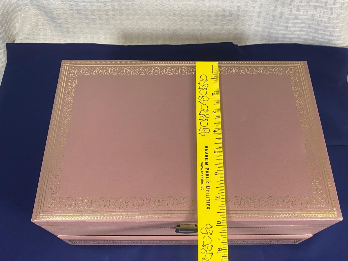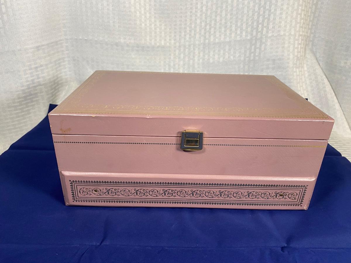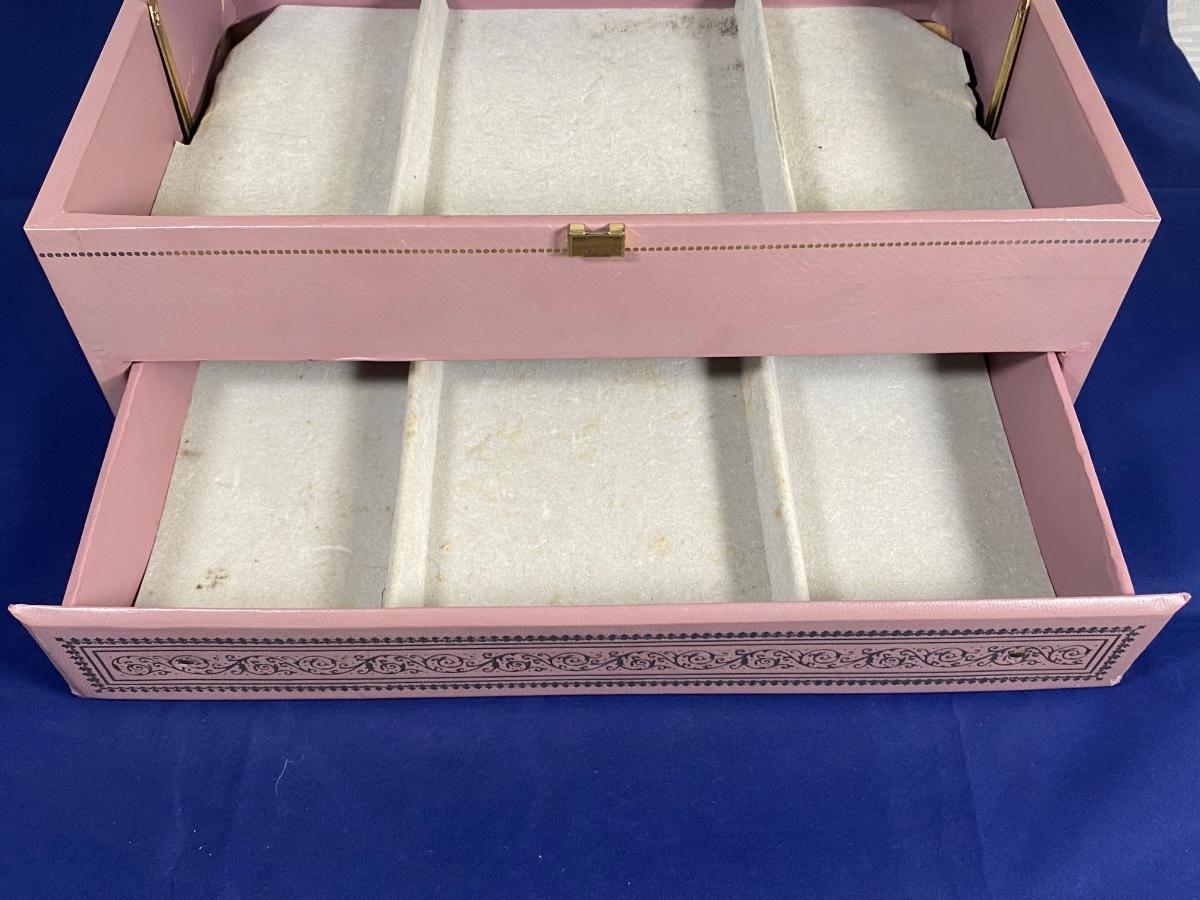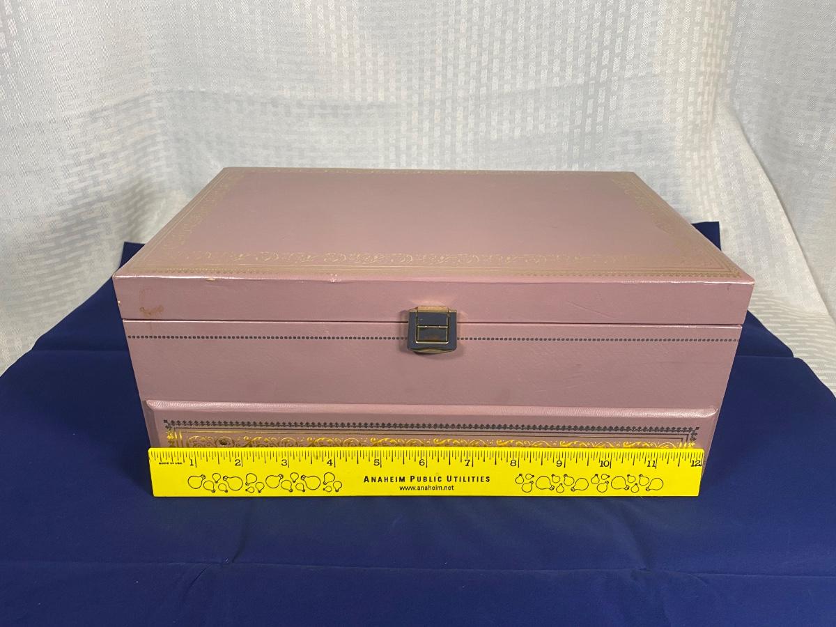 Vintage Mauve Pink and Gold Mele Jewlery Box. Off white inside lining. In vintage condition, light signs of use. Bottom drawer opens when the lid is opened. About 12" size.