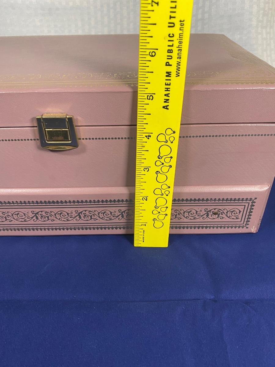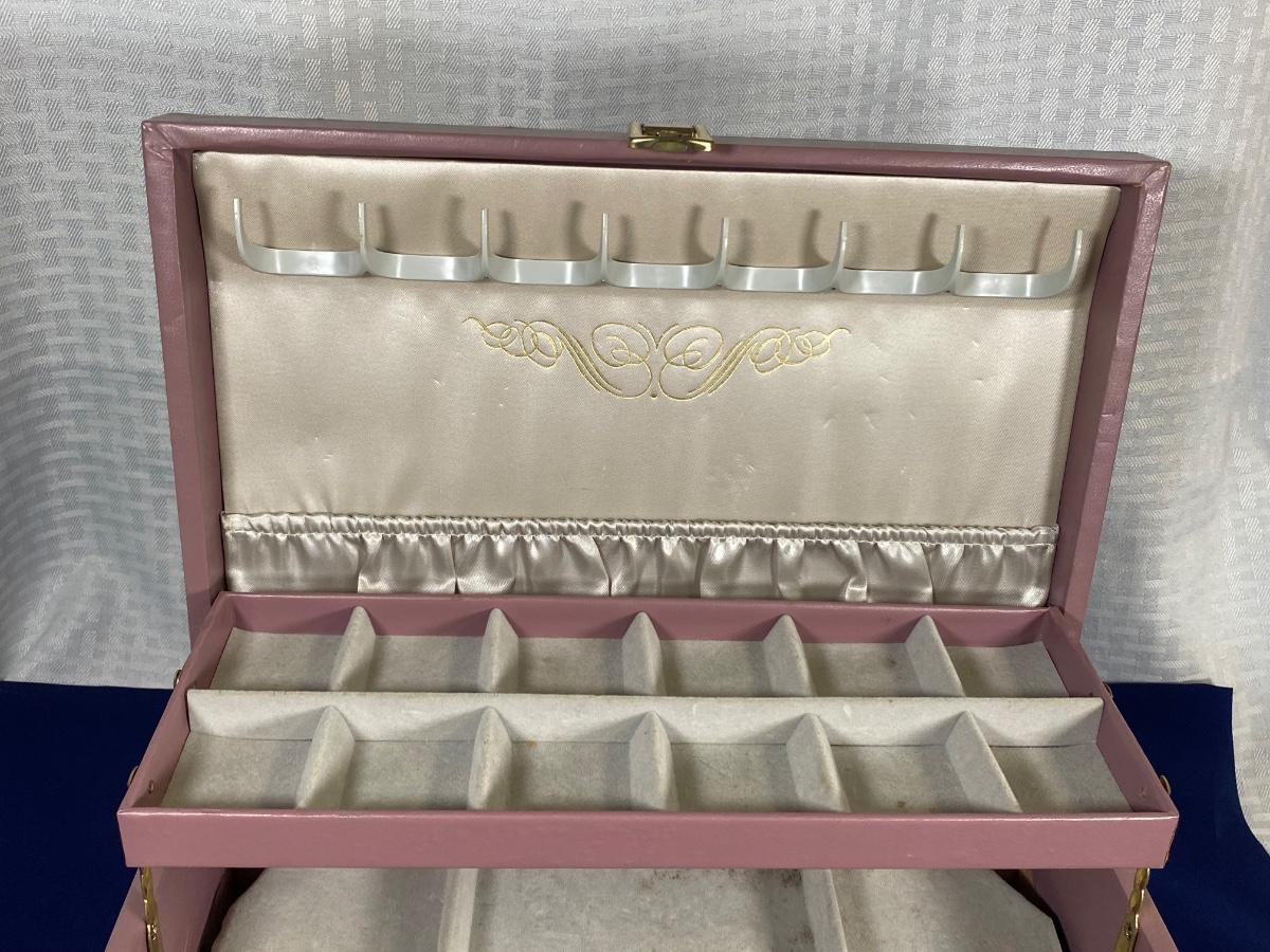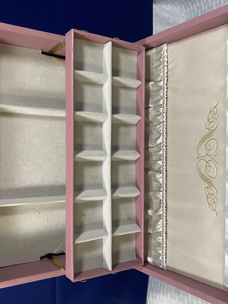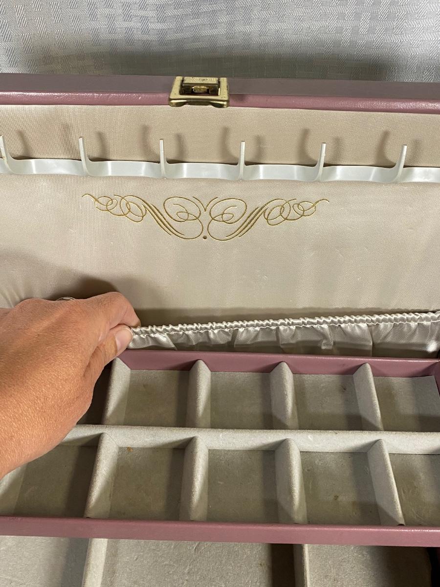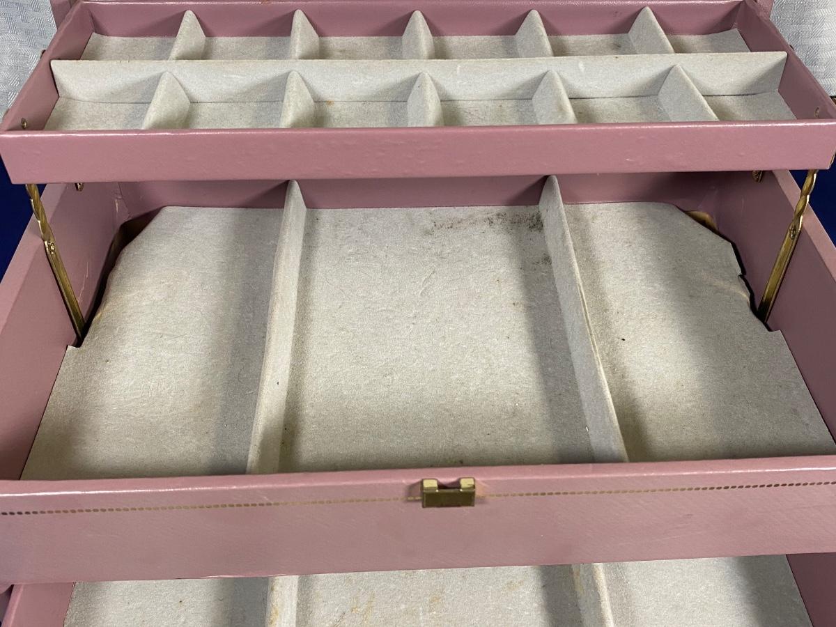 Vintage Mauve Pink and Gold Mele Jewlery Box. Off white inside lining. In vintage condition, light signs of use. Bottom drawer opens when the lid is opened. About 12" size.
