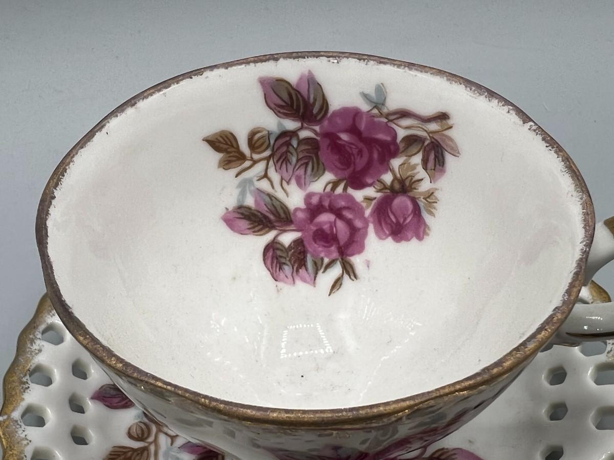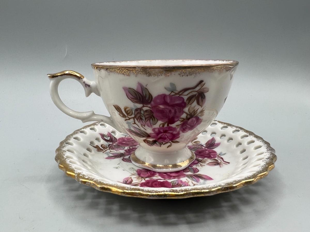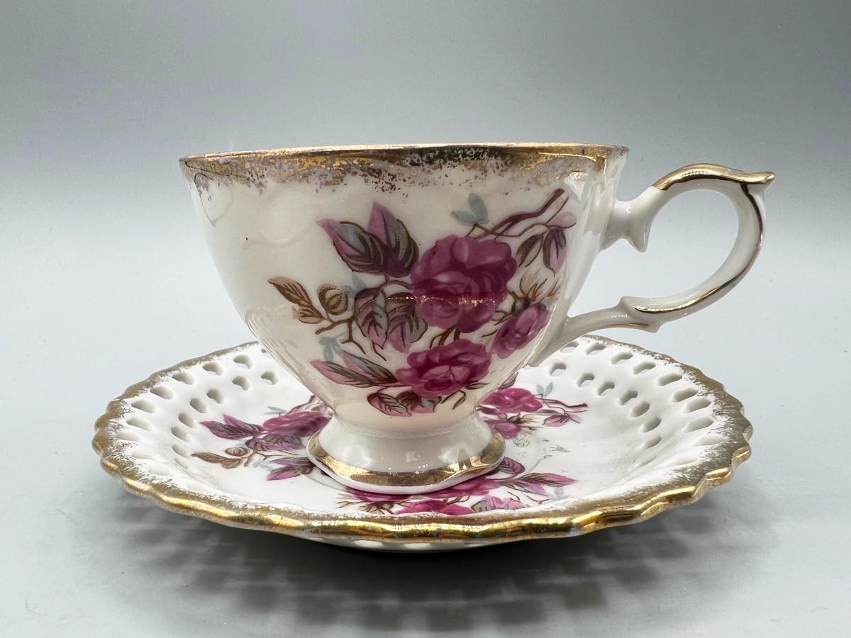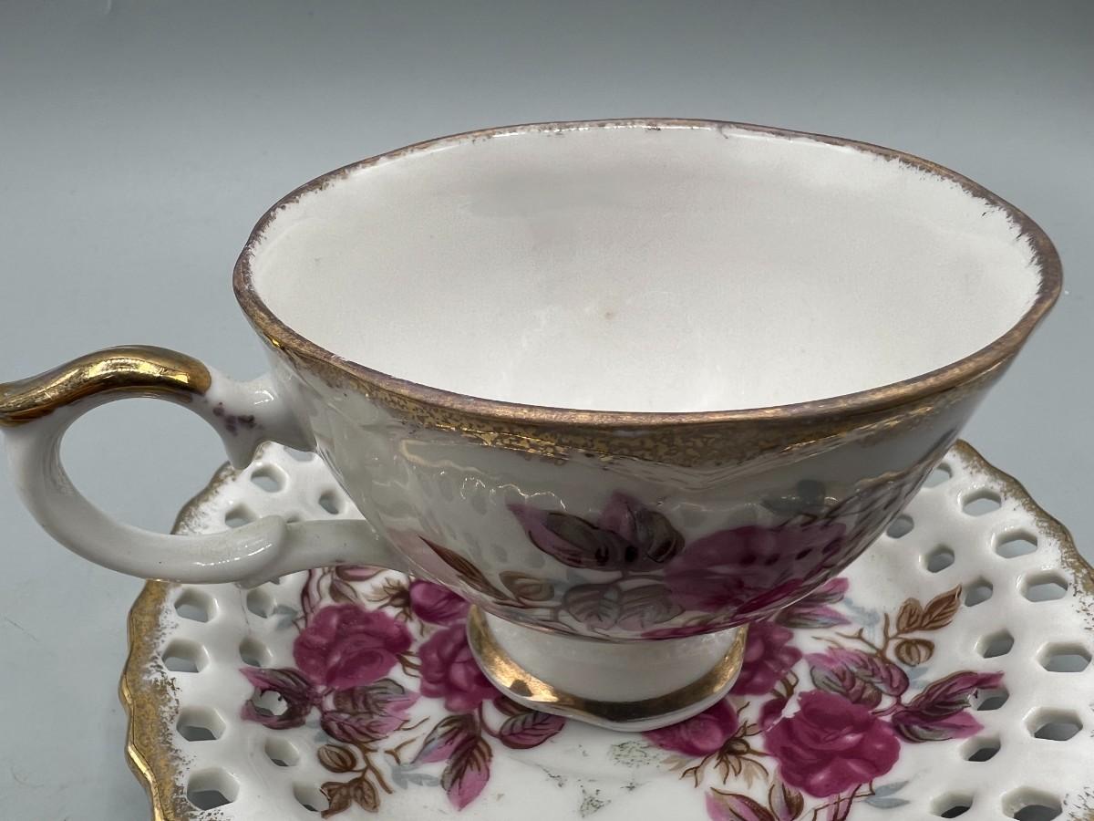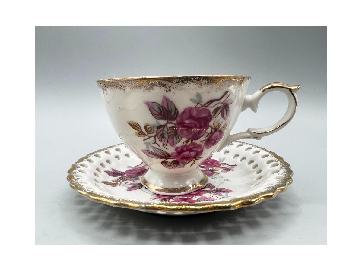 Vintage Mauve Pink Rose Teacup & Saucer Set. Open work edge on saucer, gold accents on rims and handle. Unbranded. Good condition.