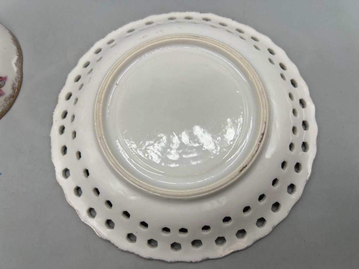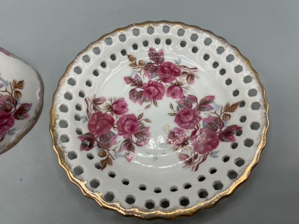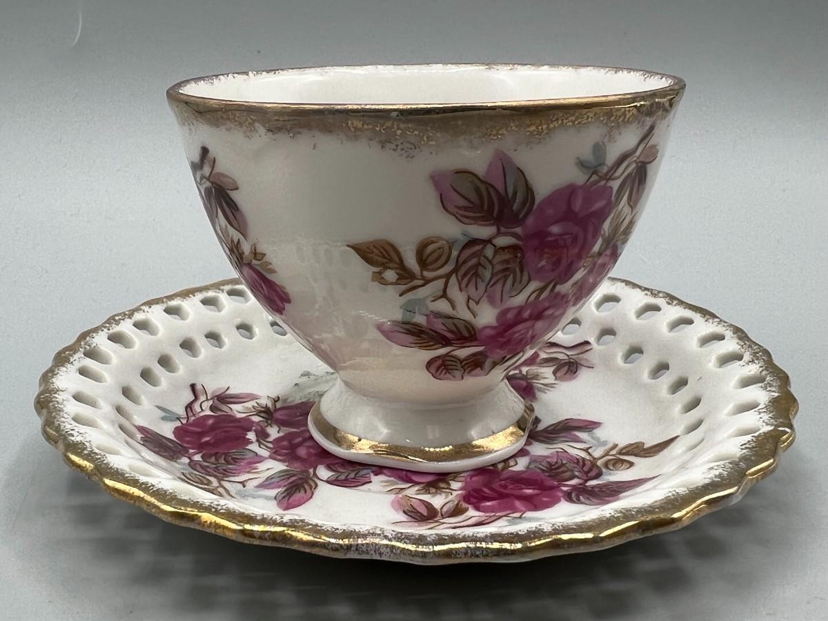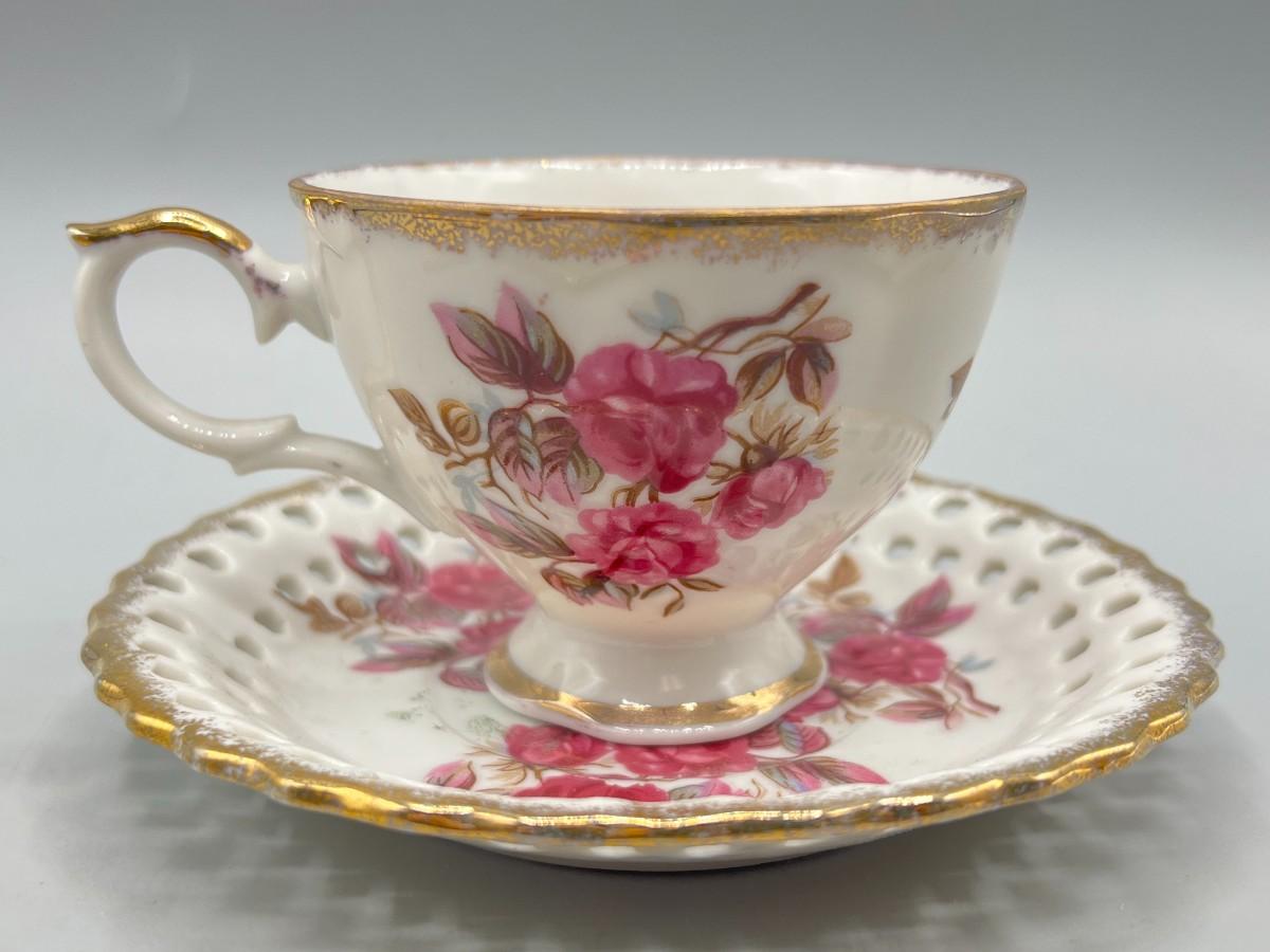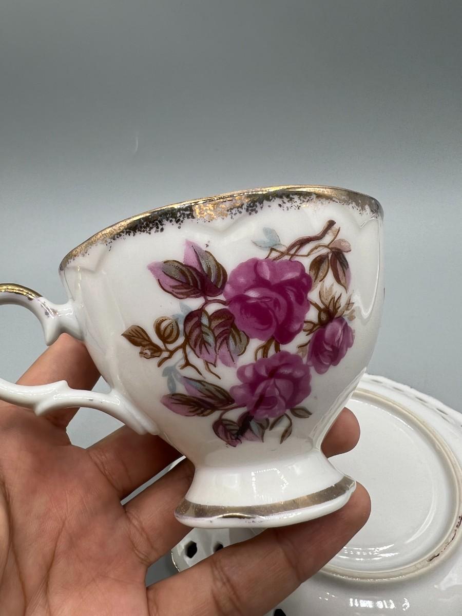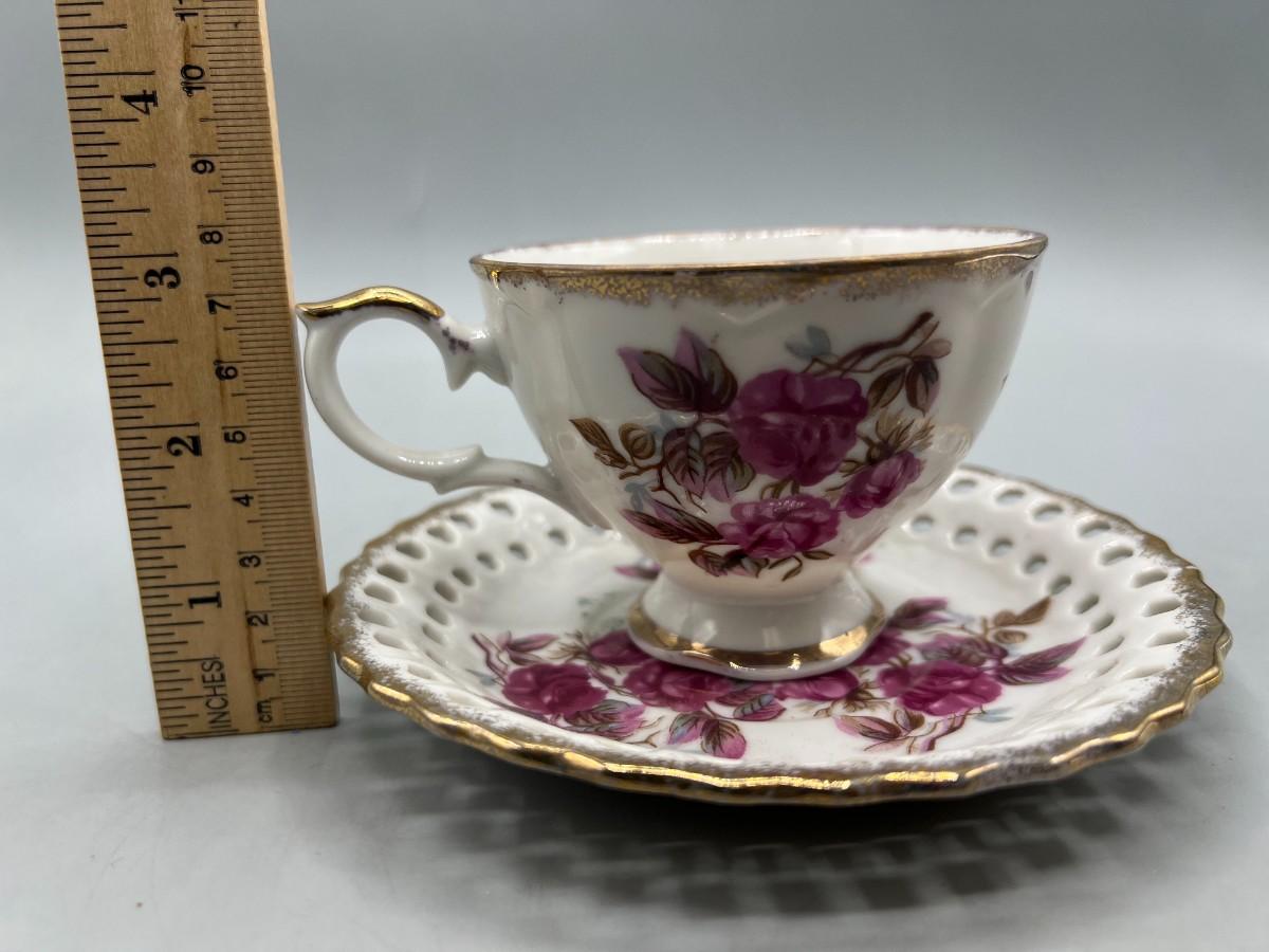 Vintage Mauve Pink Rose Teacup & Saucer Set. Open work edge on saucer, gold accents on rims and handle. Unbranded. Good condition.