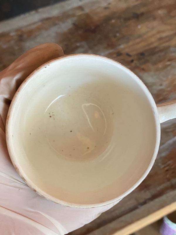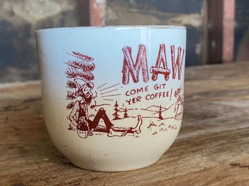 Vintage Old Timer image coffee cup. Has "Maw Come Get Yer Coffee!" on it. In good condition. Looks like there might be a small nick in the rim, could not tell if it was that or a flaw because of how small it is.