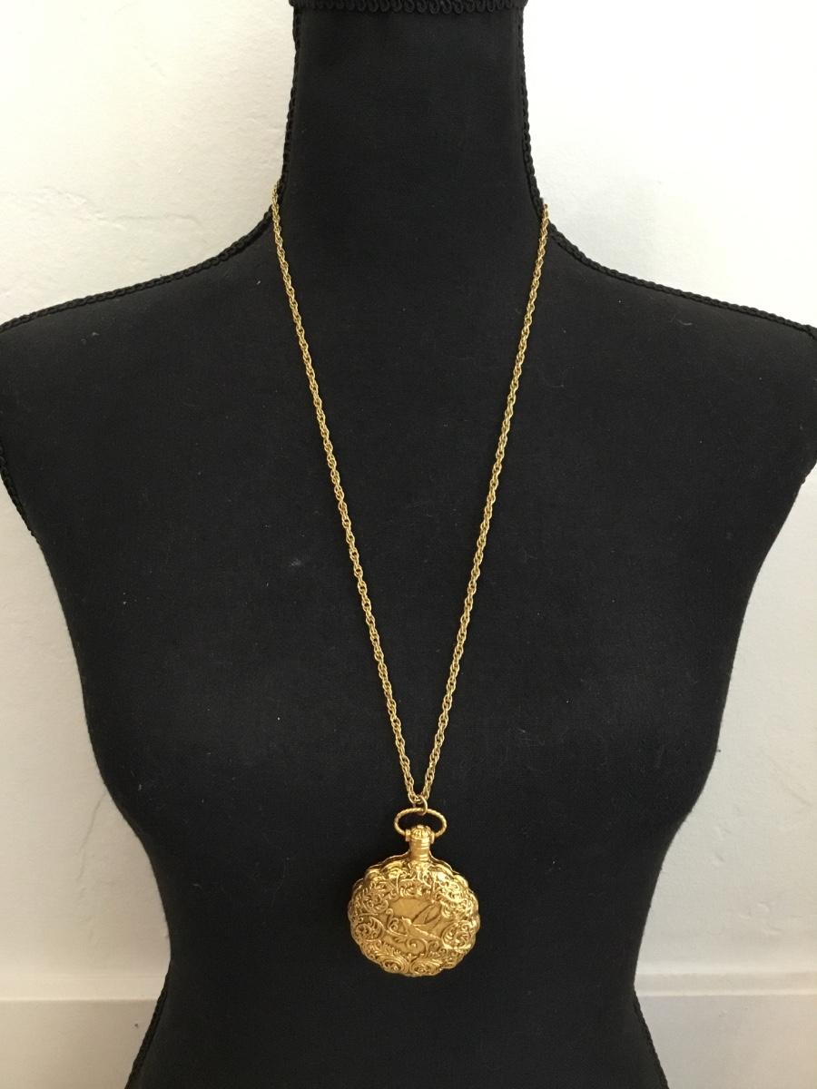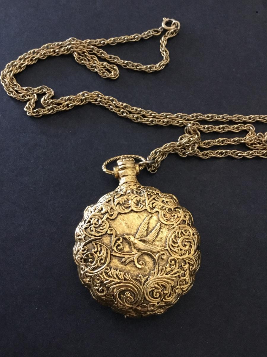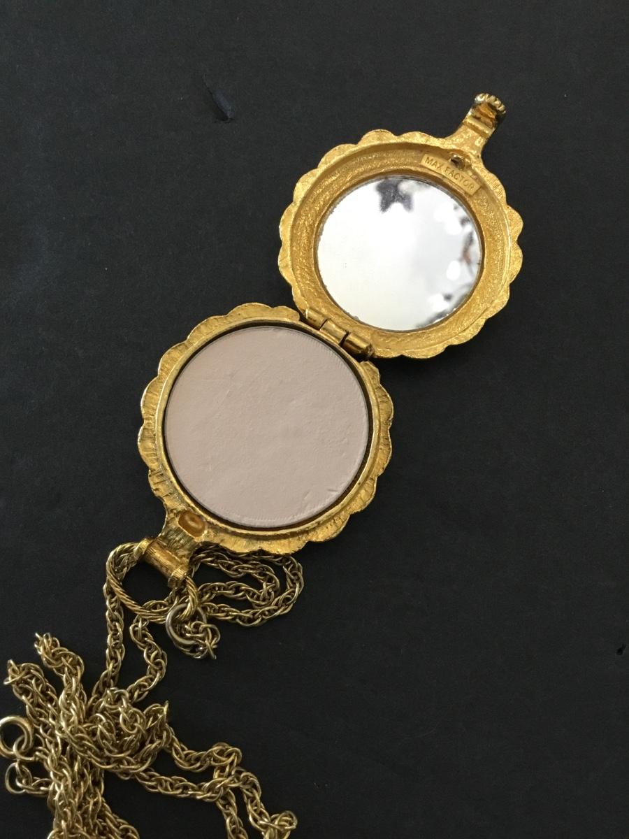 Vintage max factor pocket, watch style locket, compact powder, puff mirror, chain