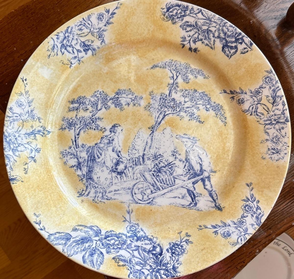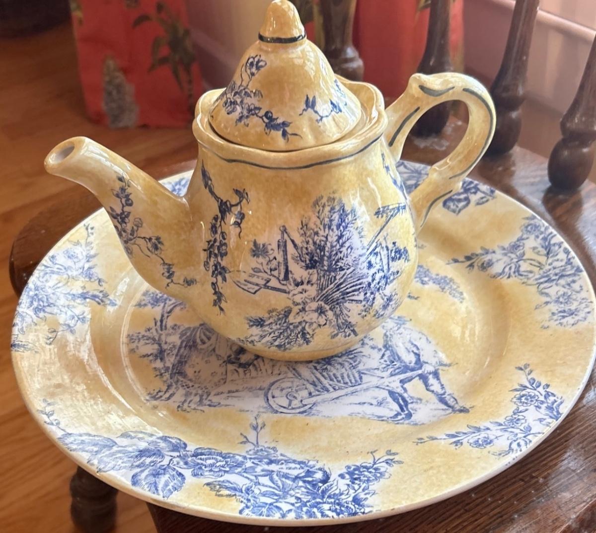 Vintage Maxcera yellow and blue toile French Provincial platter with tea pitcher set