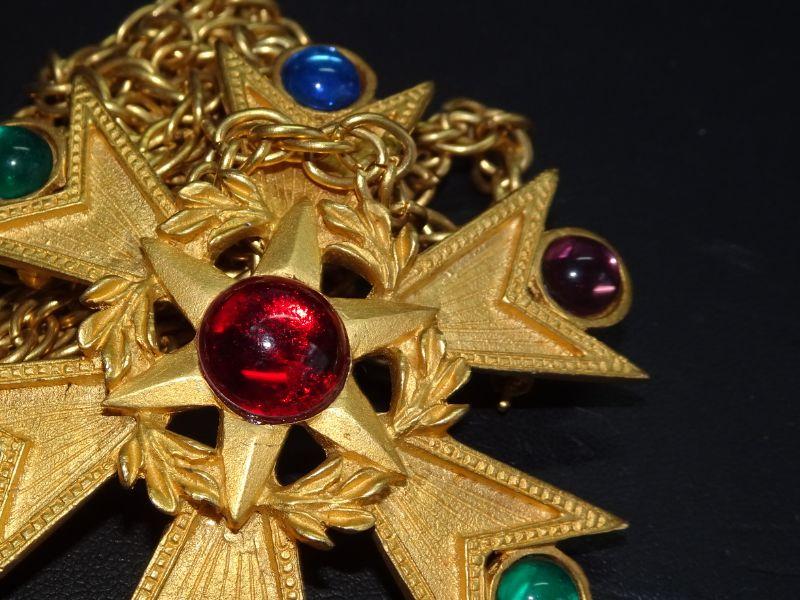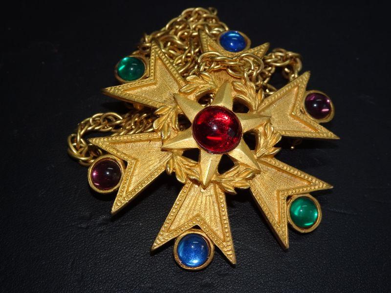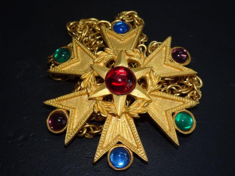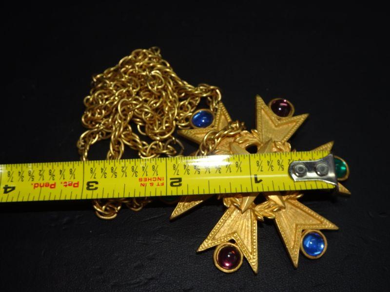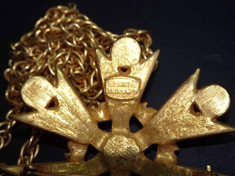 Vintage MAXINE DENKER Vintage Crest Pendant Necklace Colorful Cabochons, Gold Tone, Royalty