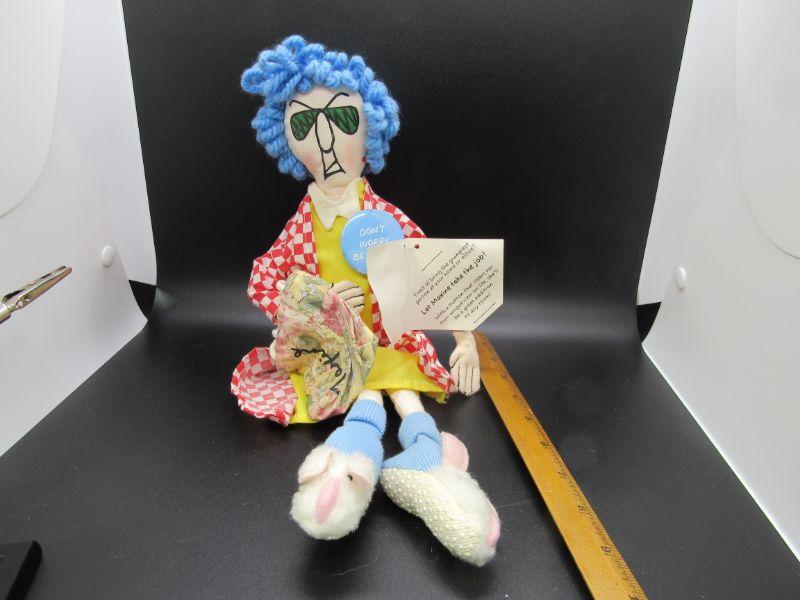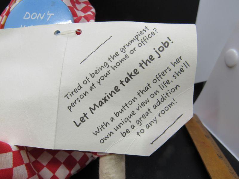 Vintage Hallmark "Maxine" doll plush. Wearing a pin in her usual fashion that says "Don't worry Be crabby". Original hang tag attached.