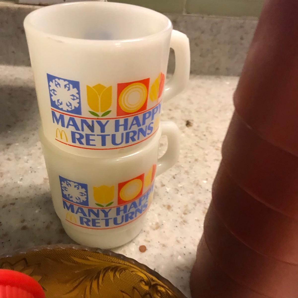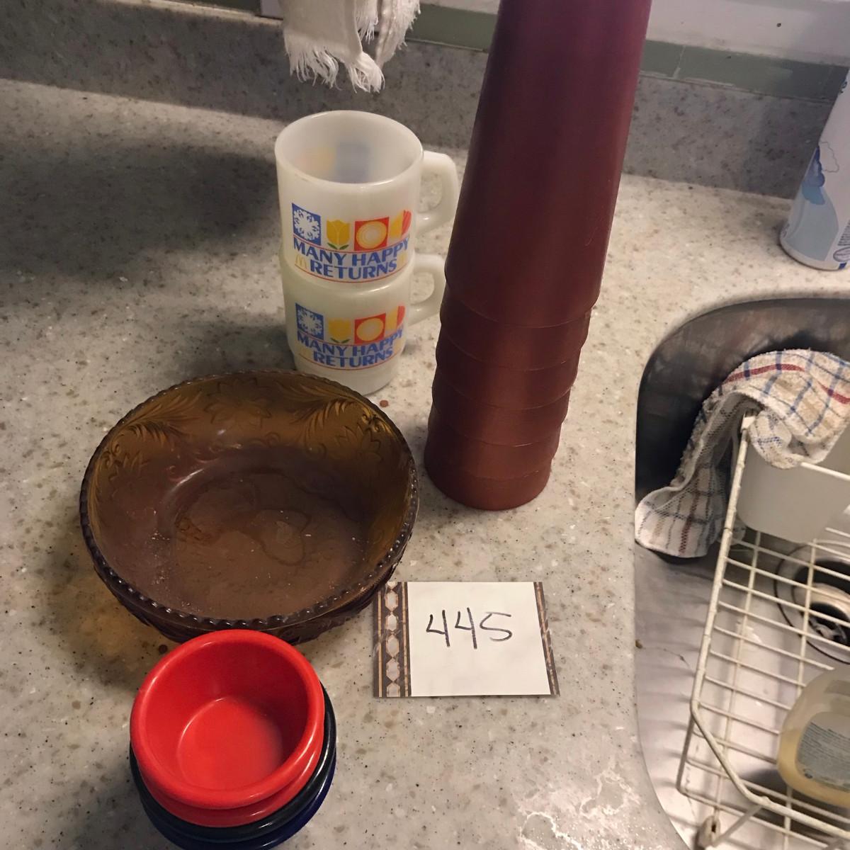 When you bought those mugs you got a lifetime of coffee for like a quarter!!! Tiara bowl & fun copper tone plastic tumblers