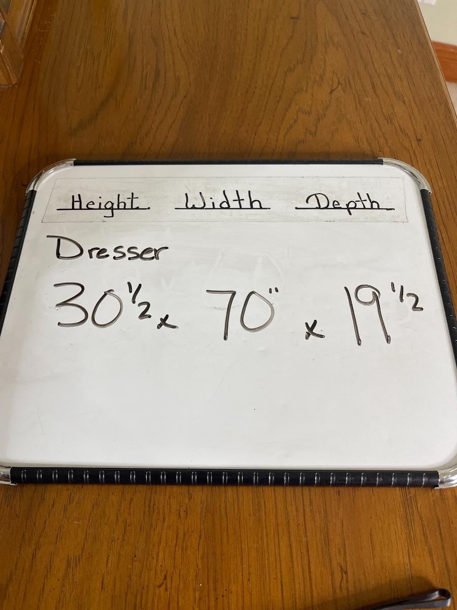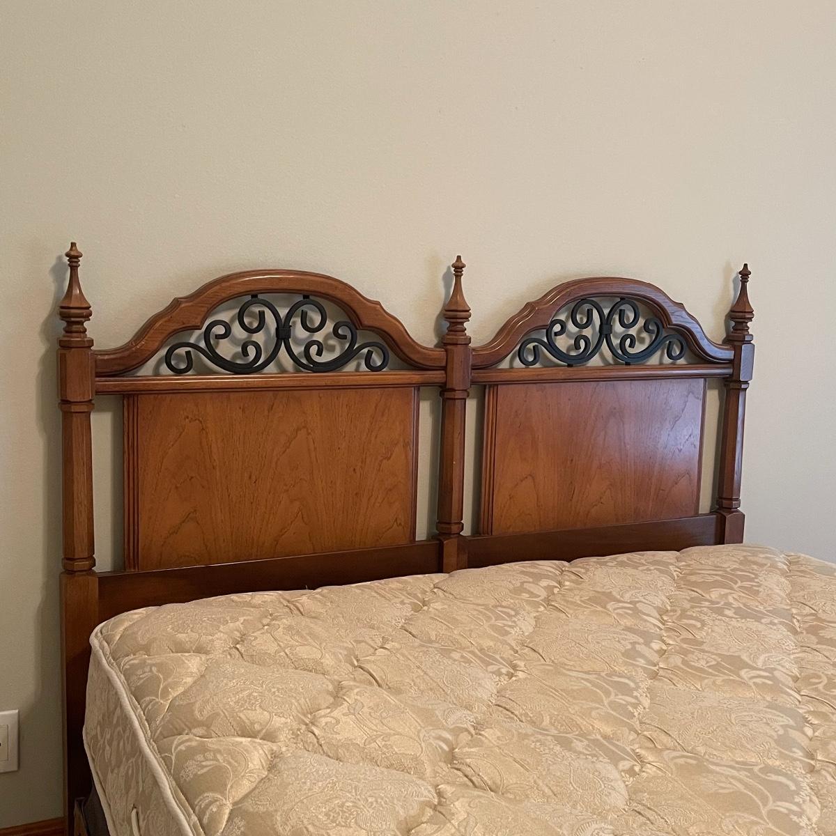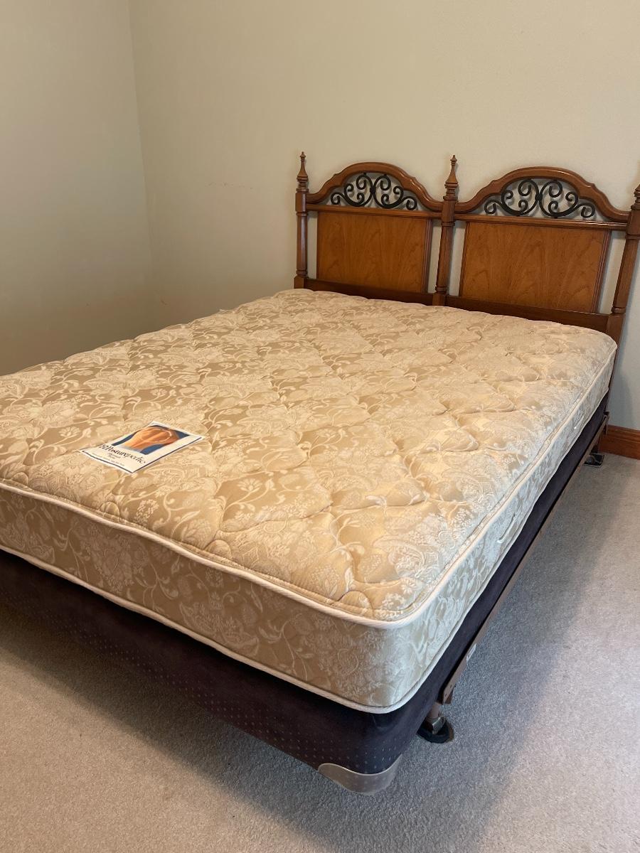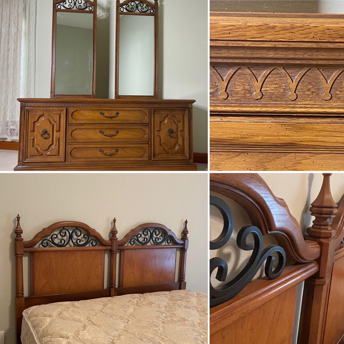 Triple dresser has side cabinets with 3 drawers in each cabinet. 3 Long Center drawers. Headboard is full or queen size. Includes Queen Sealy mattress, box and frame. No brand found.