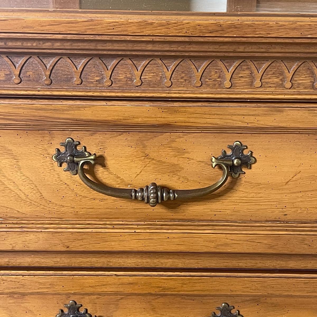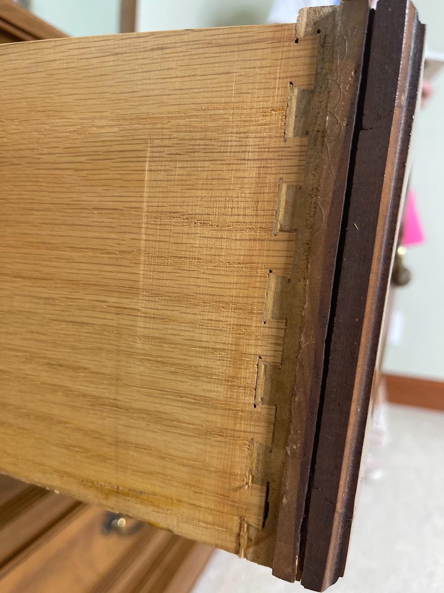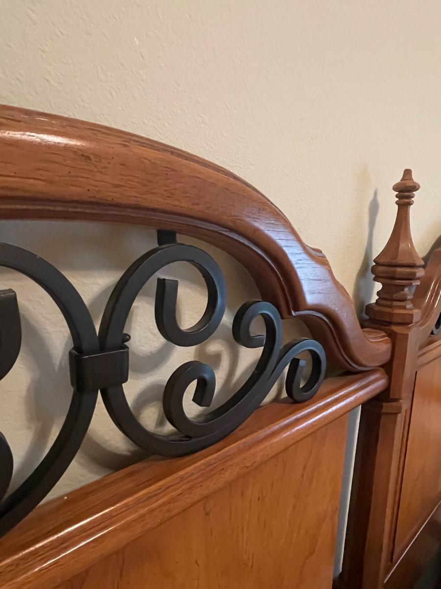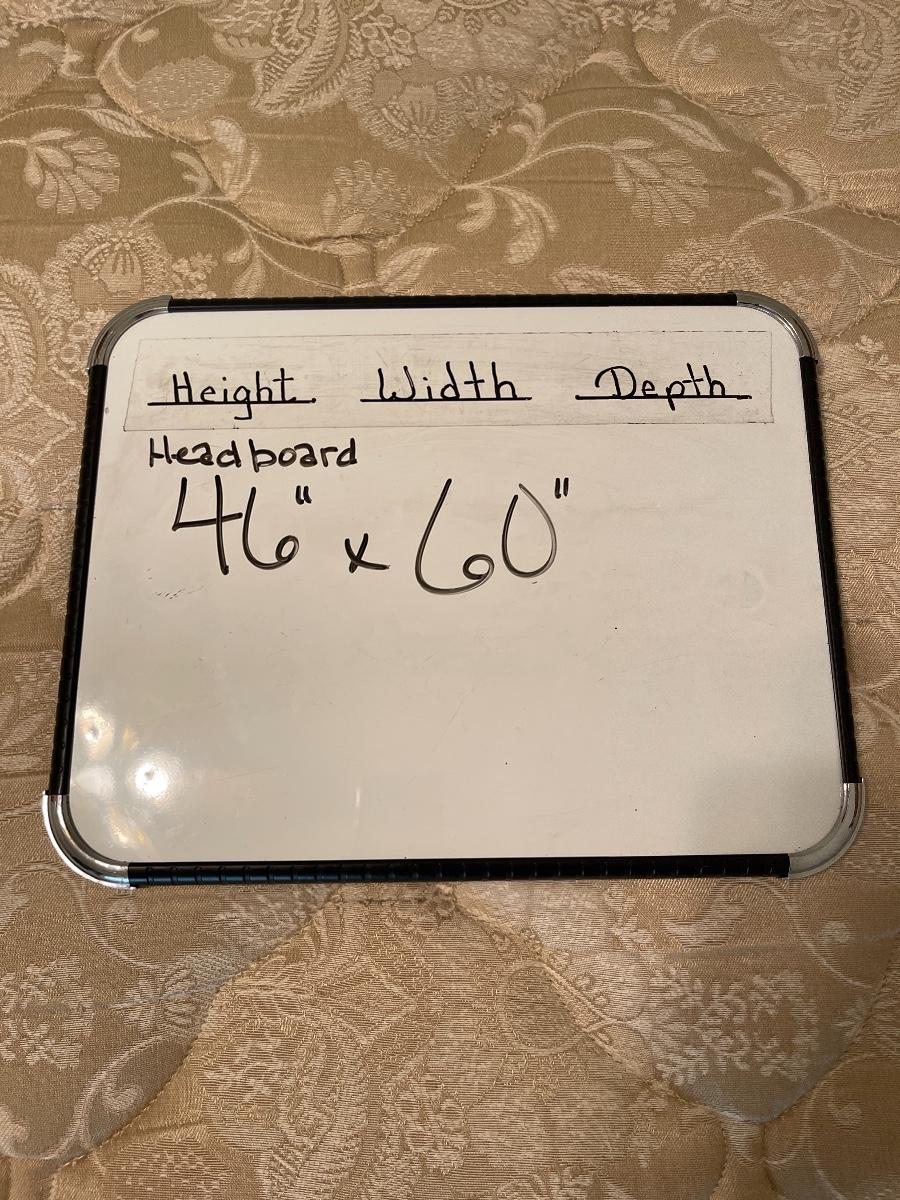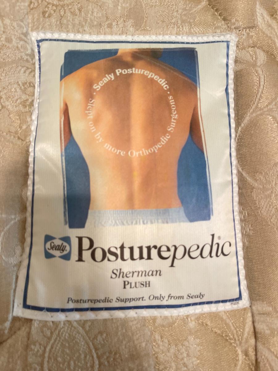 Triple dresser has side cabinets with 3 drawers in each cabinet. 3 Long Center drawers. Headboard is full or queen size. Includes Queen Sealy mattress, box and frame. No brand found.