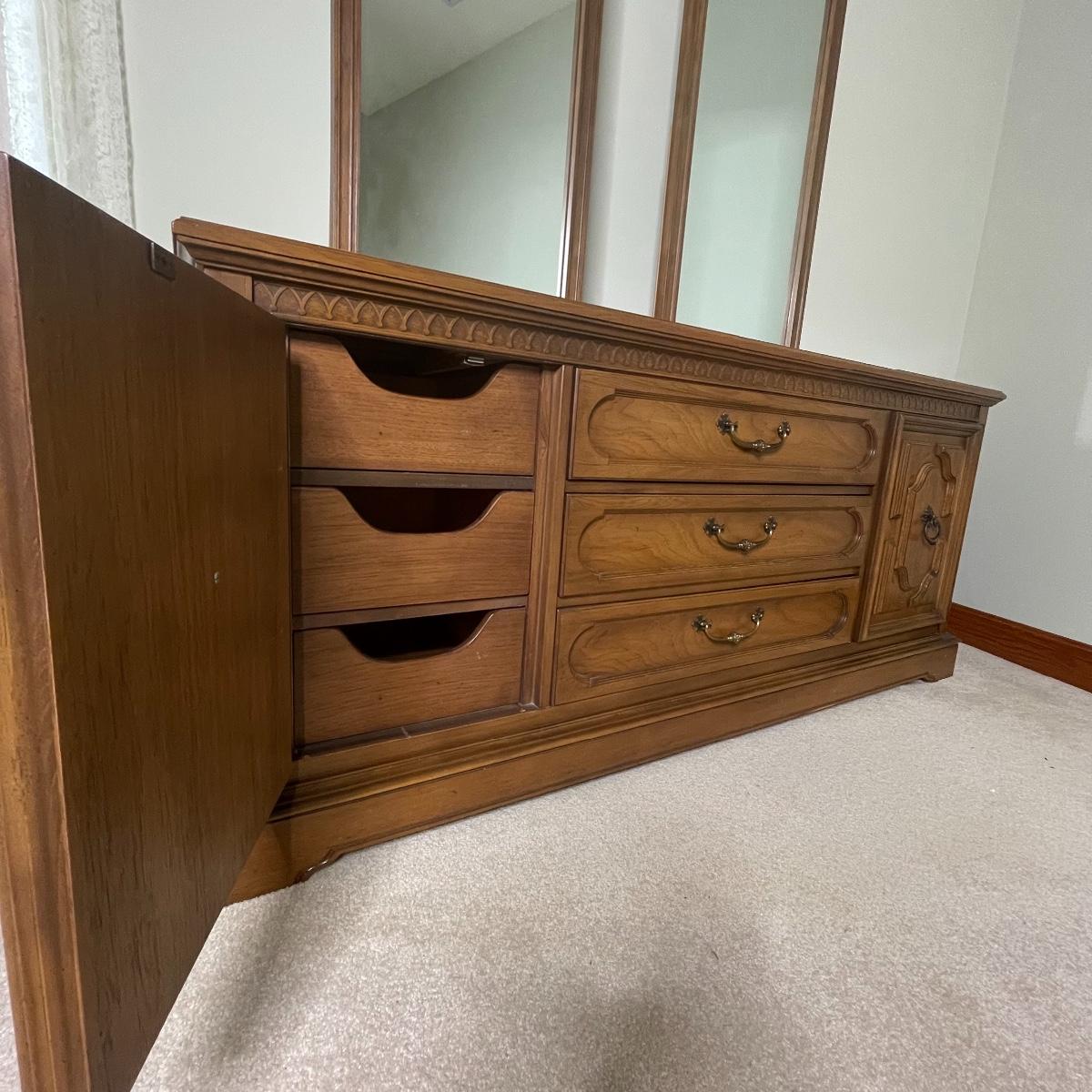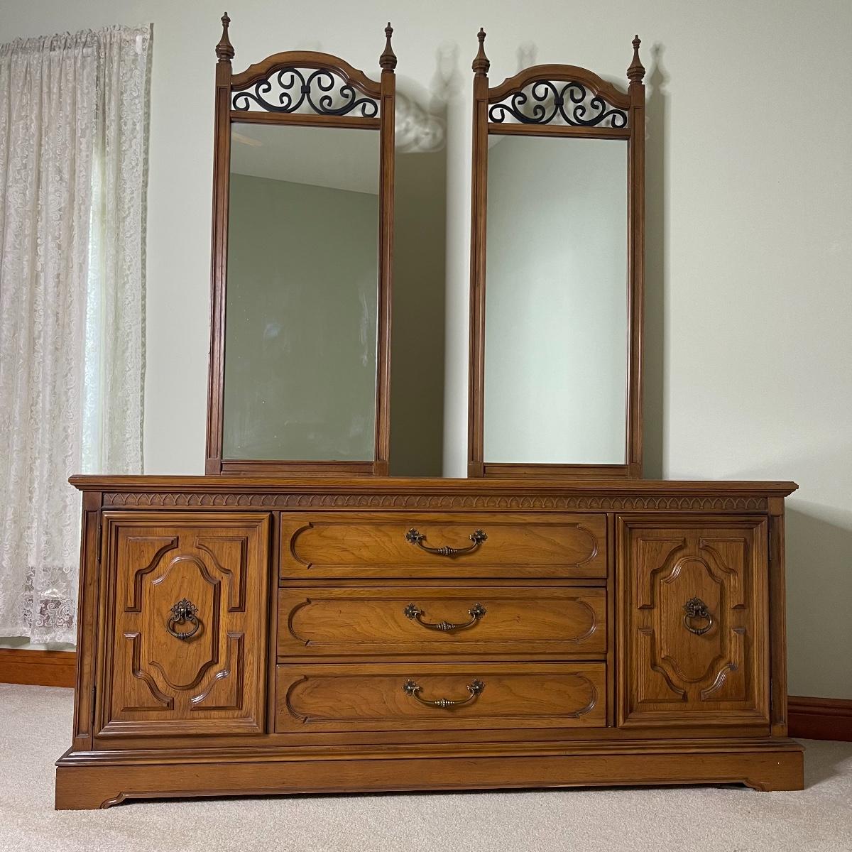 Solid Wood Vintage Double Mirror Dresser & Matching Headboard (Includes Mattress, Box & Frame)