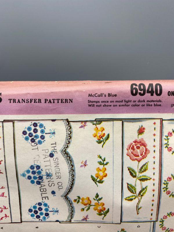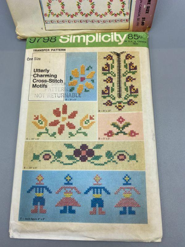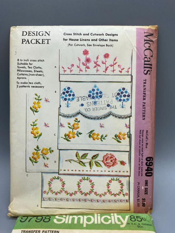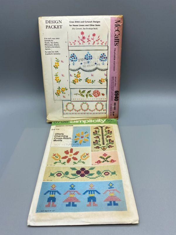 Pair of vintage patterns from McCalls & Simplicity. Patterns are for cross stitch embroidery on tea towels, pillow cases and handkerchiefs. Good condition, well kept. These are transfer patterns from 1971 and 1963.