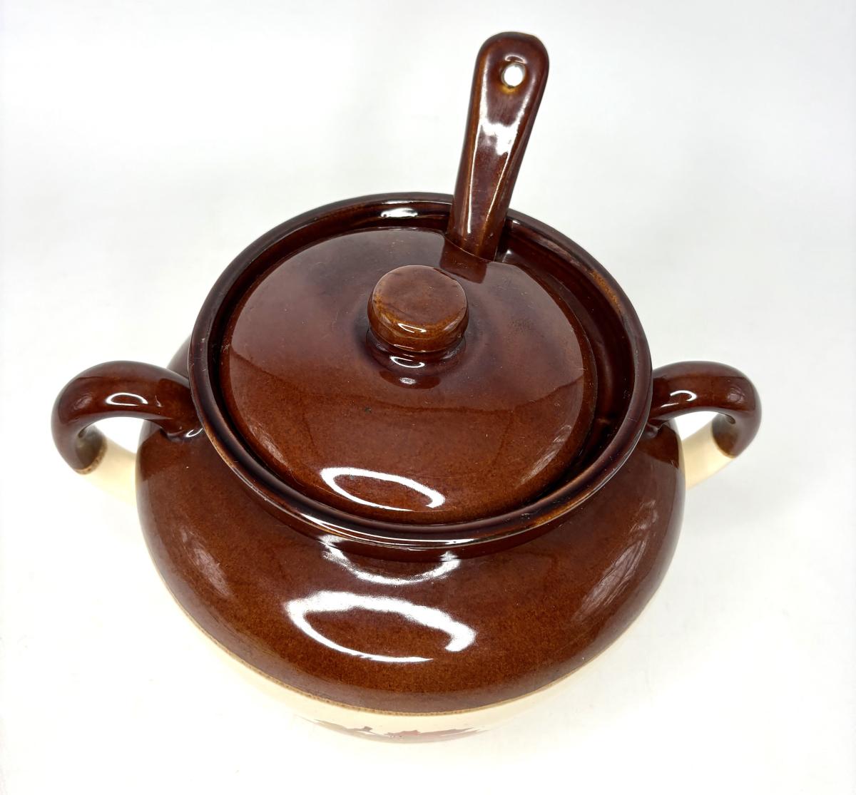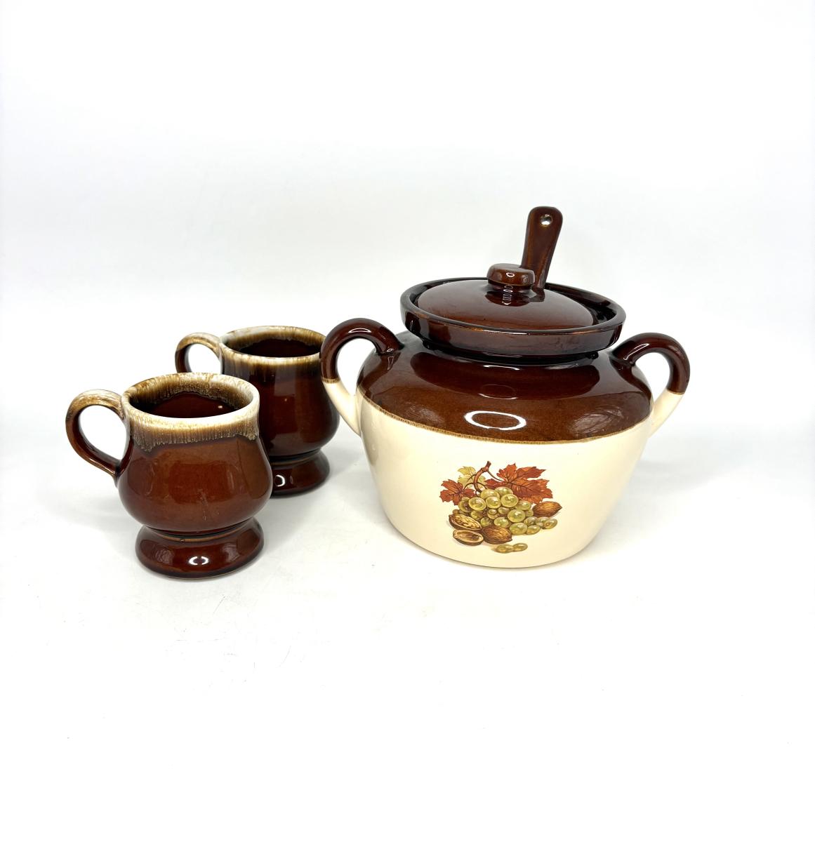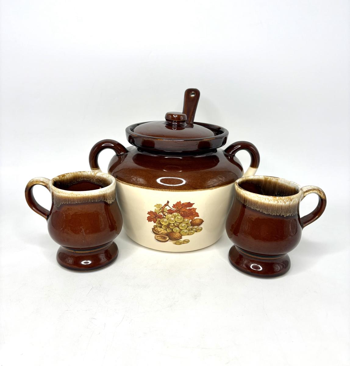 The pot is 7” tall x 5-3/4” diameter at the opening. Mugs are 4-3/4” tall x 3” diameter.