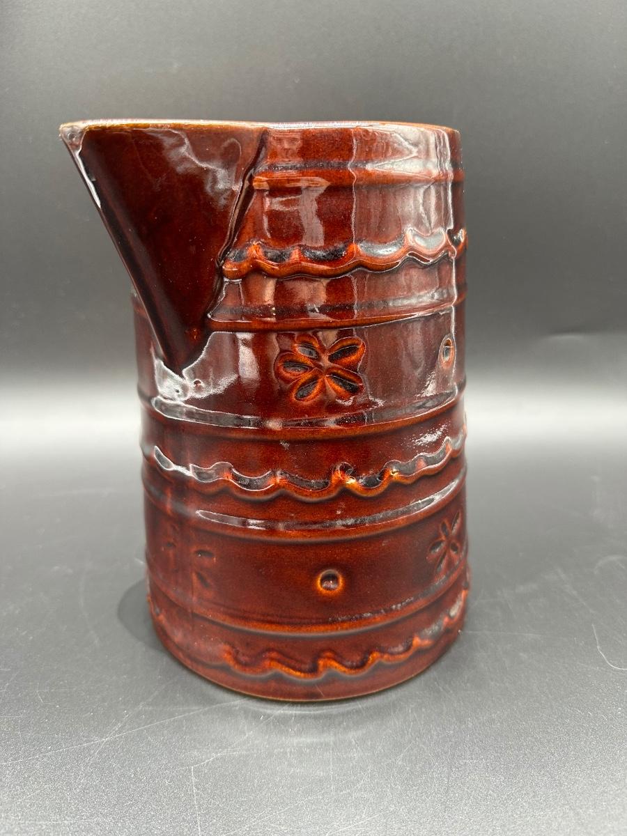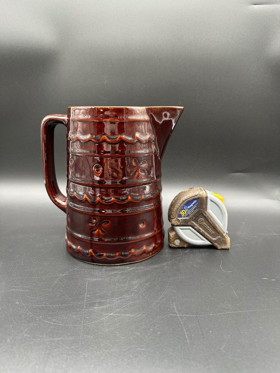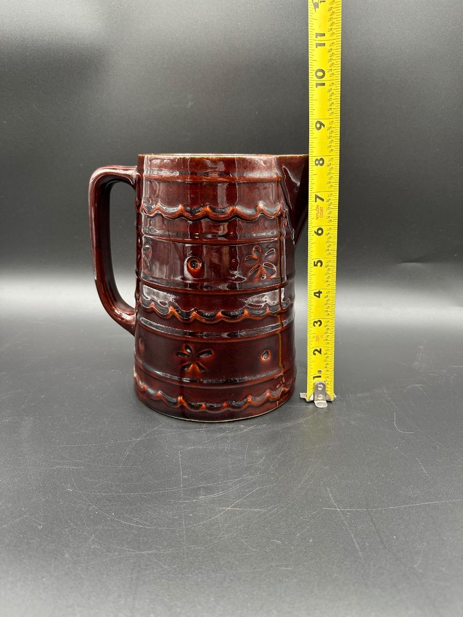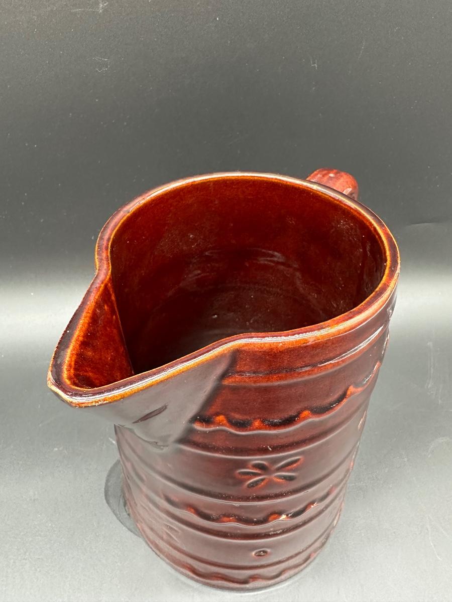 This is a solid mid-century American pottery piece featuring the rich chocolate brown drip glaze over raised banded detailing with subtle floral accents. A great addition to a farmhouse kitchen, primitive decor, or McCoy collection.