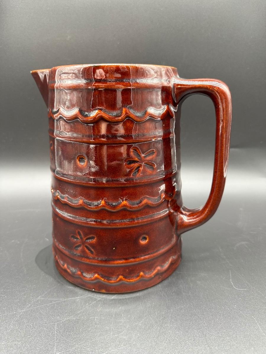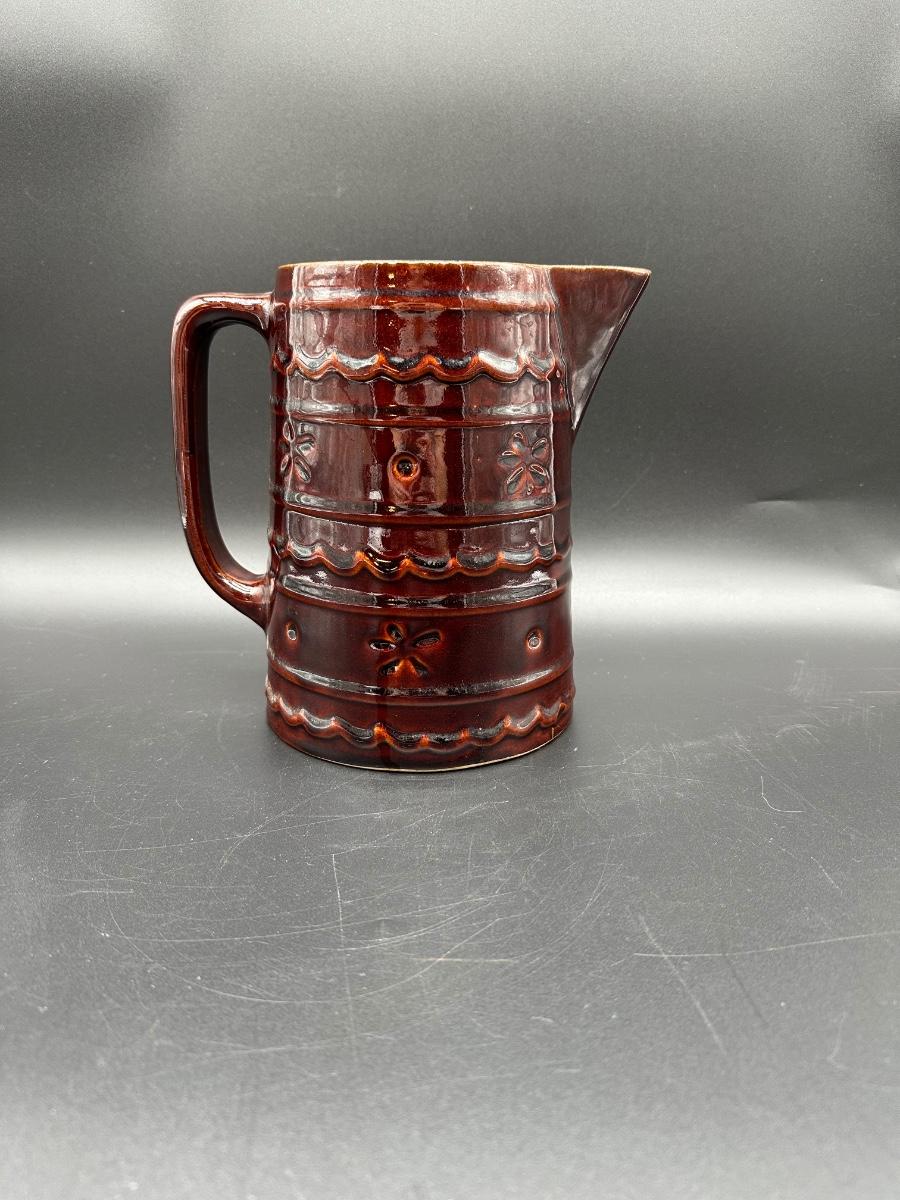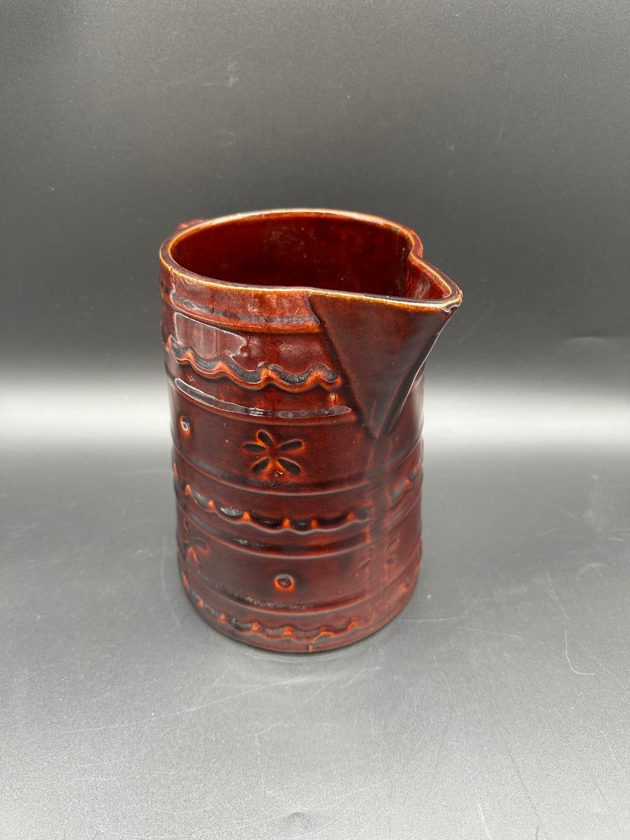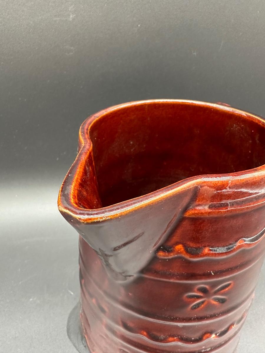 This is a solid mid-century American pottery piece featuring the rich chocolate brown drip glaze over raised banded detailing with subtle floral accents. A great addition to a farmhouse kitchen, primitive decor, or McCoy collection.