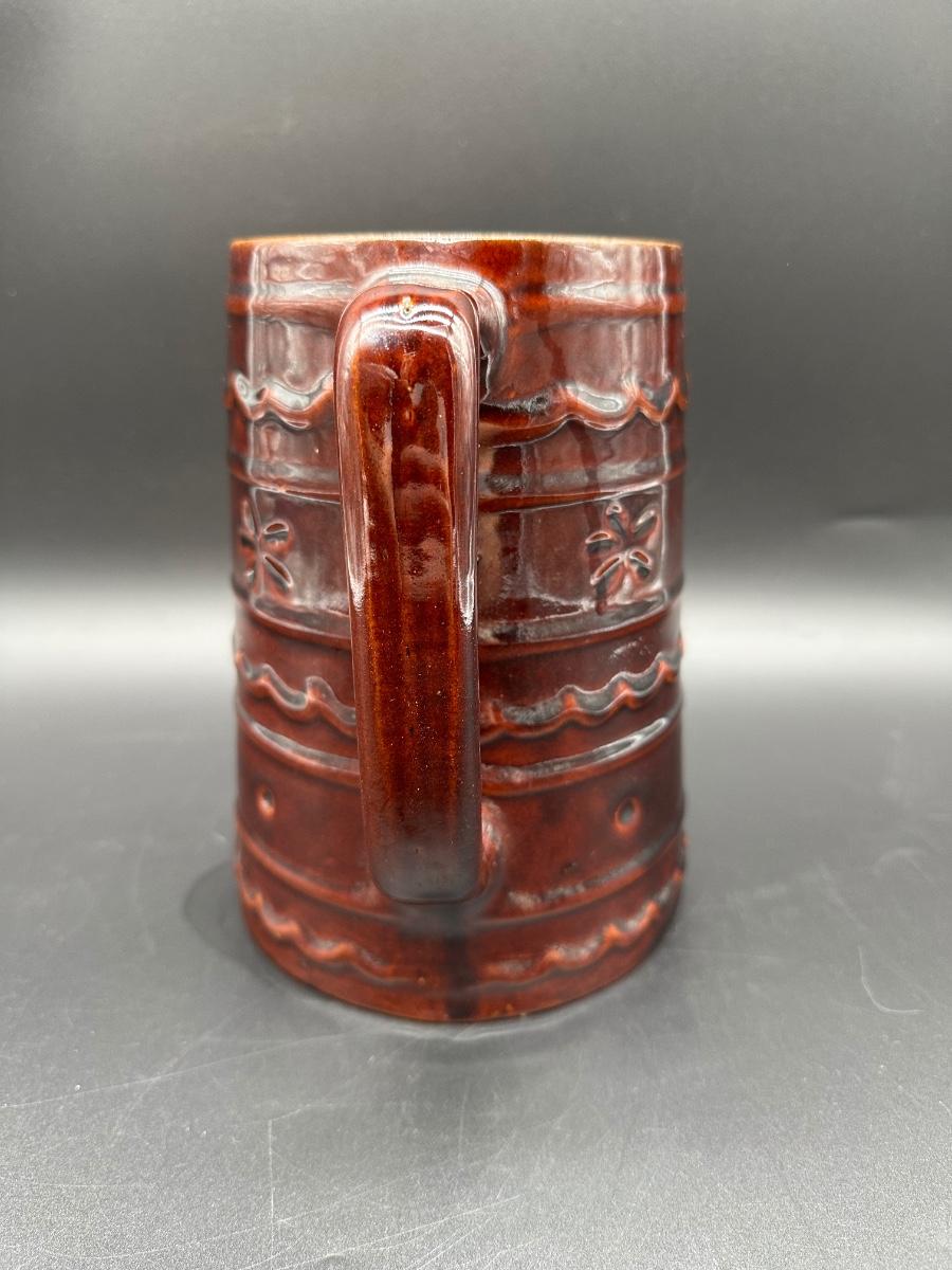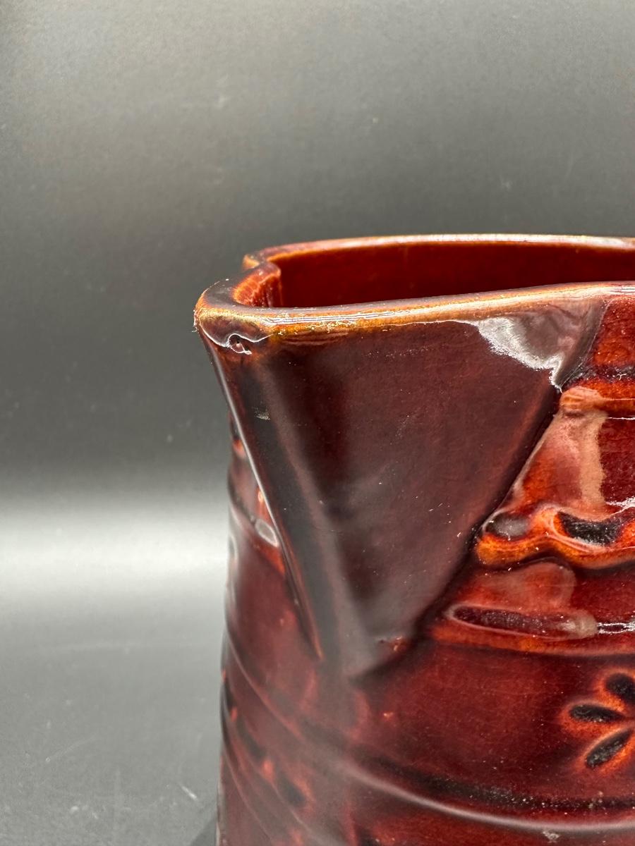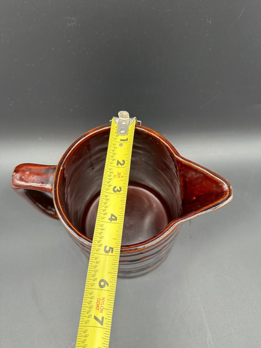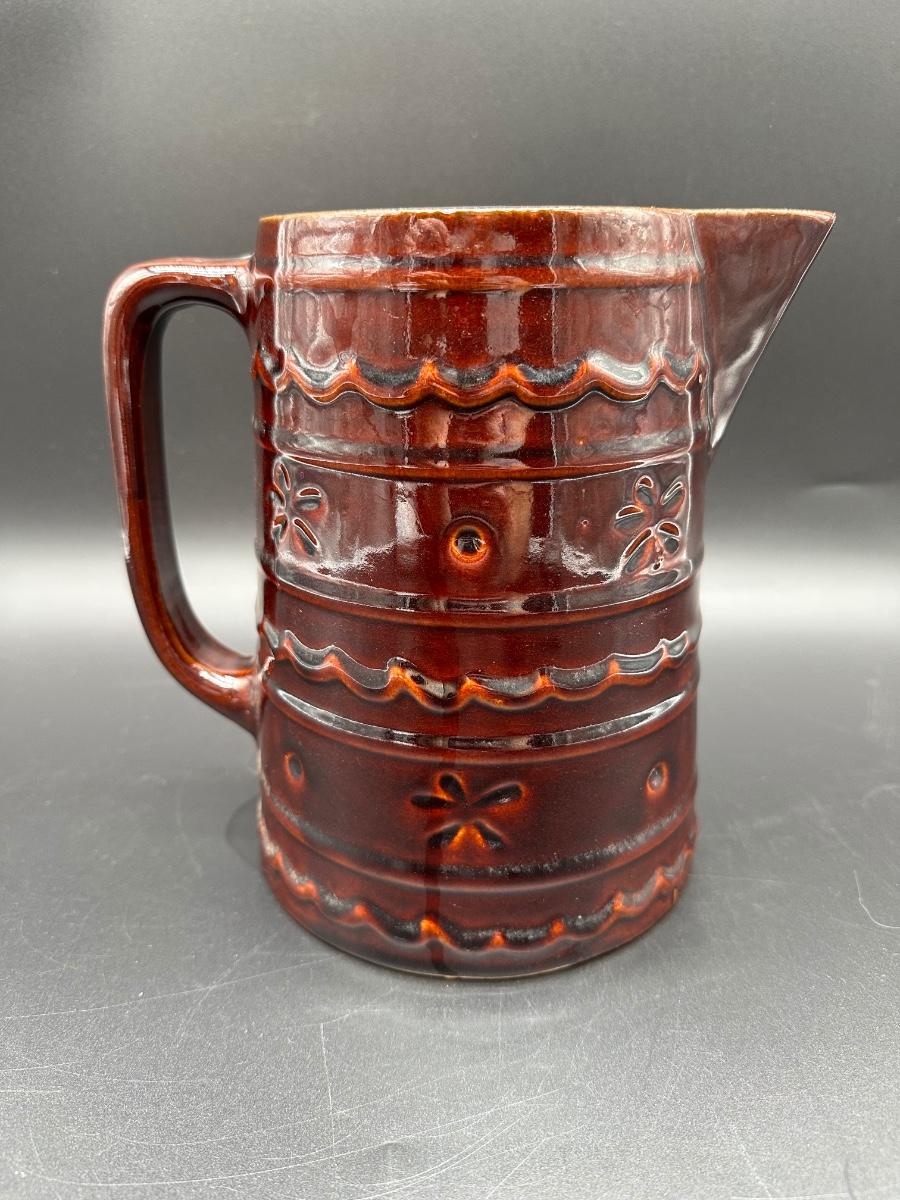 This is a solid mid-century American pottery piece featuring the rich chocolate brown drip glaze over raised banded detailing with subtle floral accents. A great addition to a farmhouse kitchen, primitive decor, or McCoy collection.