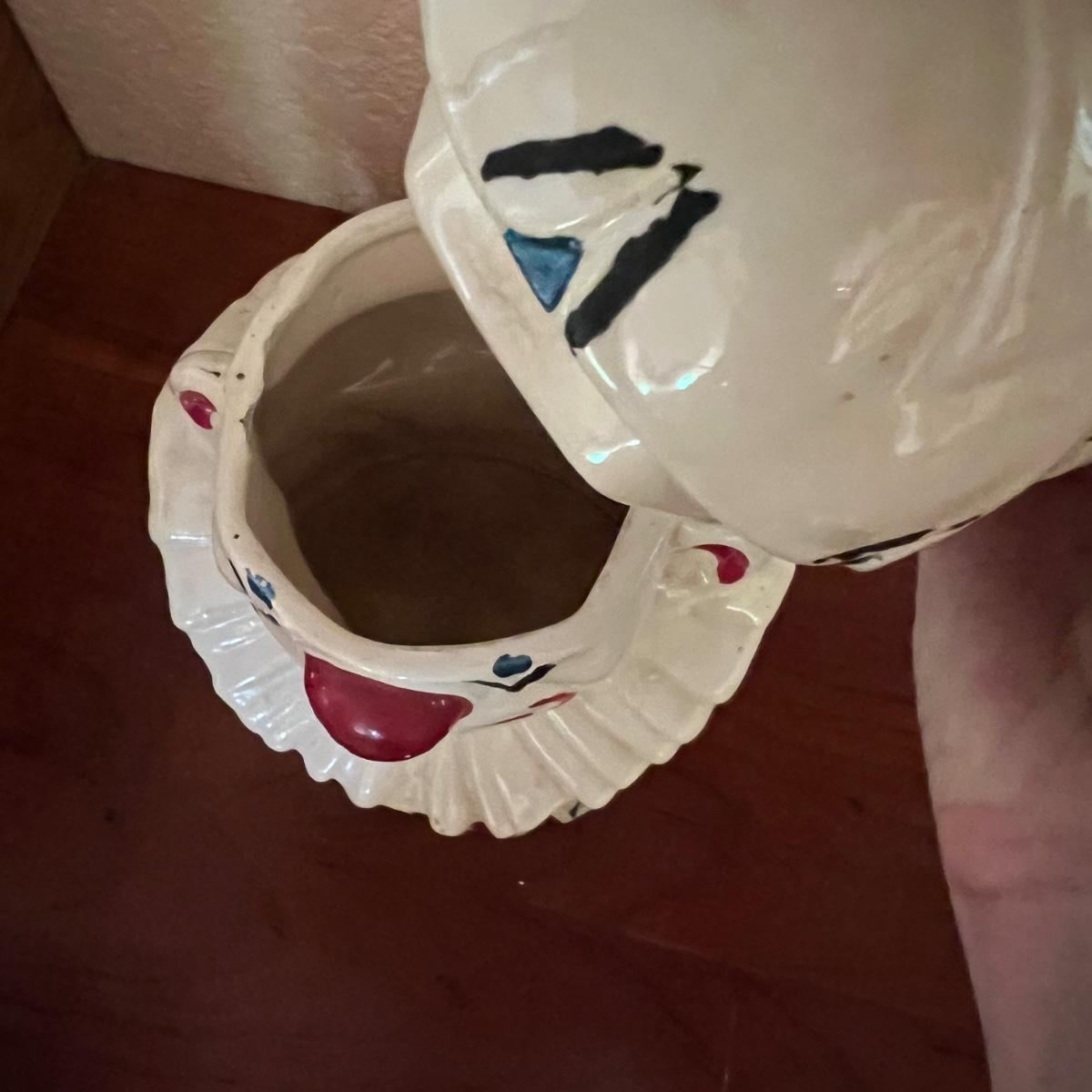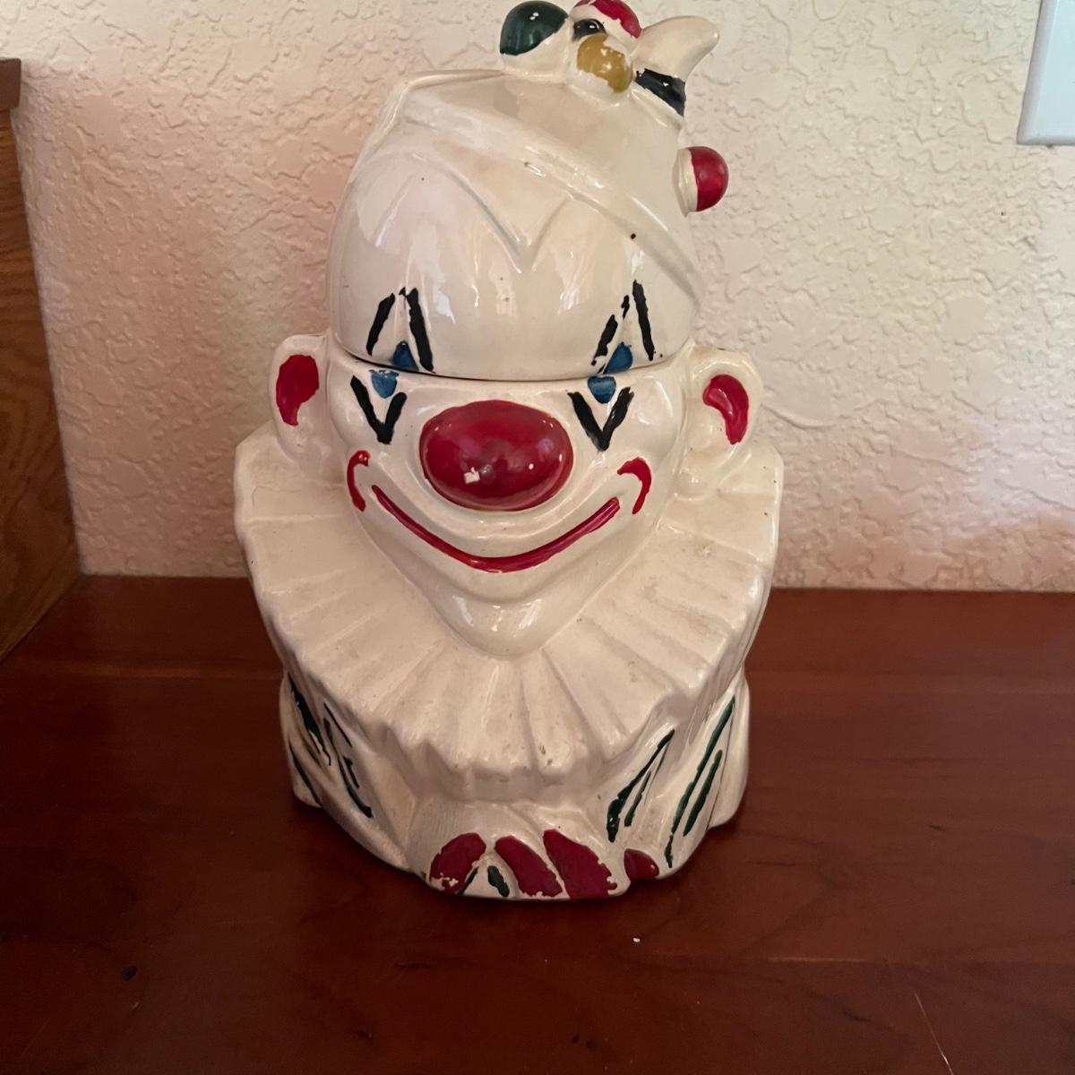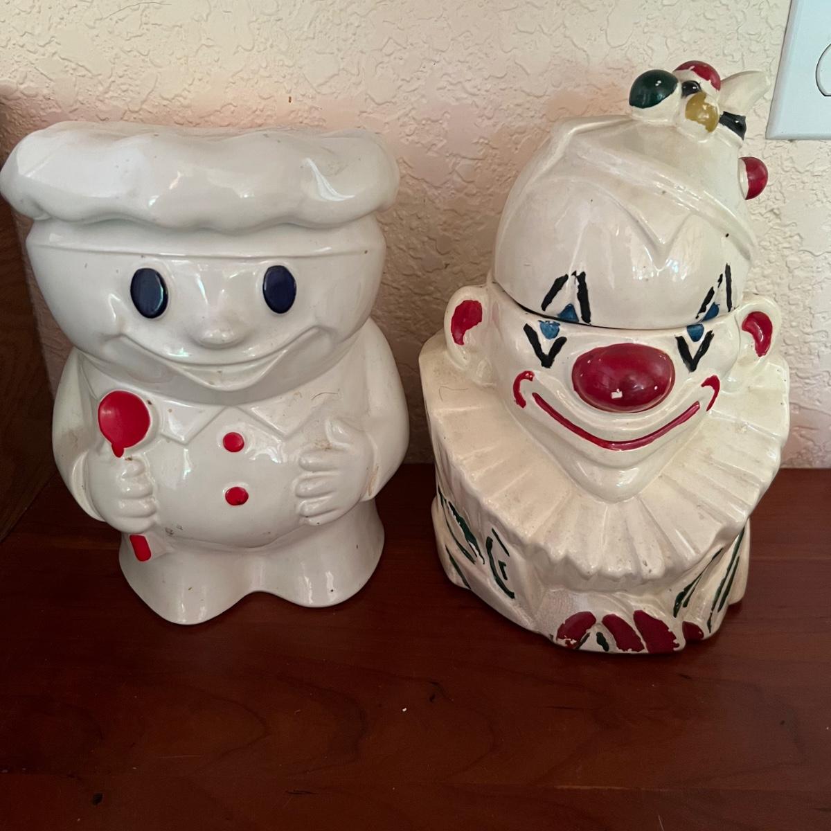 Bob the Baker and Clown McCoy ceramic cookie jars; note that there is only the McCoy makers mark on the Clown cookie jar. The other has the number 185. Some paint has rubbed off here and there on the clown jar, see images.
