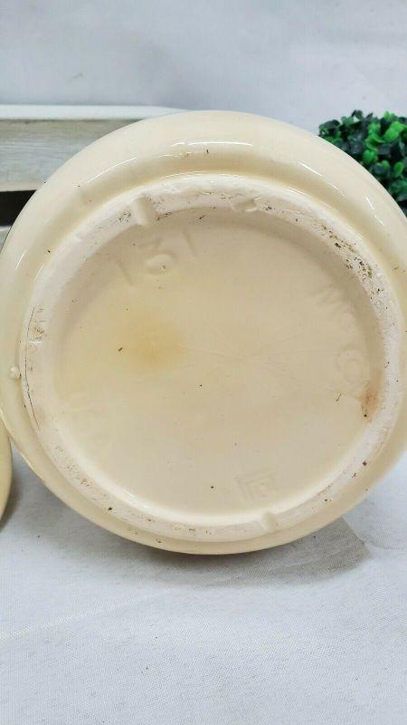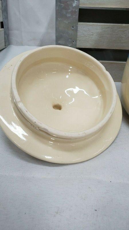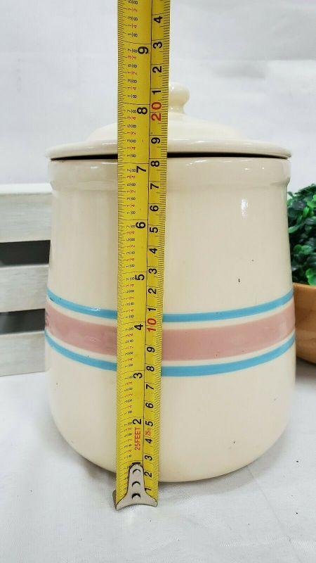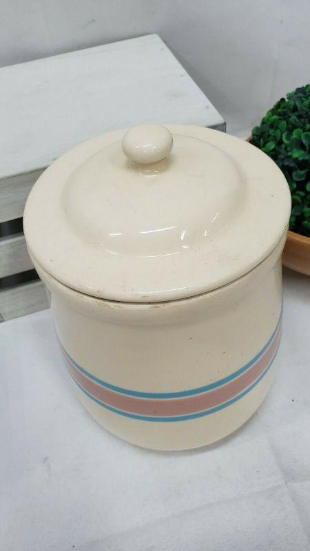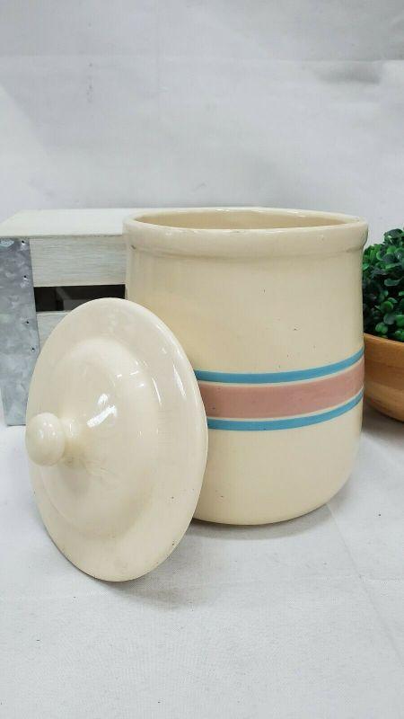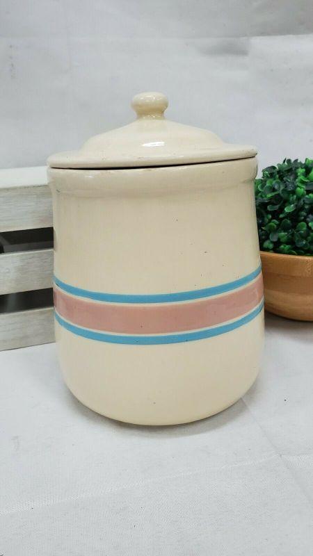 Vintage McCoy Crock Canister w/Lid, Cream Pink Blue Striped, 7 3/4"x6", Pottery