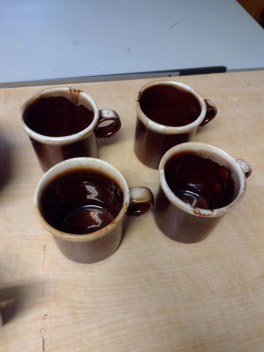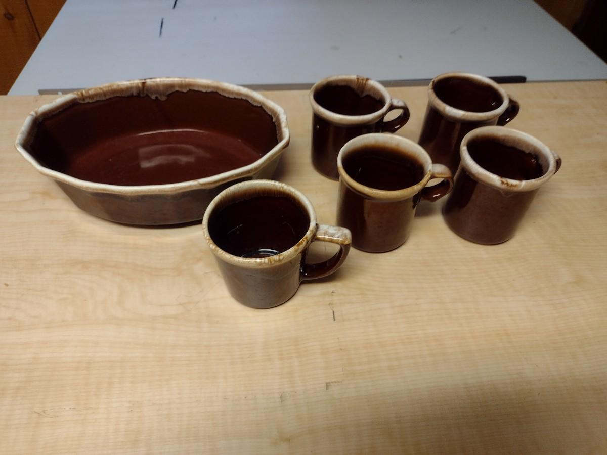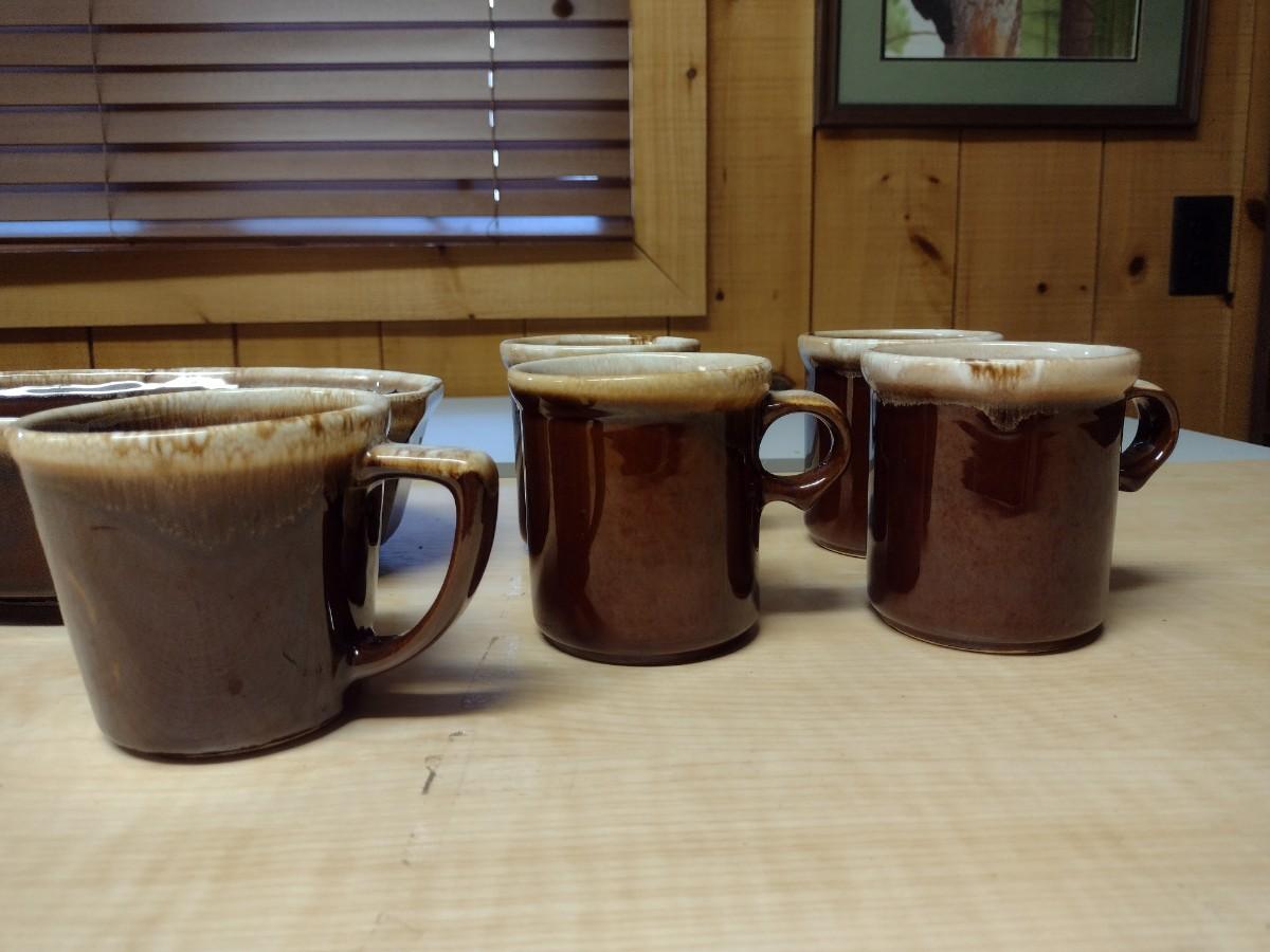 Vintage McCoy Glazed Dinnerware. Four coffee mugs appear to match. All in used condition - please expect occasional chip or crack. PLEASE NOTE:. Due to no internet connection or wireless service, all invoices must be prepaid via PayPal, Stripe, or Zelle prior to arrival at pick up. Exact change cash onsite is acceptable but absolutely no debit or credit cards at time of pick up.