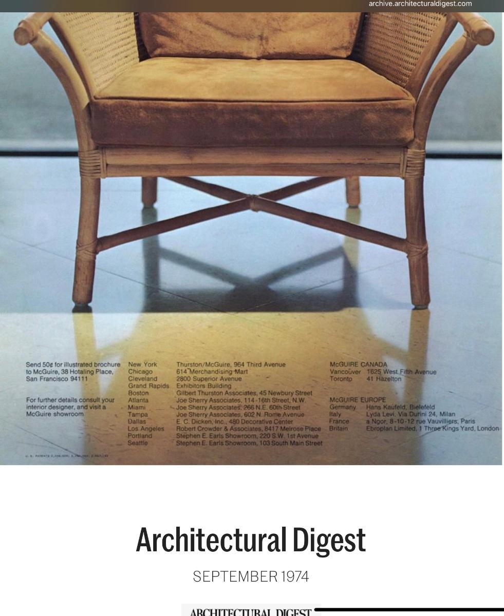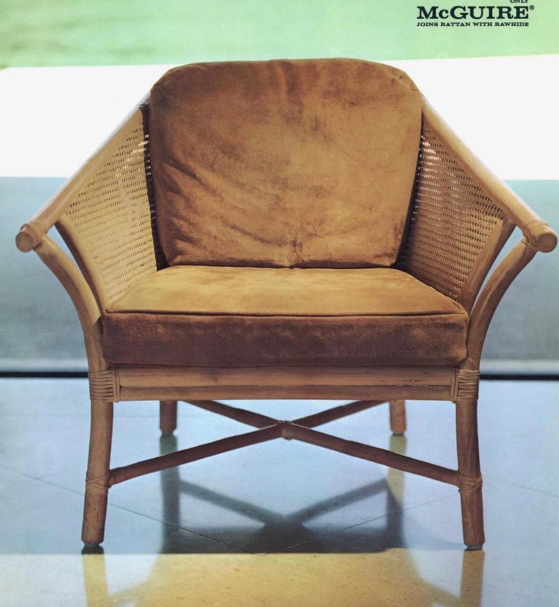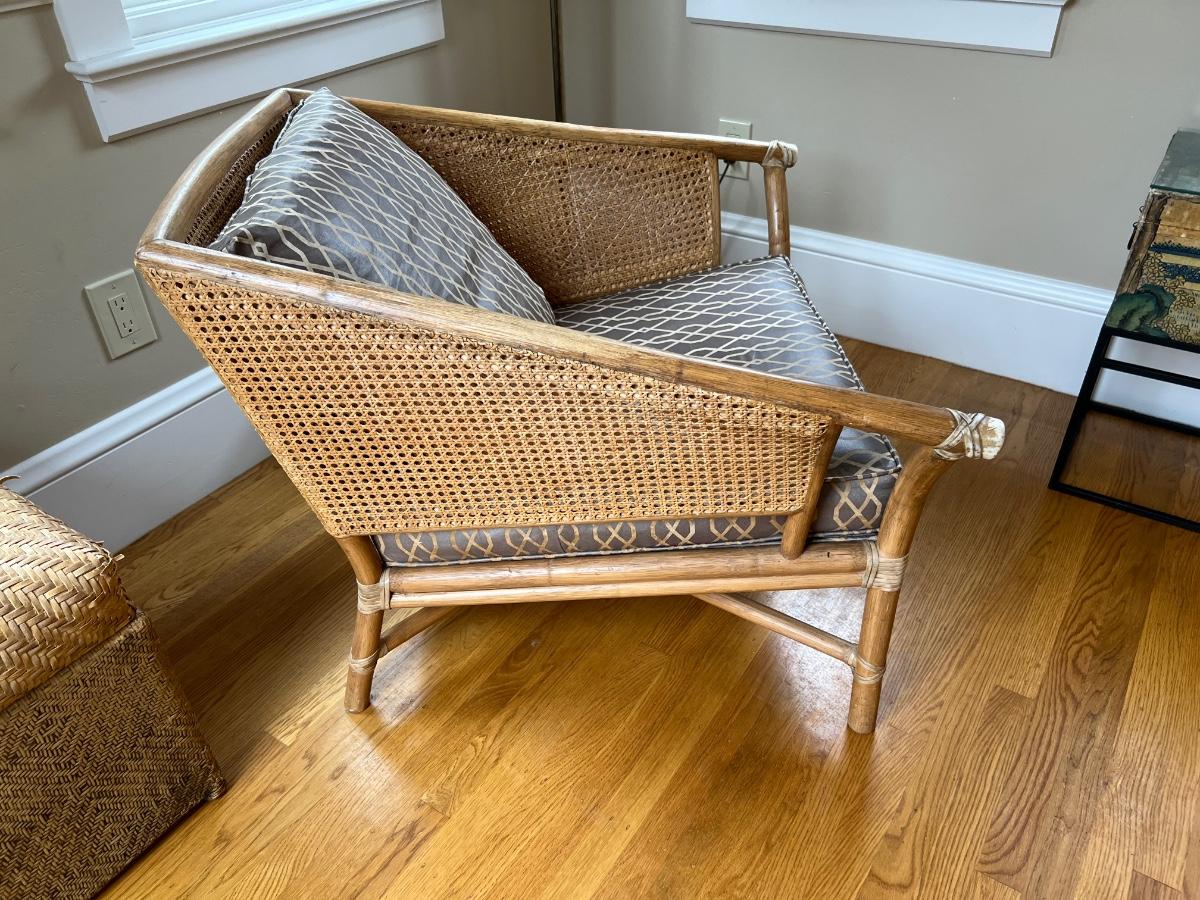 Vintage McGuire bamboo and rattan arm chair with cushion and pillow. Featured in Architectural Digest, September 1974