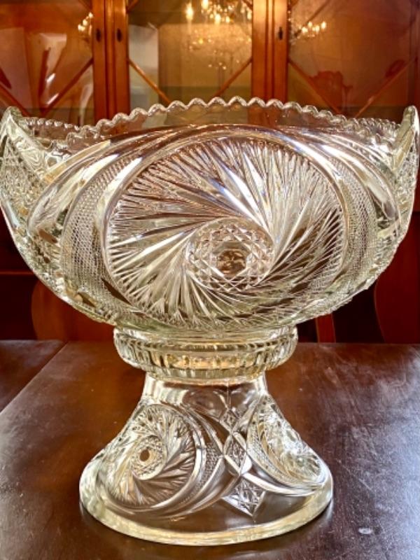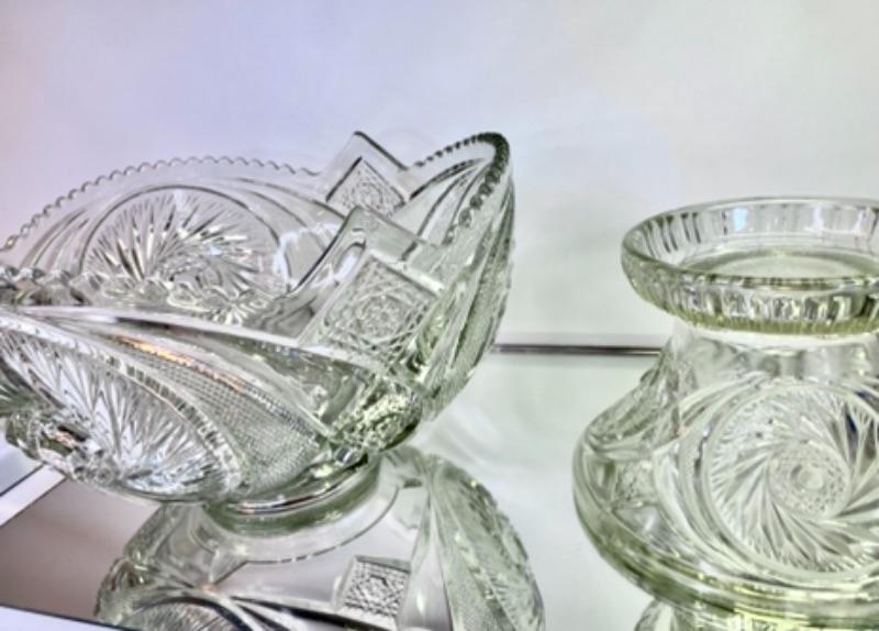 Gorgeous old bowl on stand - by McKee glass in the beautiful huge pinwheel Aztec pattern with scallops and points. Measures 12.5 tall , 8” just bowl, 13.5” wide. Luminous, no flaws of note.