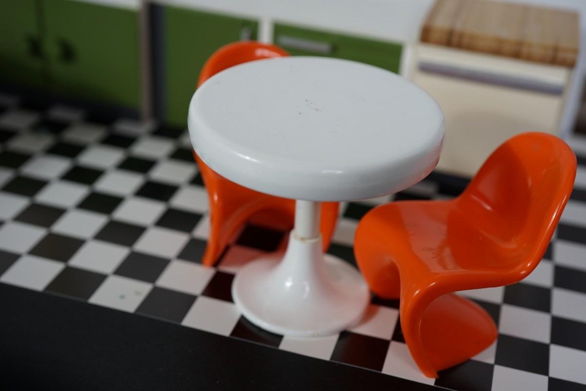 the doors open except dishwasher. The range door opens. the plexiglass style smoke colored table and four chairs, plastic tulip style table and two orange plastic chairs is classic,