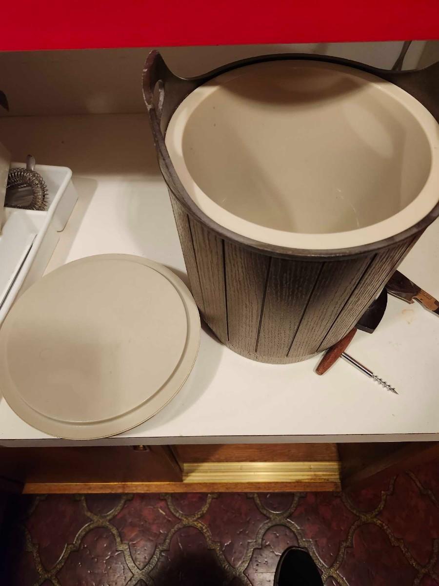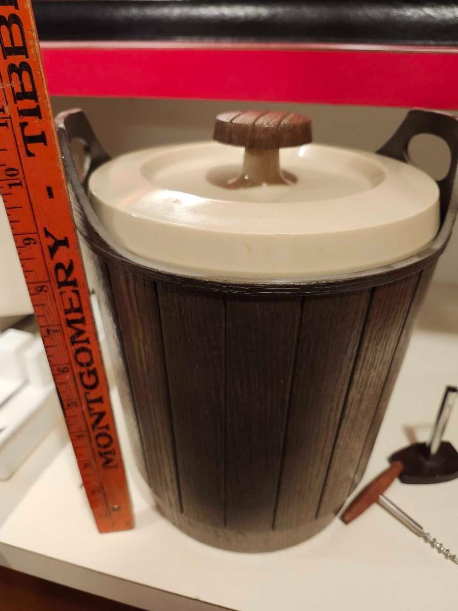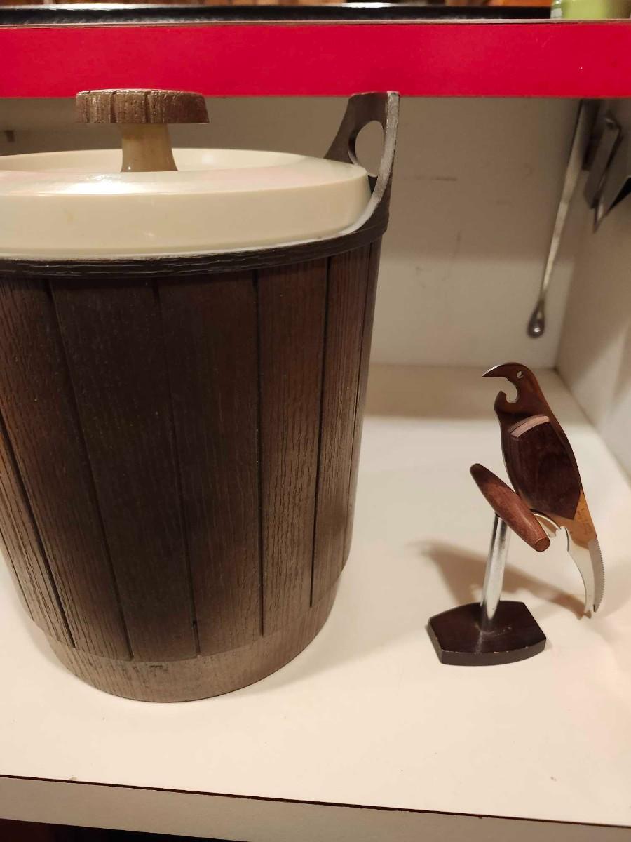 Vintage 1970's Bar Set includes bird with can and bottle opener, bar knife (tail) and cork screw as perch. Made of stainless steel with rosewood. This is such unique barware with a cool vintage vibe Have here a Vintage RUBBERMAID 2478 INSULATED ICE BUCKET .Has a wood grain type finish with beige inside.