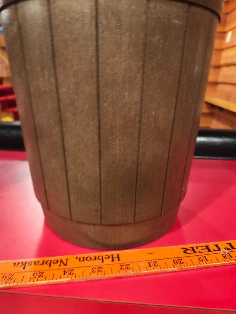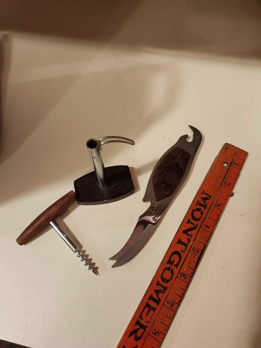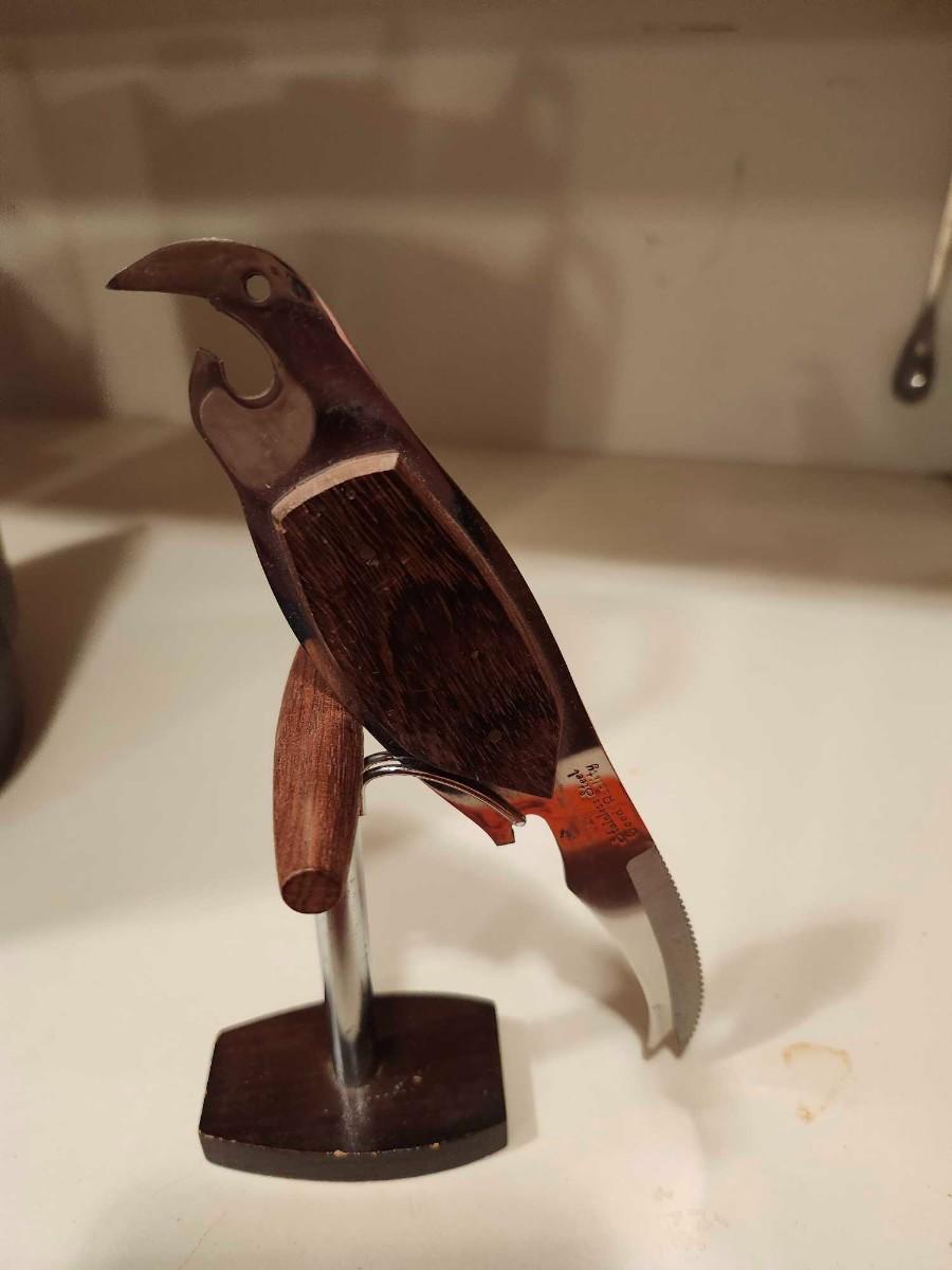 Vintage 1970's Bar Set includes bird with can and bottle opener, bar knife (tail) and cork screw as perch. Made of stainless steel with rosewood. This is such unique barware with a cool vintage vibe Have here a Vintage RUBBERMAID 2478 INSULATED ICE BUCKET .Has a wood grain type finish with beige inside.