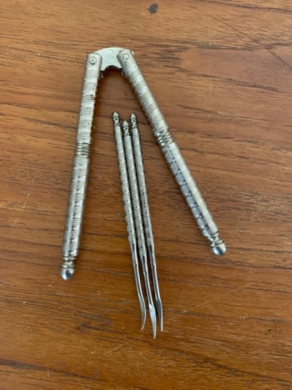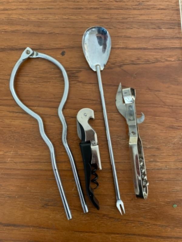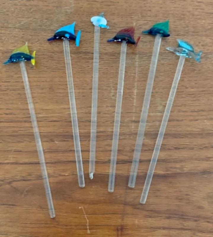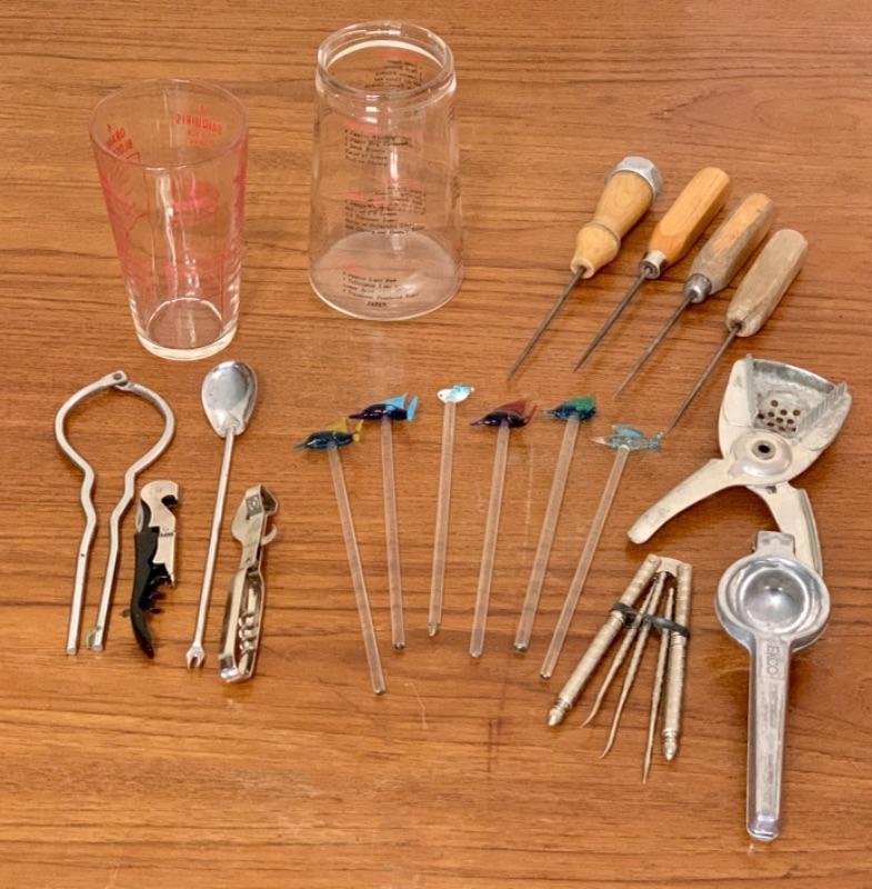 Cocktail recipes glass and jar (no lid), ice picks, openers, cocktail spoon with fork, citrus squeezers, nut cracker and picks and glass swizzle sticks with fish (white whale appears to have piece chipped near nose).
