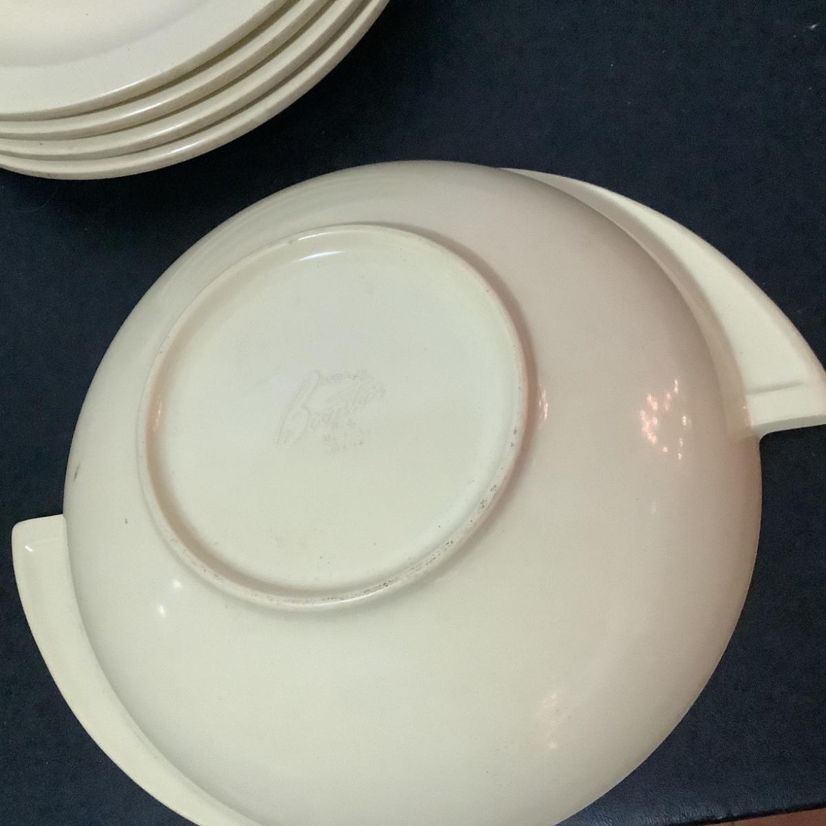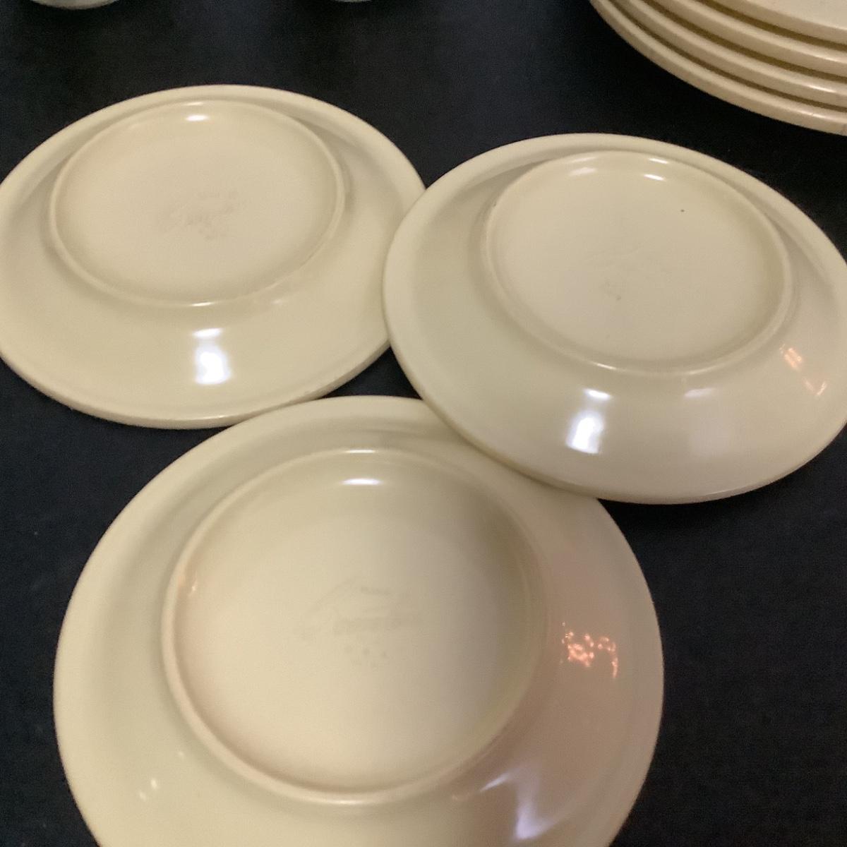 All items are sold as is, as found in the estate. Please see all photos for content, measurements and condition. See auction Terms & Conditions for bidding details. This lot includes a total of 12 pieces; 4 dinner plates, 3 smaller size plates, 4 coffee/tea cups and 1 winged divider bowl.