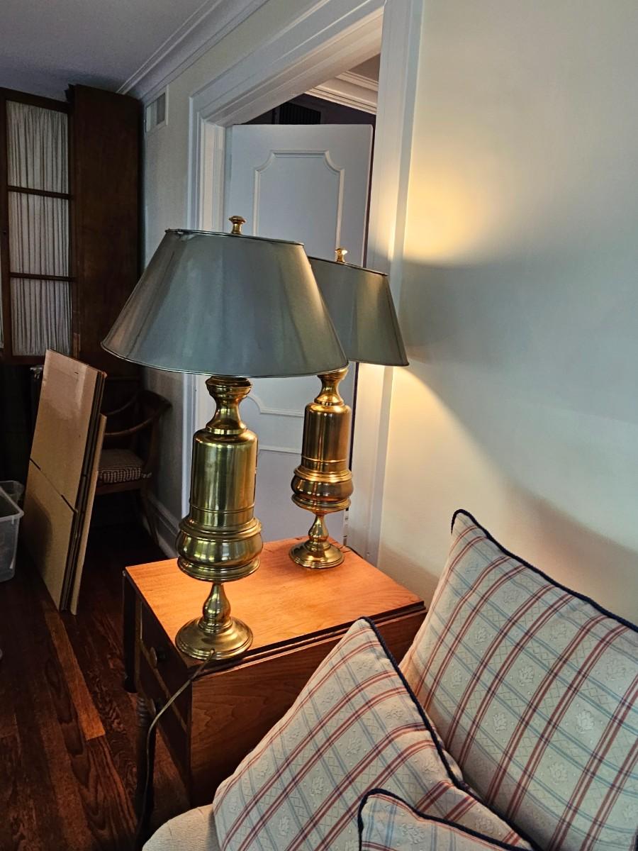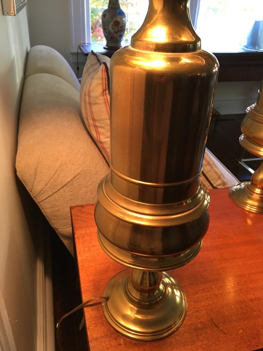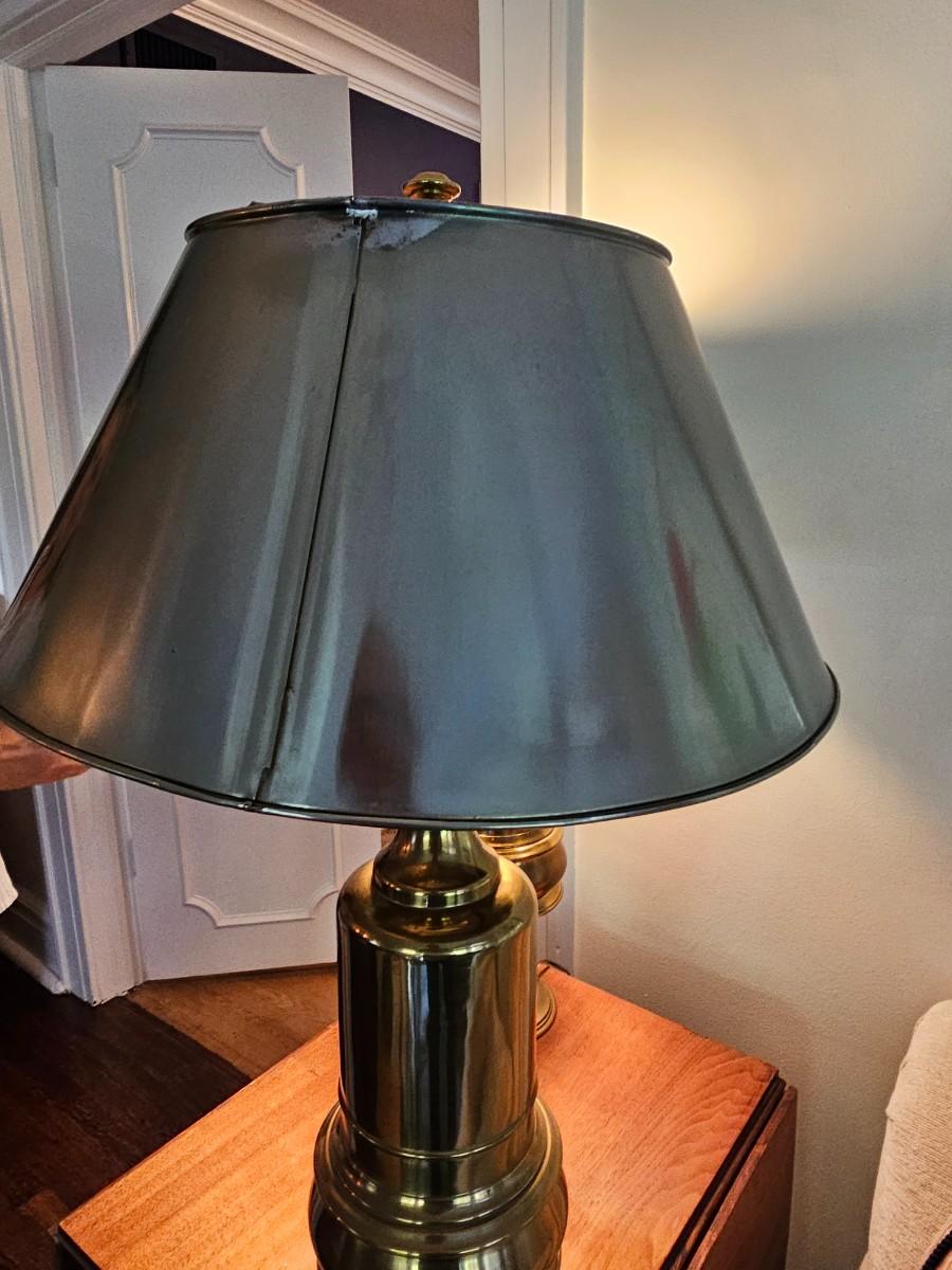 Lovely pair of unique MCM brass table lamps. Double light bulbs. Both bases and shades of lamps are brass. Solid. Shades have some light signs of wear as shown in photos, but in overall excellent condition.