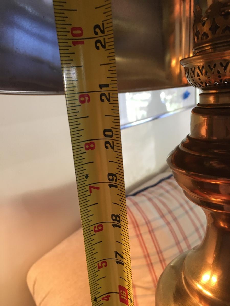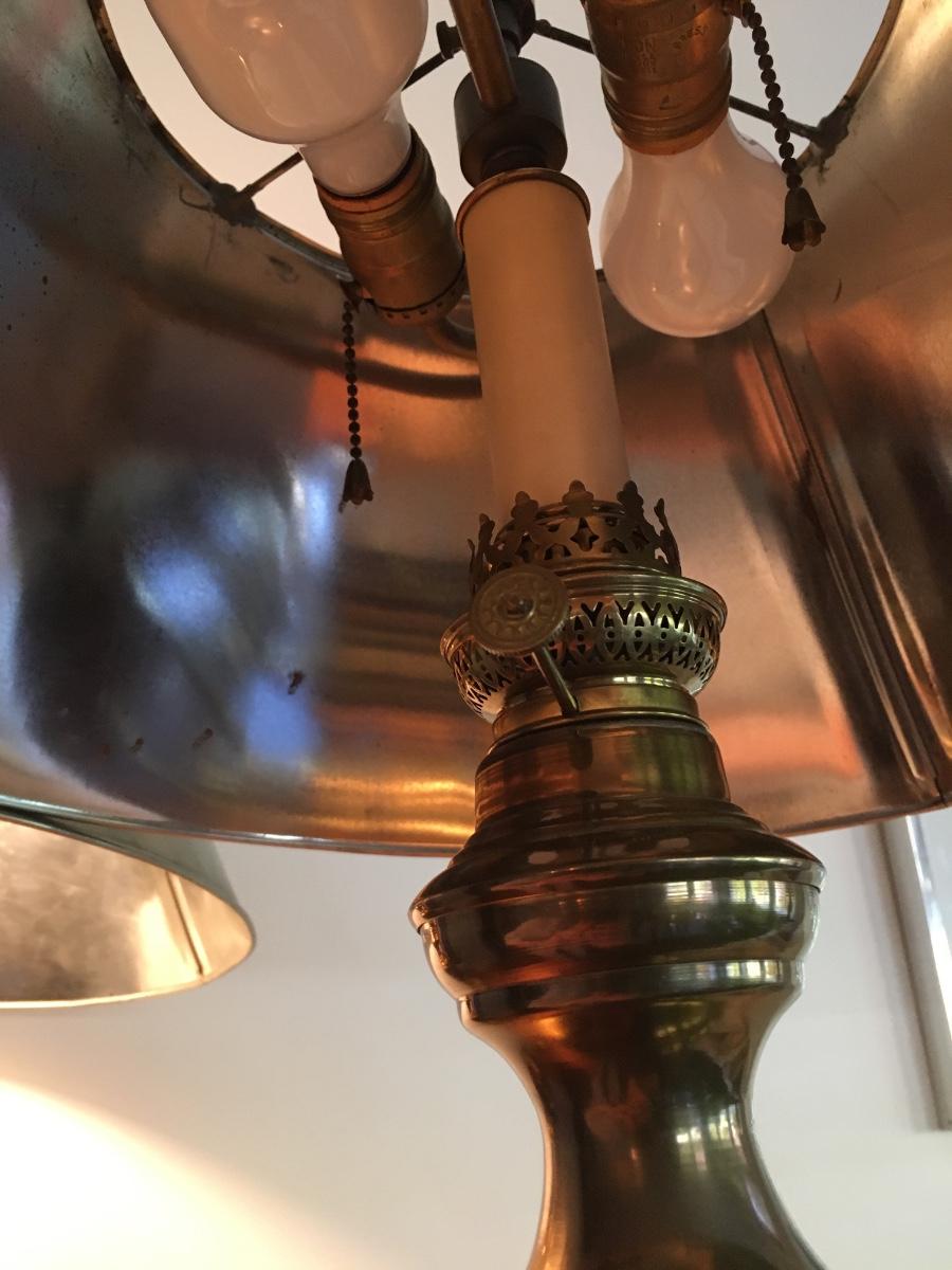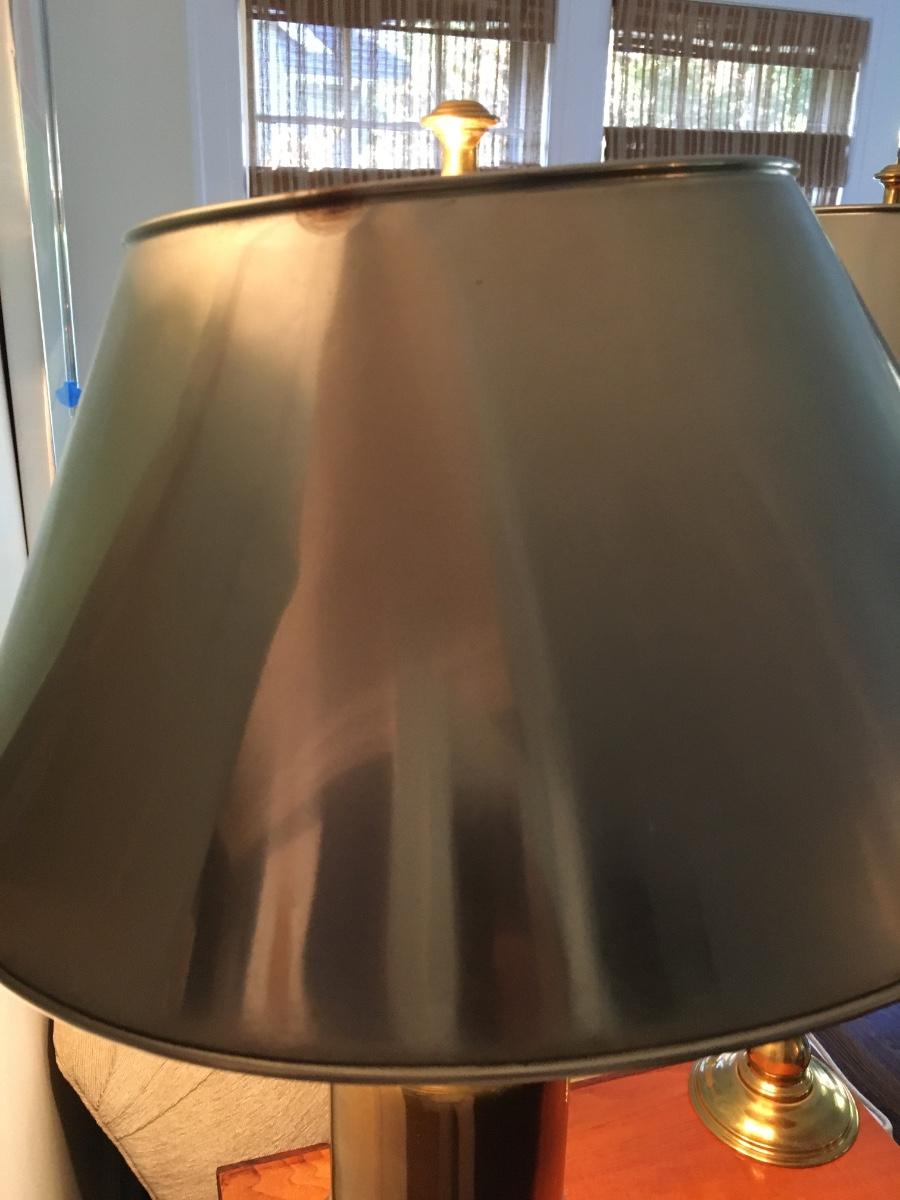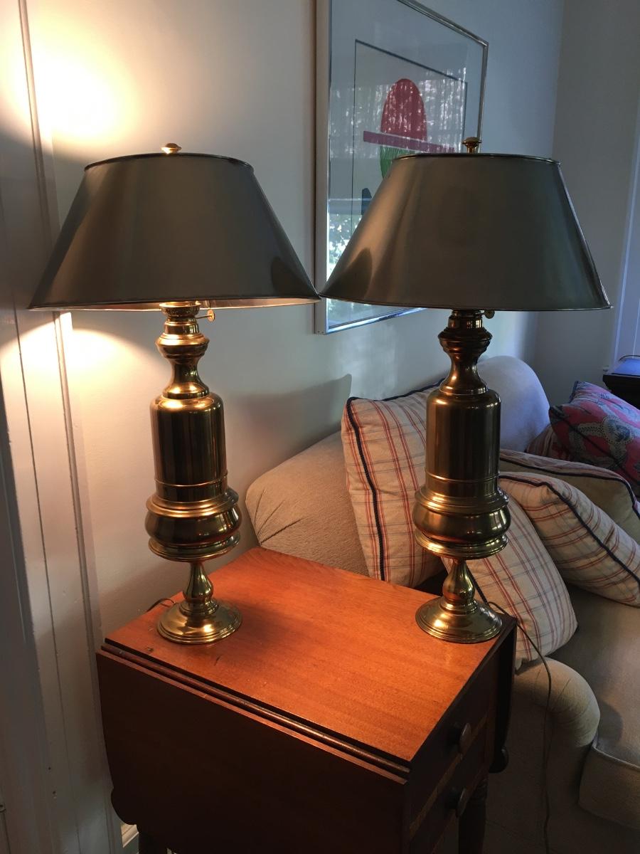 Lovely pair of unique MCM brass table lamps. Double light bulbs. Both bases and shades of lamps are brass. Solid. Shades have some light signs of wear as shown in photos, but in overall excellent condition.