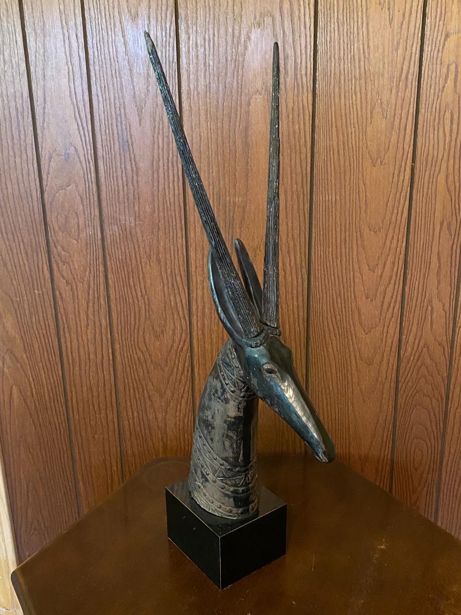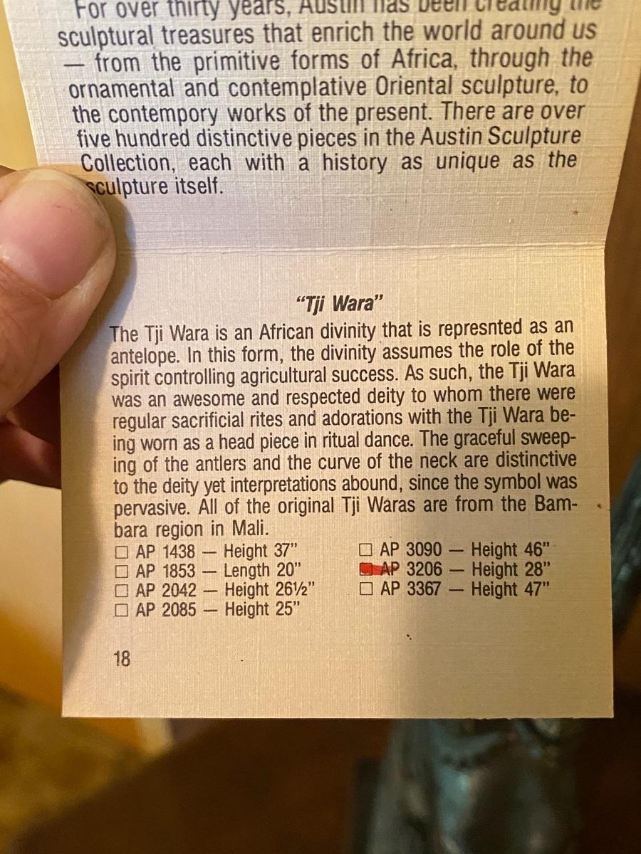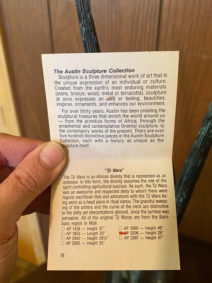 Vintage Carved Wood Antelope Tji Wara Figurine Statue Austin Sculpture. 28" tall. Nicely done. Not one solid piece, antlers can be removed, there is a broken opening for one of them needs a little glue. Has info card attached to the bottom.