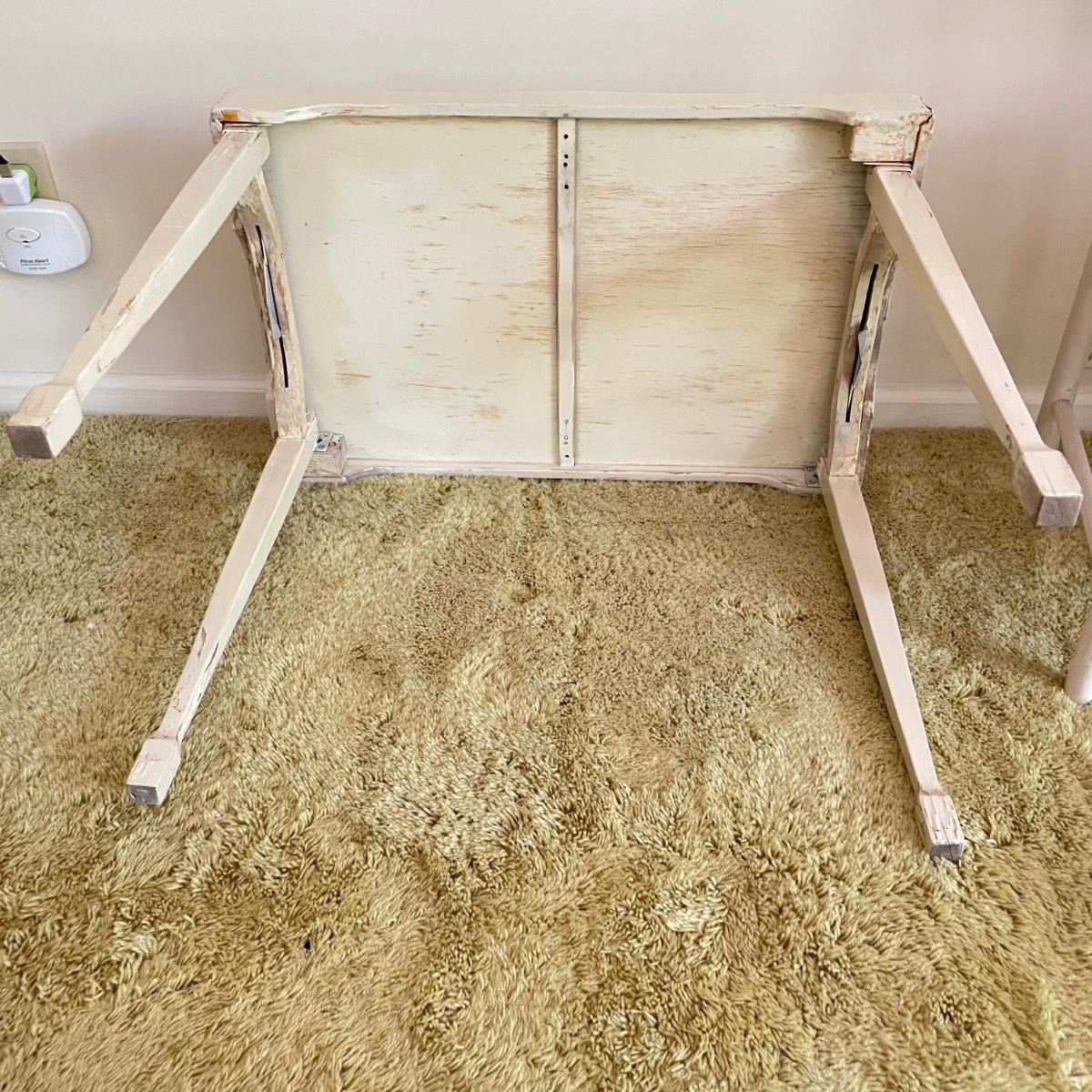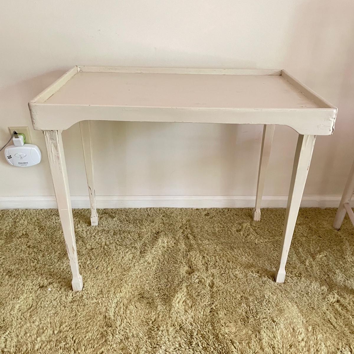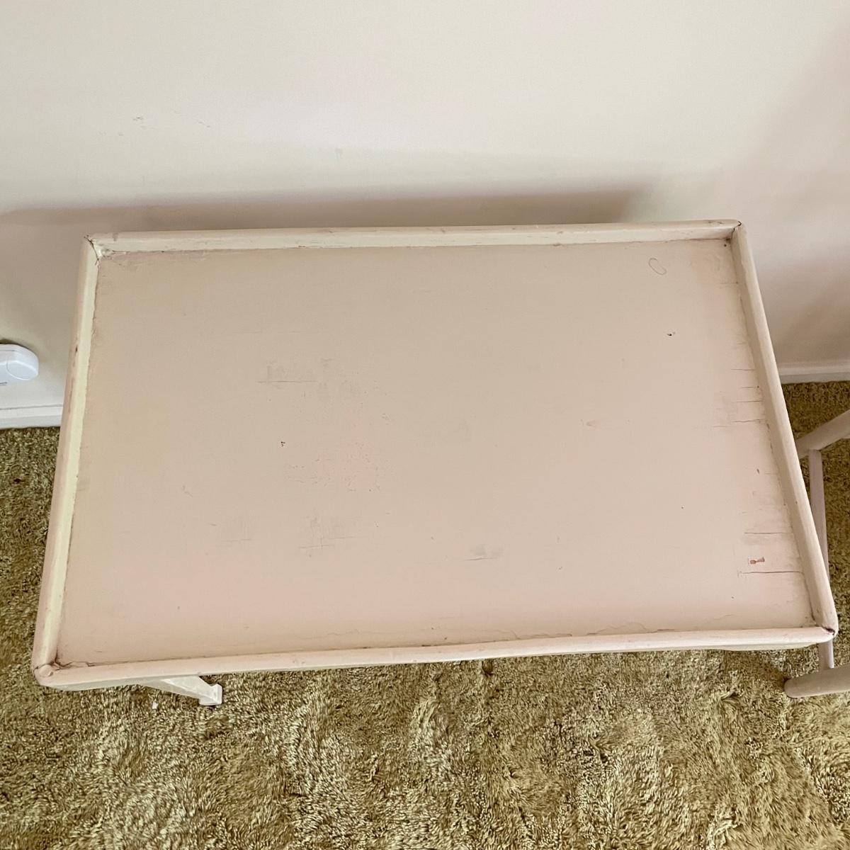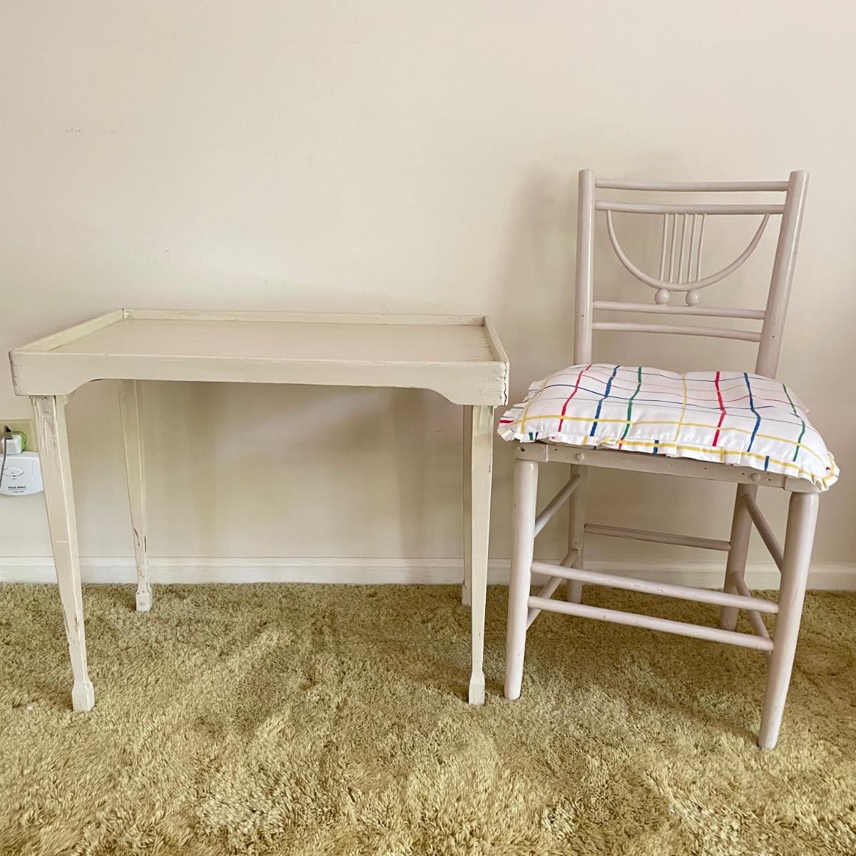 White painted wooden duo (slightly ivory) with a portable table and an MCM style chair. The seat has a neat star pattern punch out and thick colorful cushion. Chair measures 17” x 16” x 33.5” with a seat height at 18”. The table’s legs fold in for small and convenient transport. Table measures 27” x 17” x 23”. It is slightly wobbly on the plush carpet it is photographed on, but feels sturdy when opening and closing the legs. See images. Local pick up only.