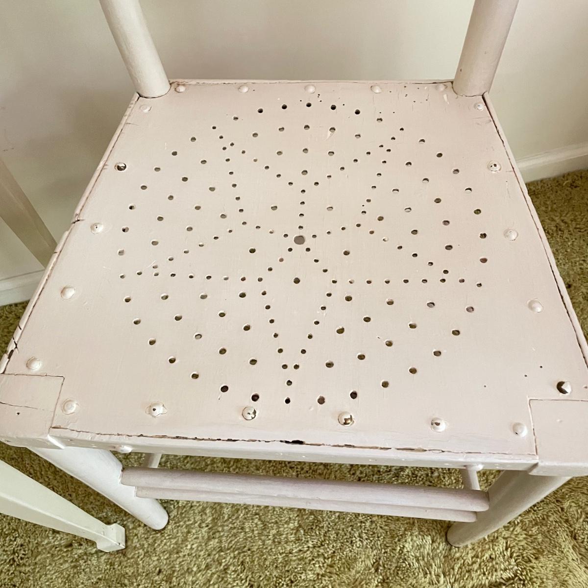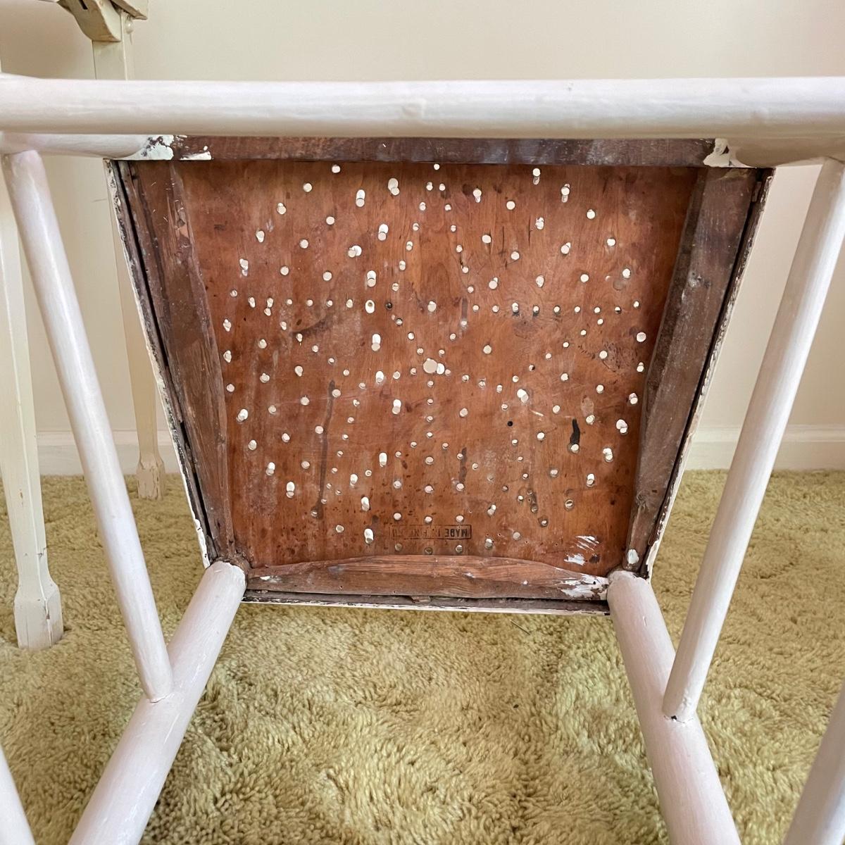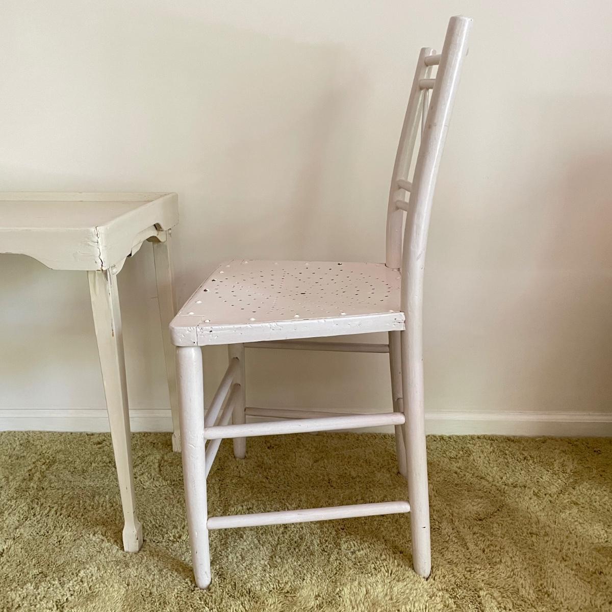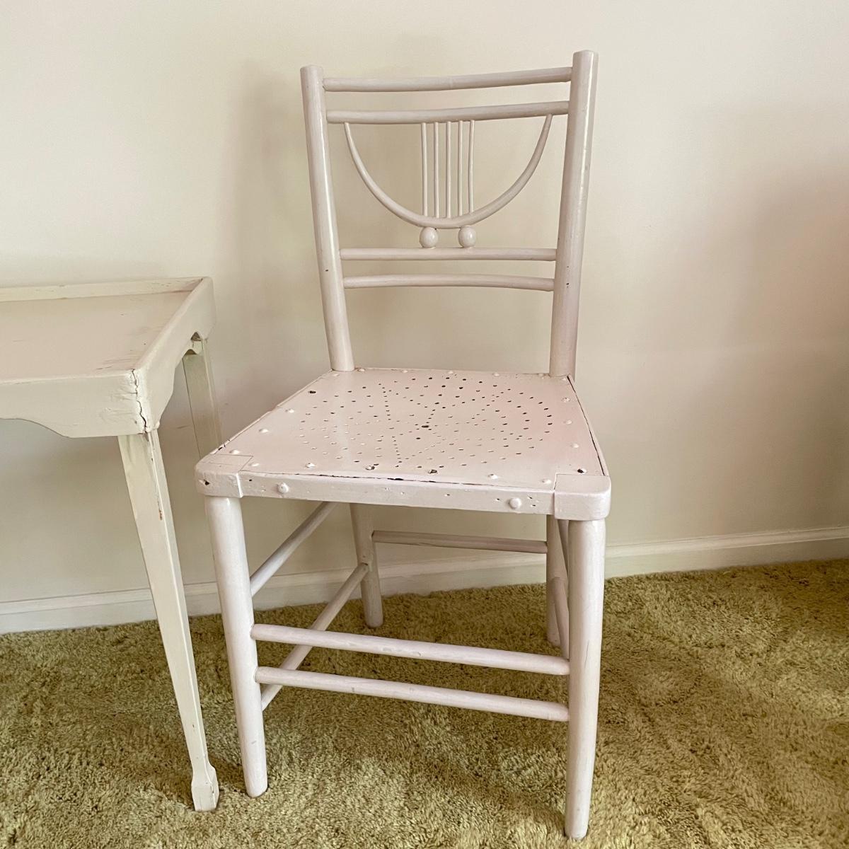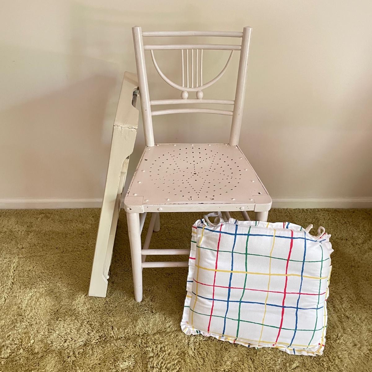 White painted wooden duo (slightly ivory) with a portable table and an MCM style chair. The seat has a neat star pattern punch out and thick colorful cushion. Chair measures 17” x 16” x 33.5” with a seat height at 18”. The table’s legs fold in for small and convenient transport. Table measures 27” x 17” x 23”. It is slightly wobbly on the plush carpet it is photographed on, but feels sturdy when opening and closing the legs. See images. Local pick up only.