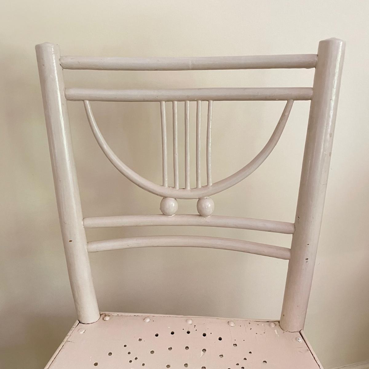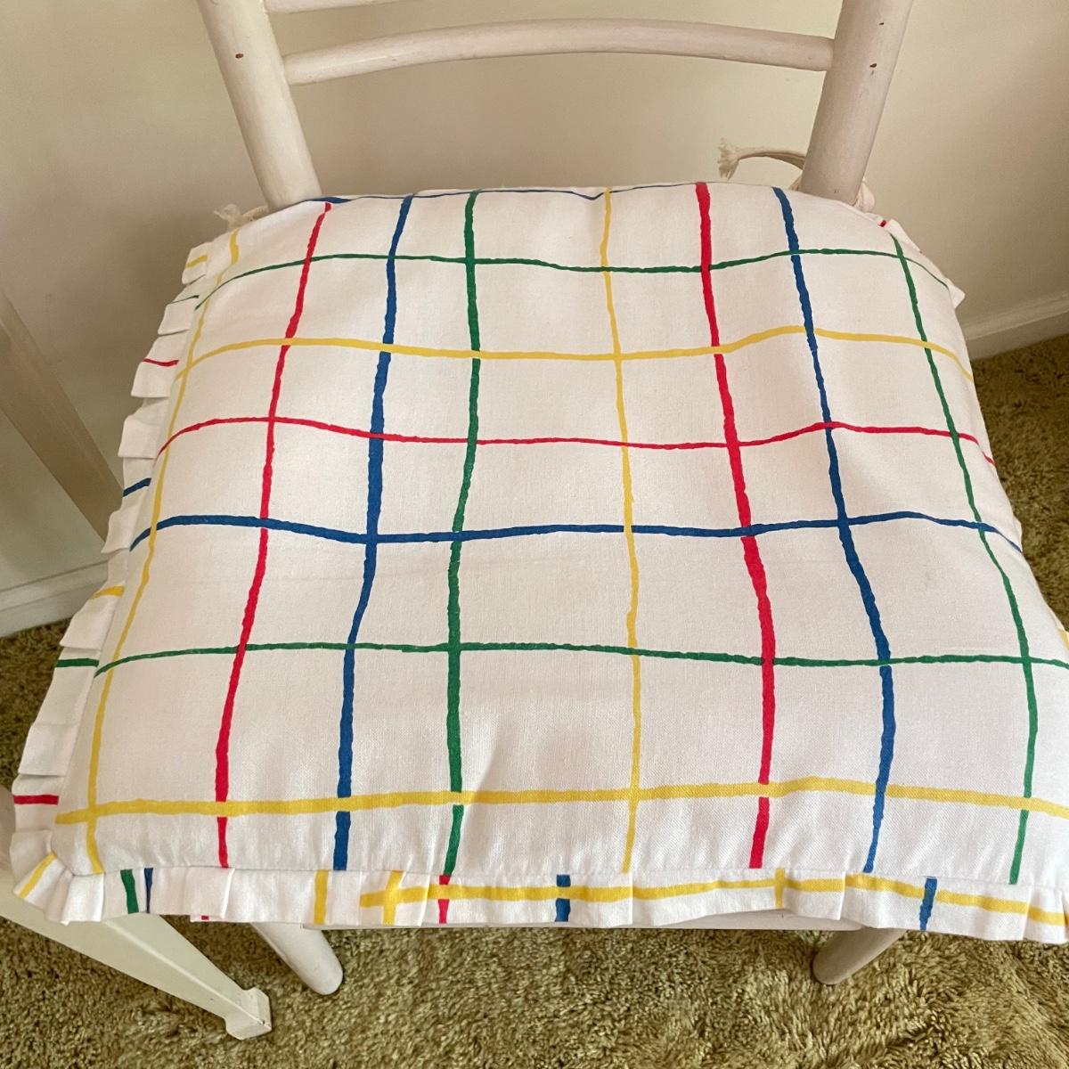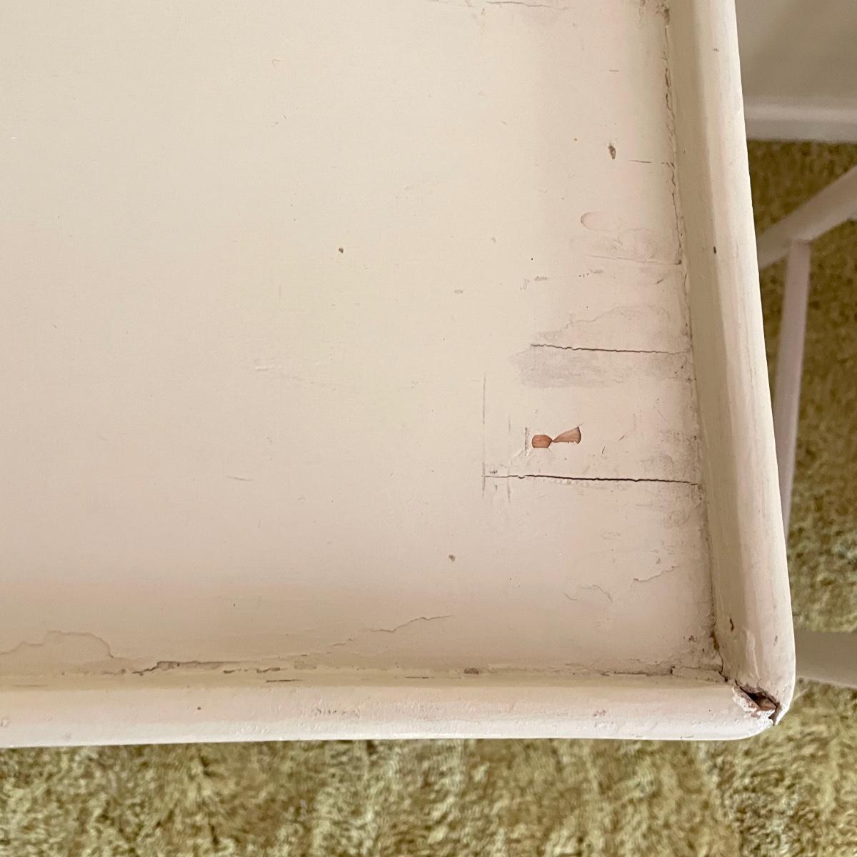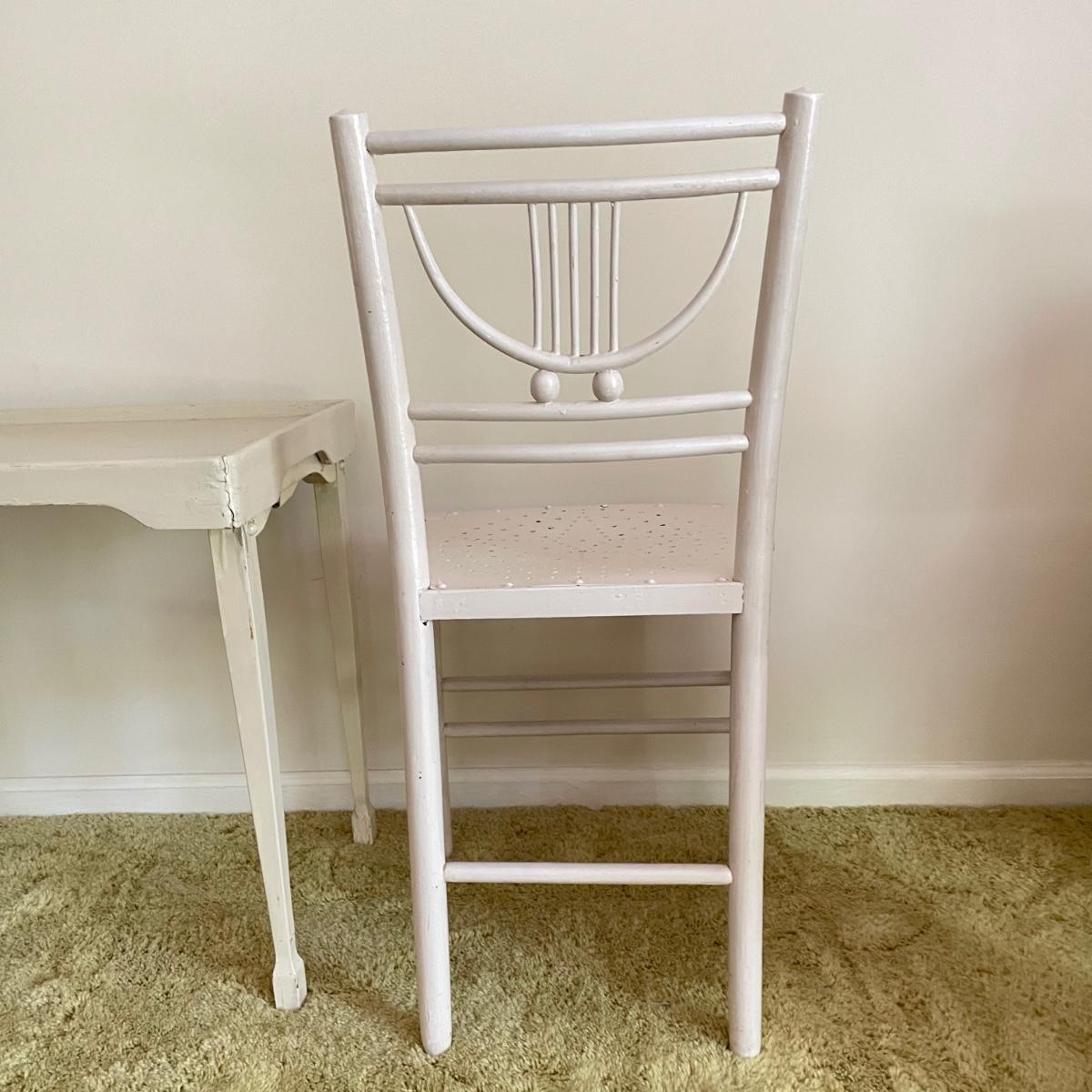 White painted wooden duo (slightly ivory) with a portable table and an MCM style chair. The seat has a neat star pattern punch out and thick colorful cushion. Chair measures 17” x 16” x 33.5” with a seat height at 18”. The table’s legs fold in for small and convenient transport. Table measures 27” x 17” x 23”. It is slightly wobbly on the plush carpet it is photographed on, but feels sturdy when opening and closing the legs. See images. Local pick up only.