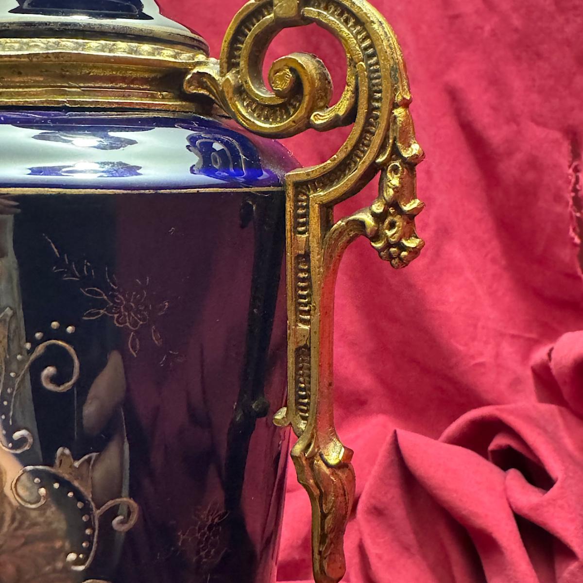 Vintage MCM Cobalt Blue Porcelain Urn Lamp – Hand-Painted Cherubs, Brass Base, Vintage 1950s