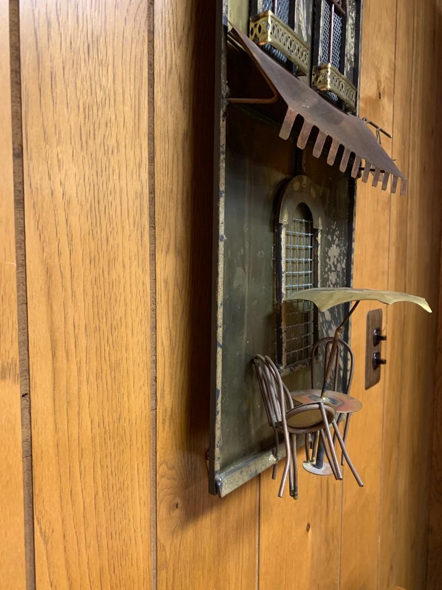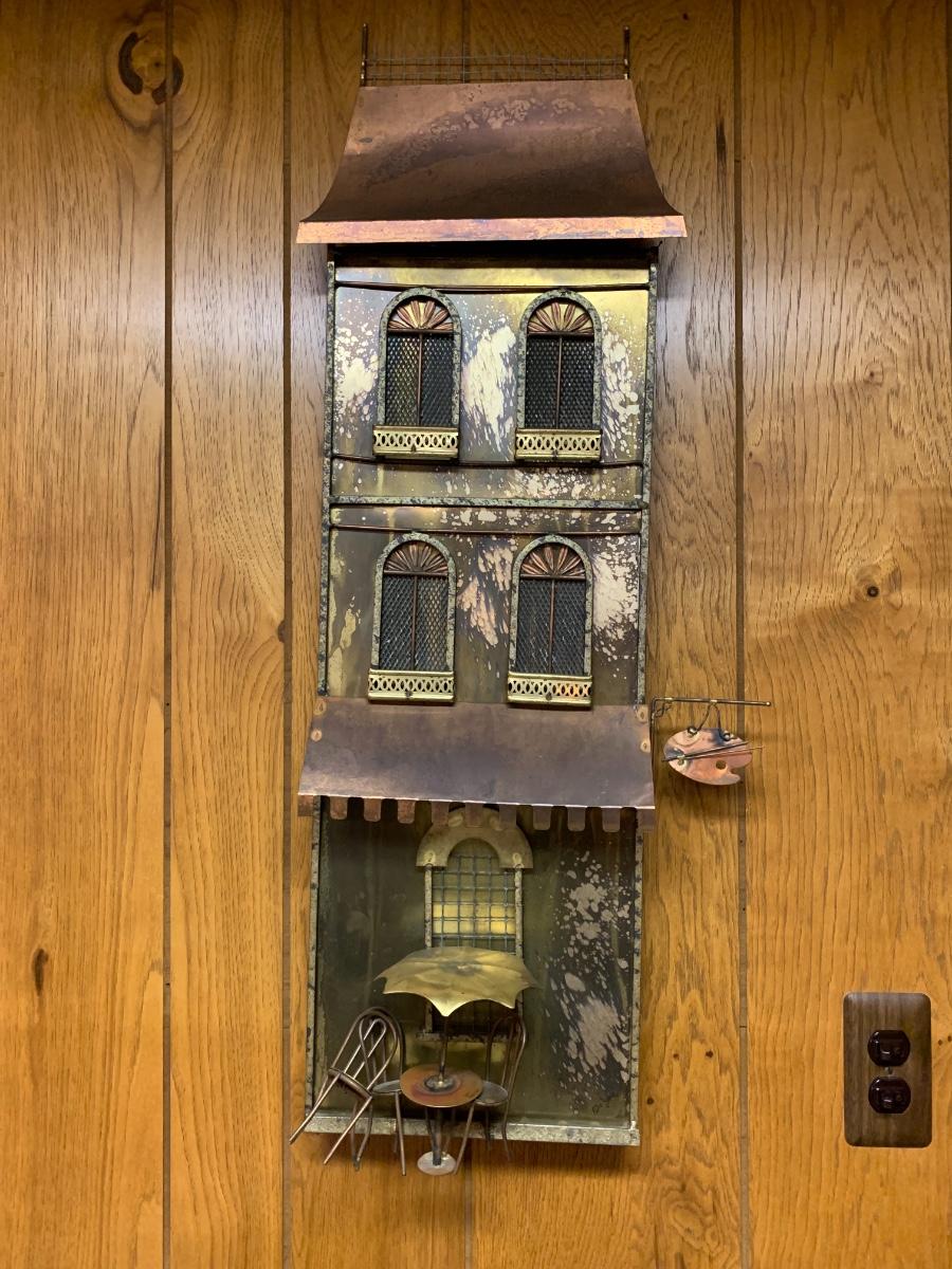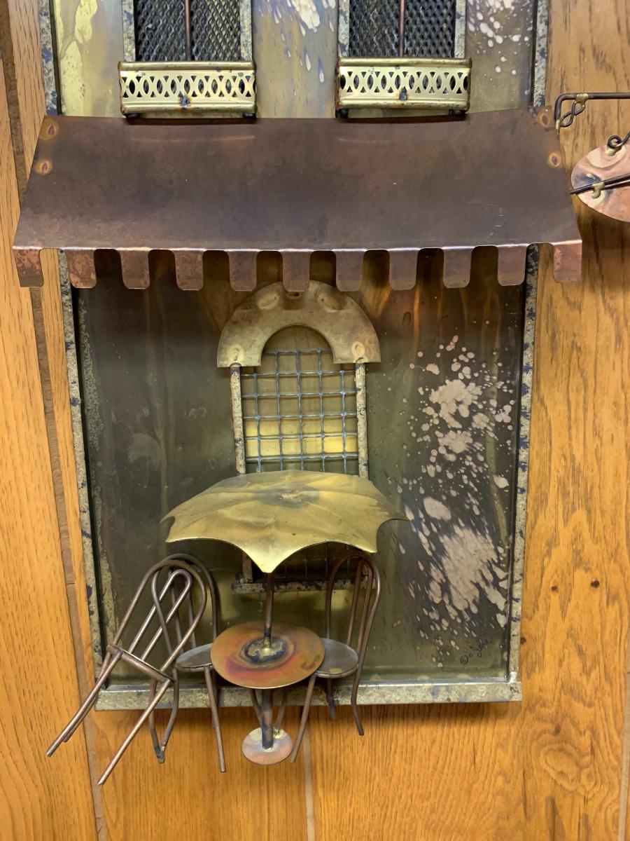 The piece is made of mixed metals, torch cut, brass, copper, wire, steel. It measures 35" in height by 14.5" in width.