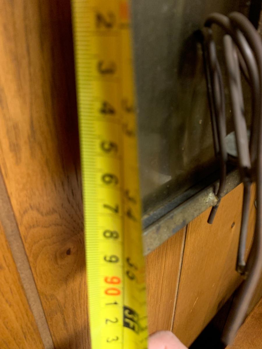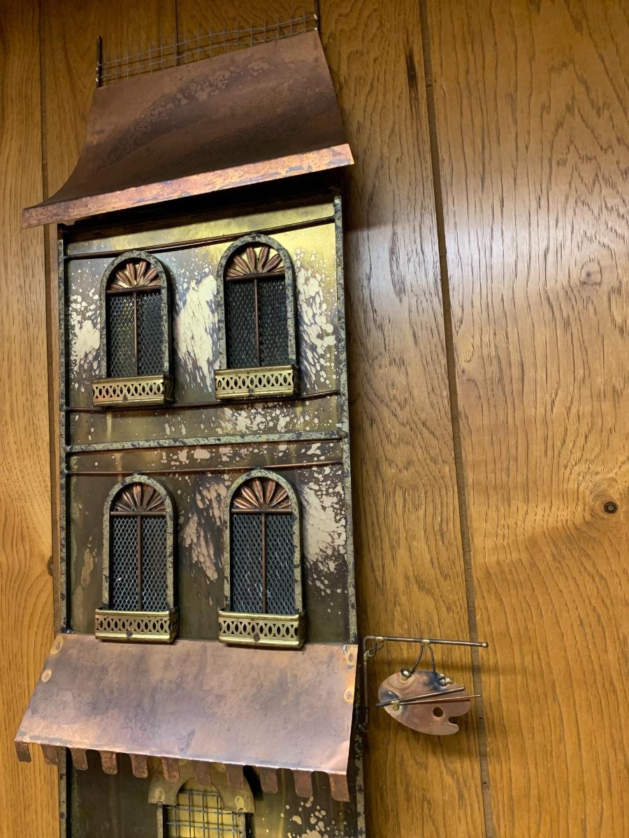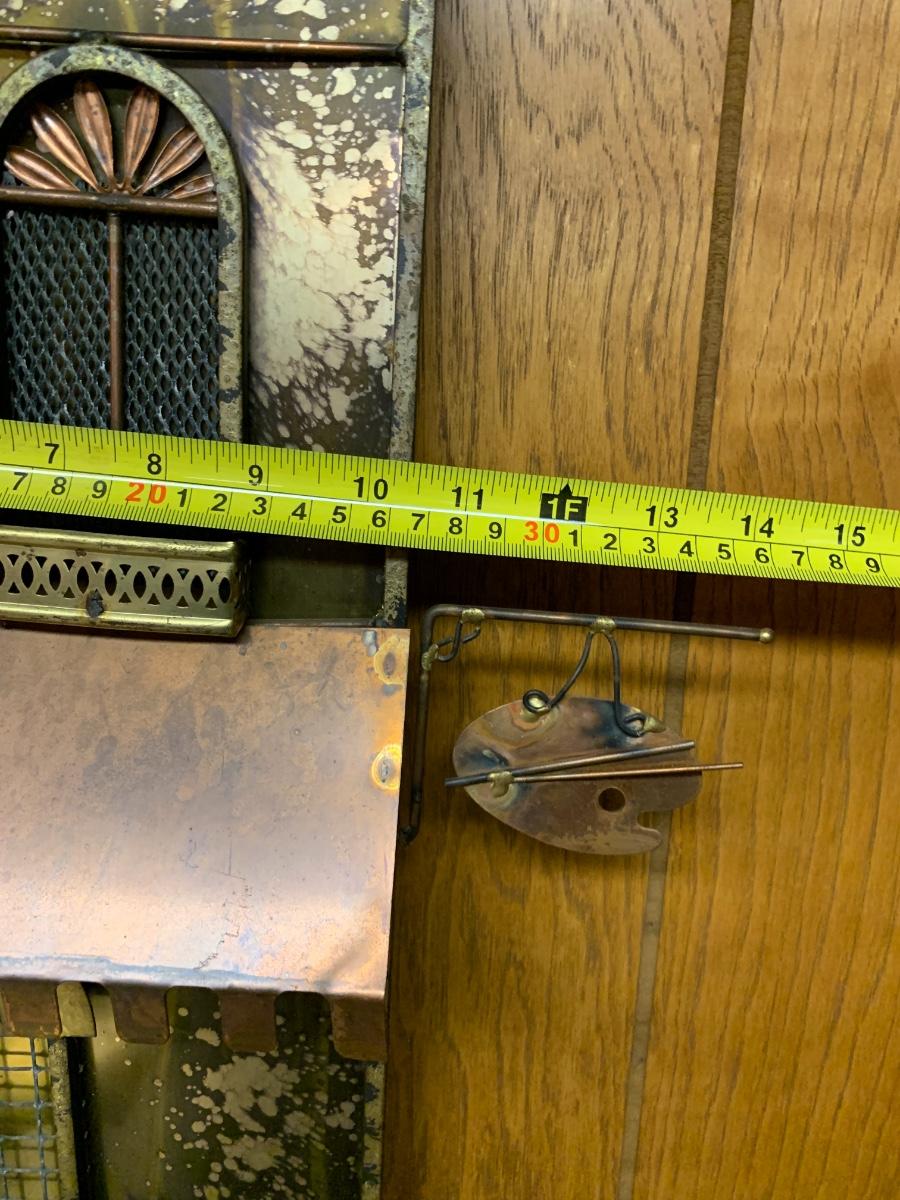 The piece is made of mixed metals, torch cut, brass, copper, wire, steel. It measures 35" in height by 14.5" in width.