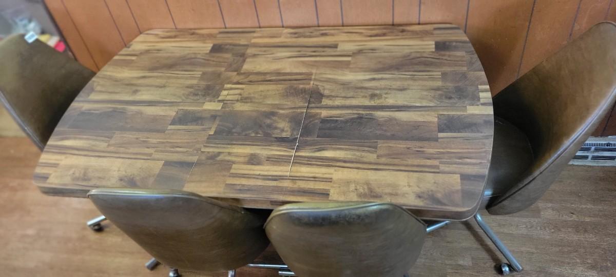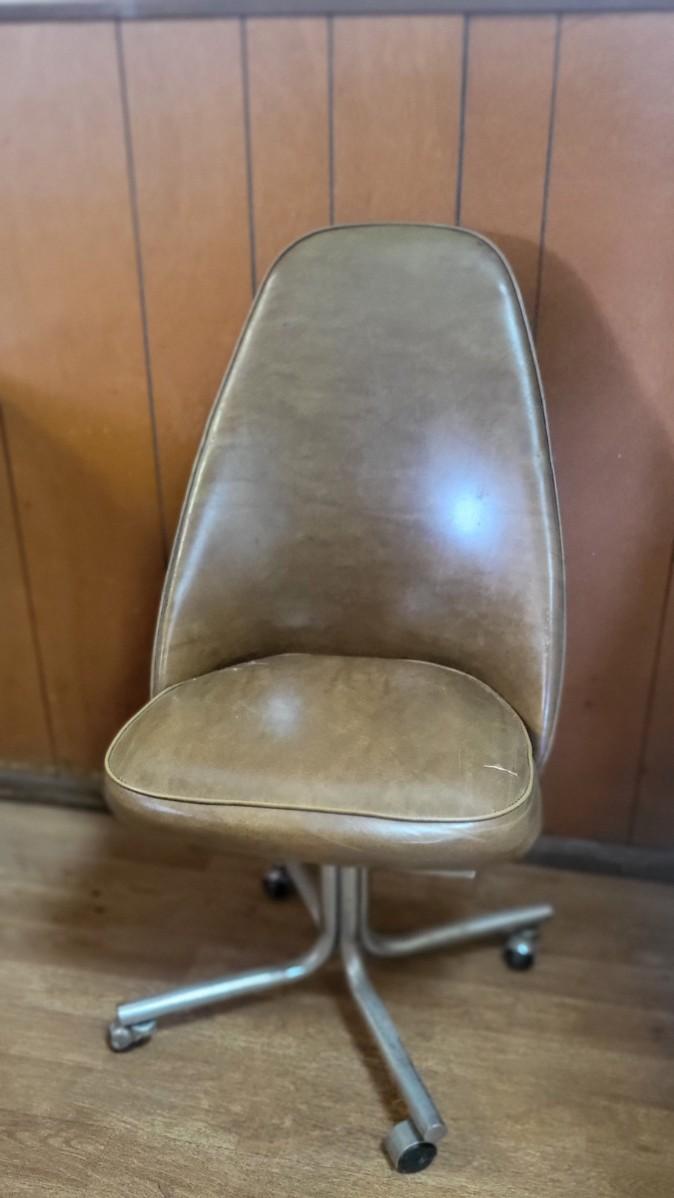 Table with 2 additional center leaves (1 shown in pic). 4 high back Rolling chairs. Photo of one chair is a photo showing the chair in the worst condition of the four