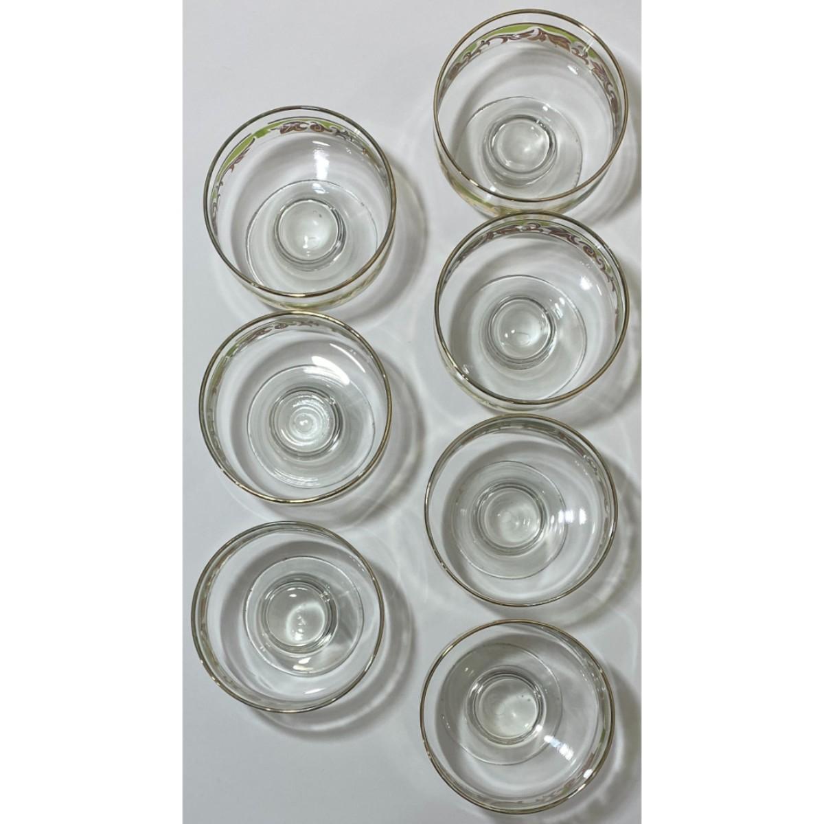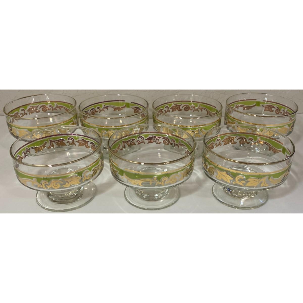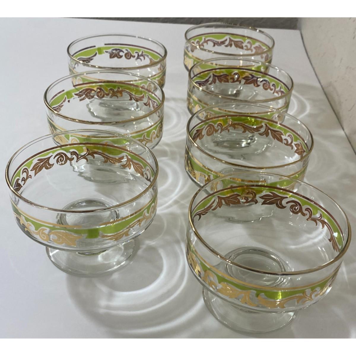 Vintage MCM Glass Green Gold Swirl Footed Pedestal Sherbet Dessert Bowl Set of 7