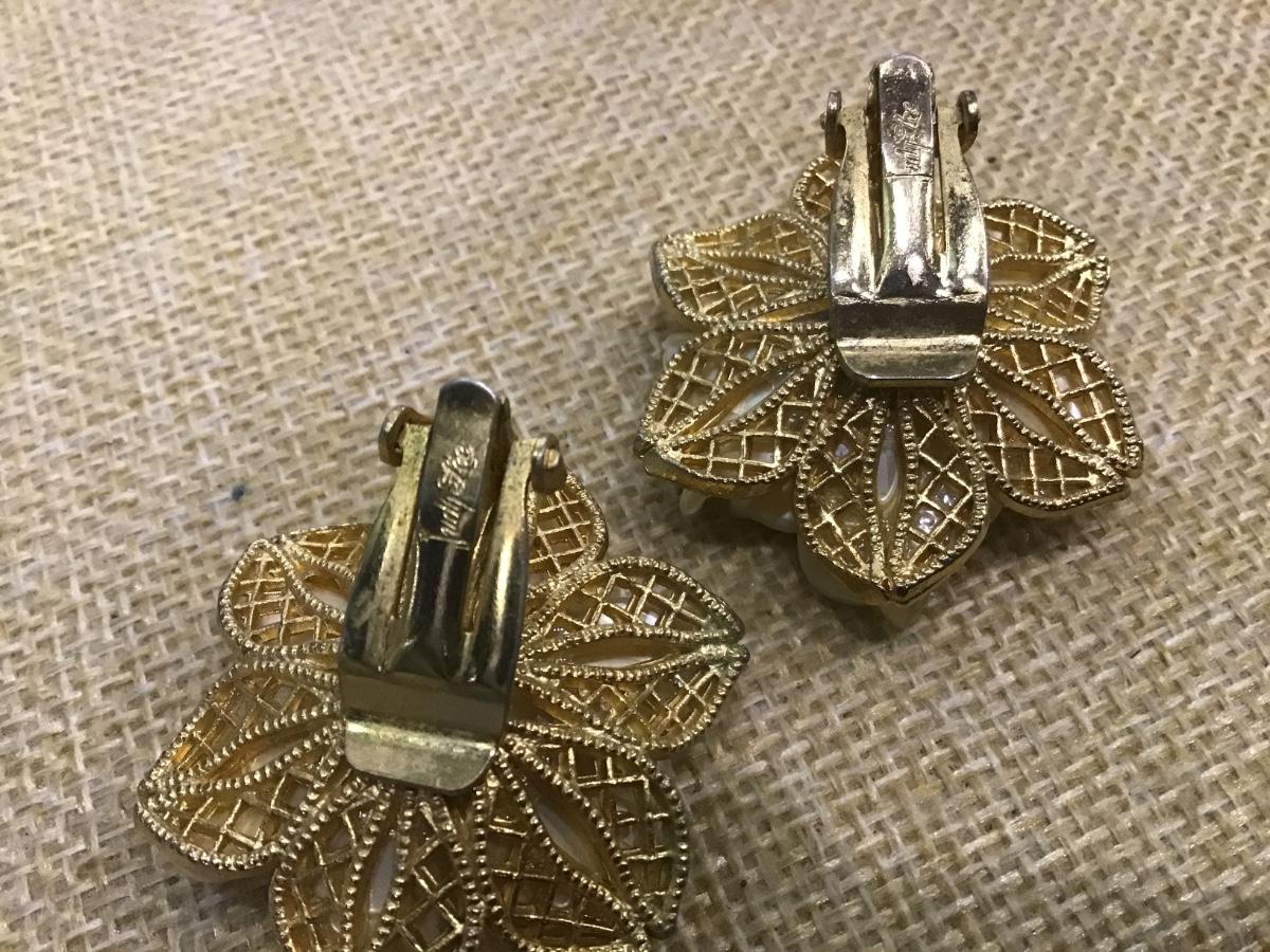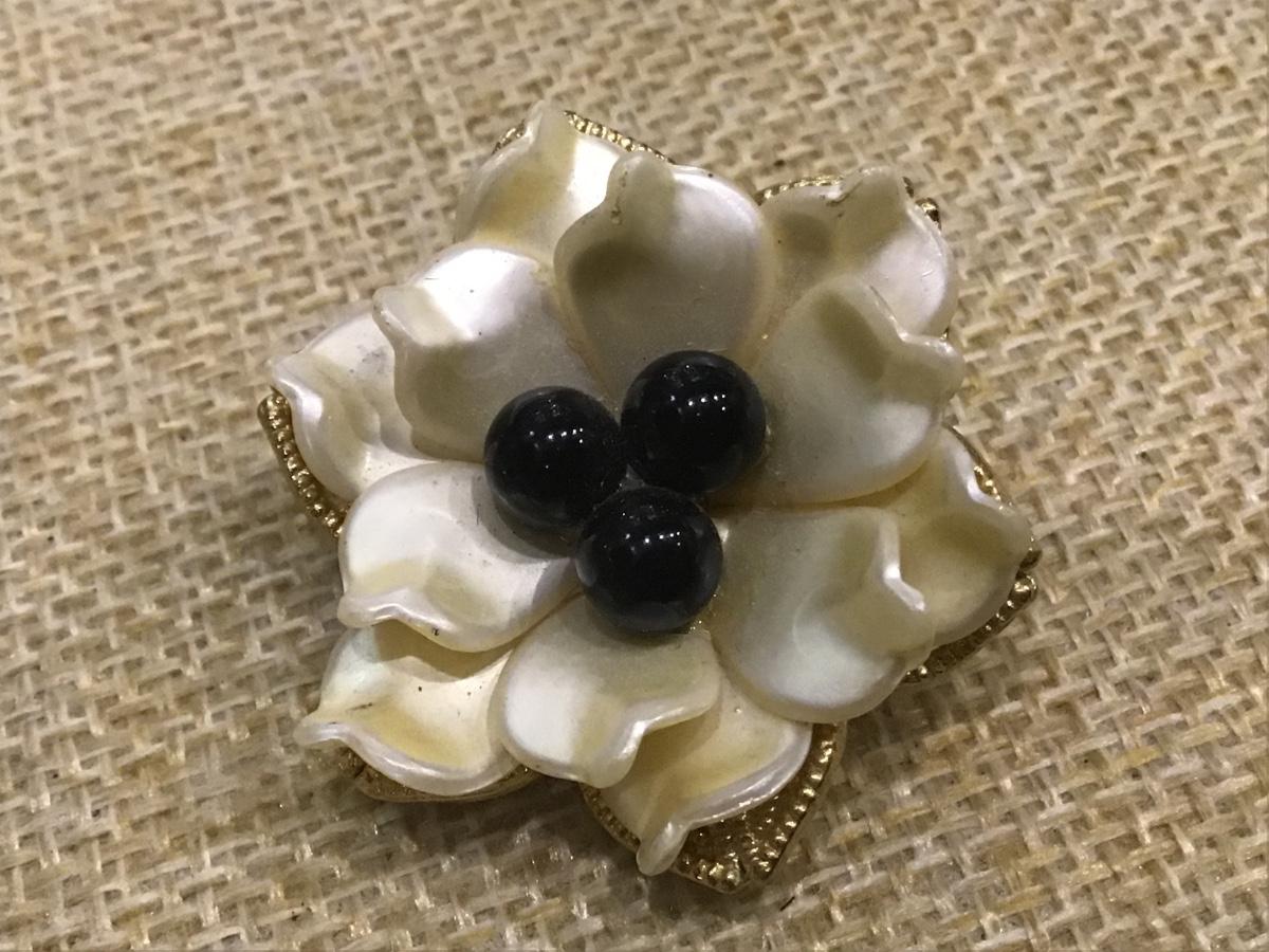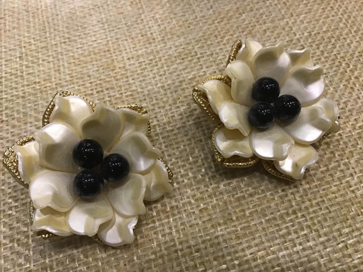 Vintage MCM JUDY LEE Cream Flower with 3 Black Beads Center Clip Earrings 1950s