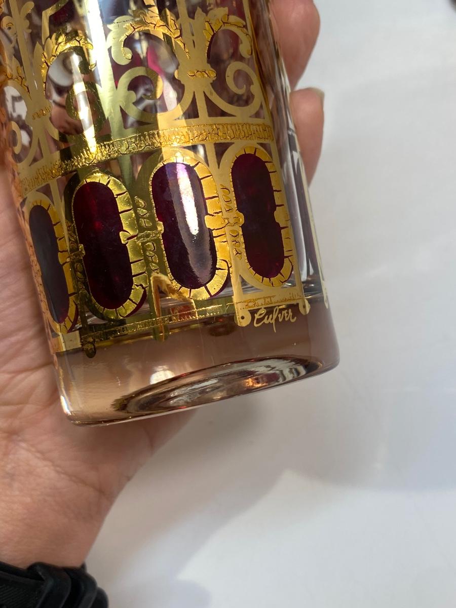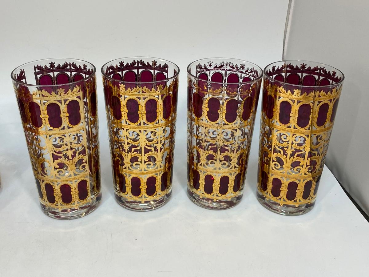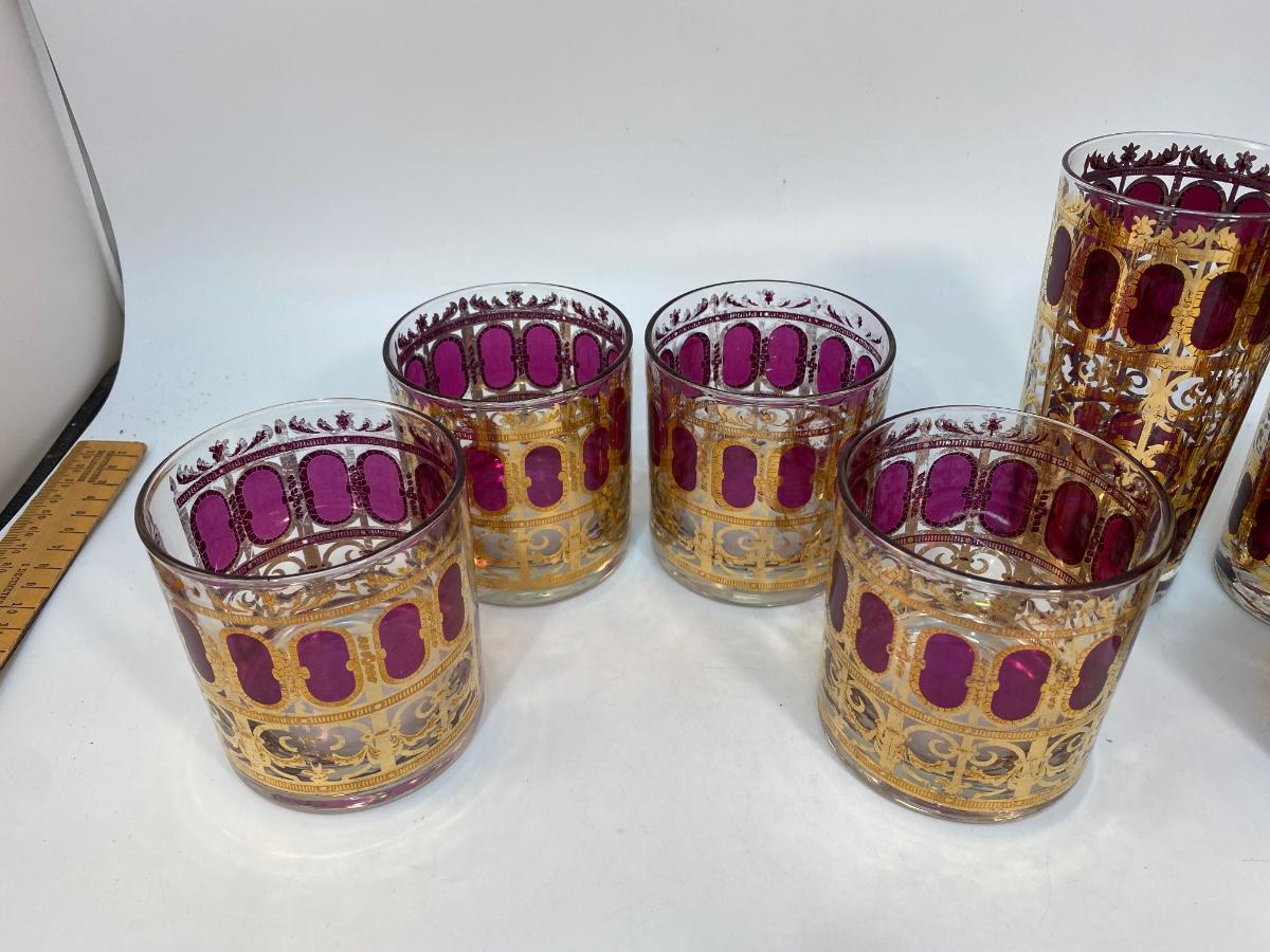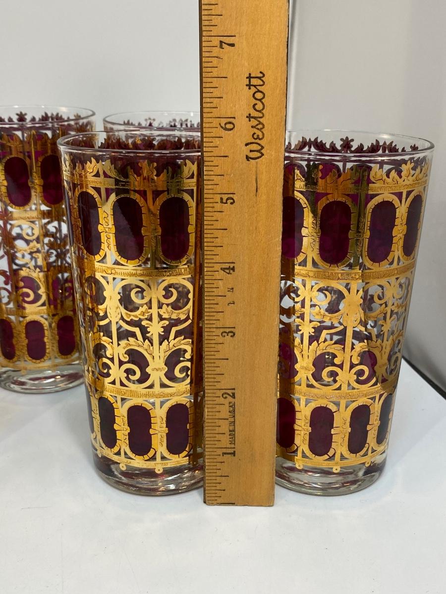 Vintage MCM Mid Century Culver Red & Gold Cranberry Scroll Drink Glass Set Highball Lowball Barware
